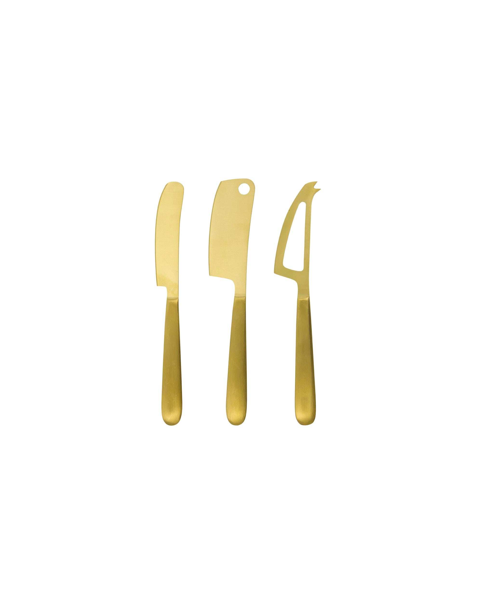 Élève ton plateau apéritif avec le Cheese kaasmessenset van House Doctor. Cet ensemble de trois élégants couteaux à fromage est non seulement pratique, mais aussi un vrai plaisir pour les yeux grâce à sa finition dorée luxueuse. Chaque couteau est conçu pour un type de fromage différent, afin que tu puisses servir aussi bien un brie fondant qu'un vieux fromage à pâte dure, facilement et avec style.