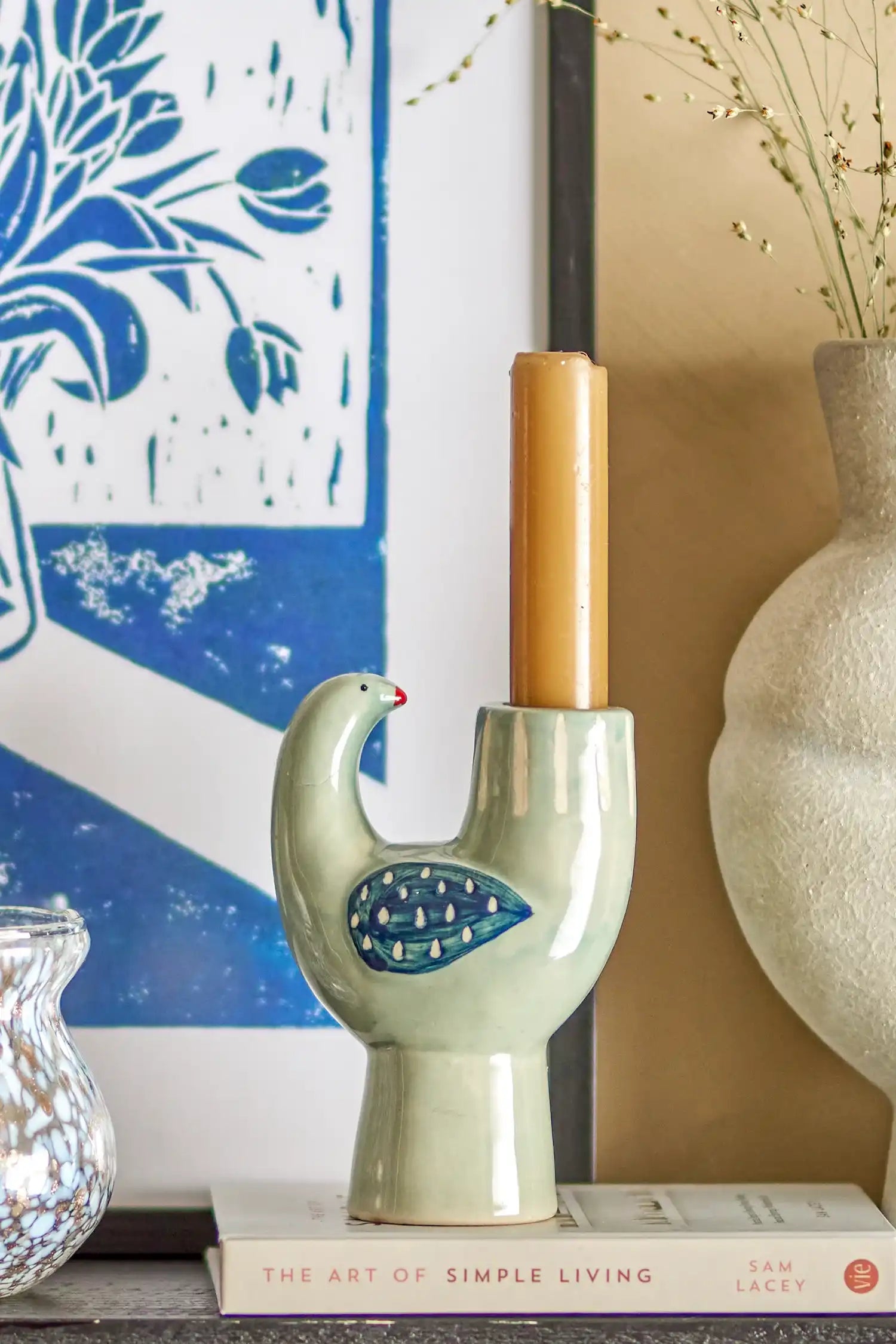 Détails & matériau : Le bougeoir est fabriqué en grès robuste et fini avec une magnifique teinte bleue qui, grâce à la peinture à la main, est toujours légèrement différente. Avec son format compact de 12,5 cm de haut et 6 cm de large, il trouve facilement sa place sur une table, une étagère ou un rebord de fenêtre, et reste beau pendant des années grâce à son émaillage de haute qualité.