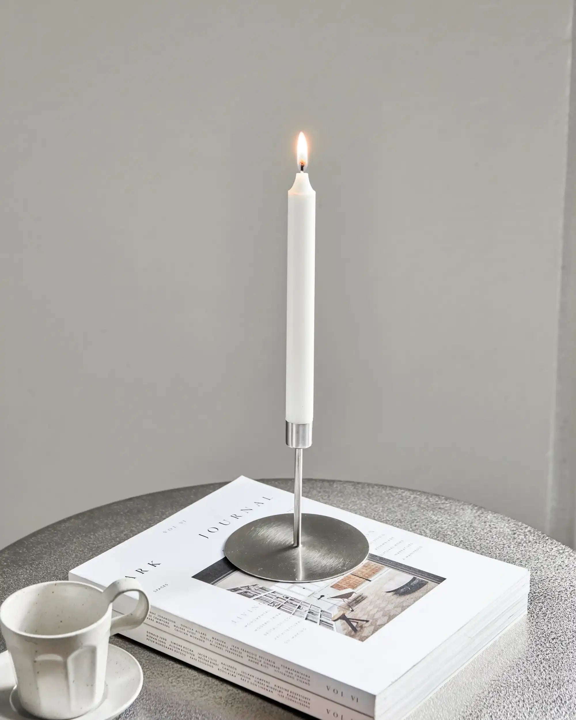 Ce bougeoir est fabriqué en métal et possède une finition argentée brillante sans être trop présente. Avec une hauteur de 12 cm et un diamètre de 13 cm, il s’intègre facilement dans différents styles, du moderne à l’industriel. Le fer solide lui confère un caractère intemporel avec une touche brute subtile.