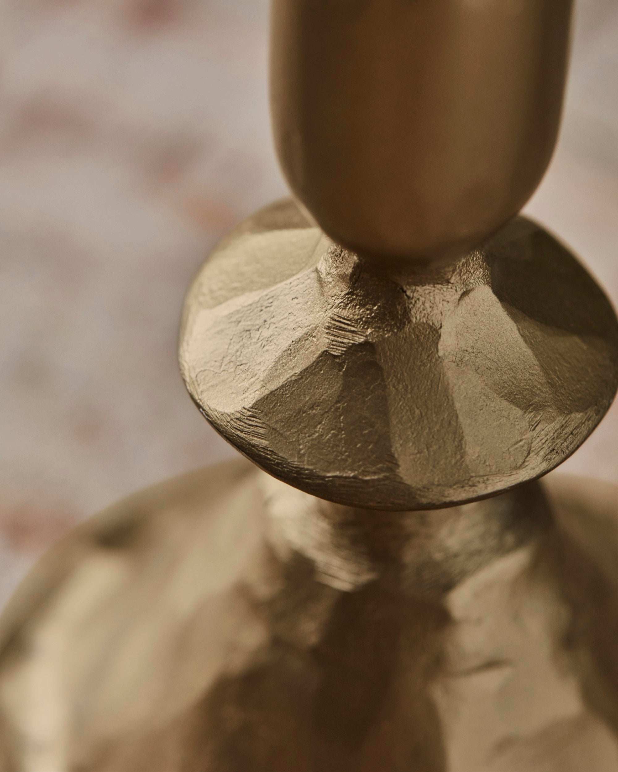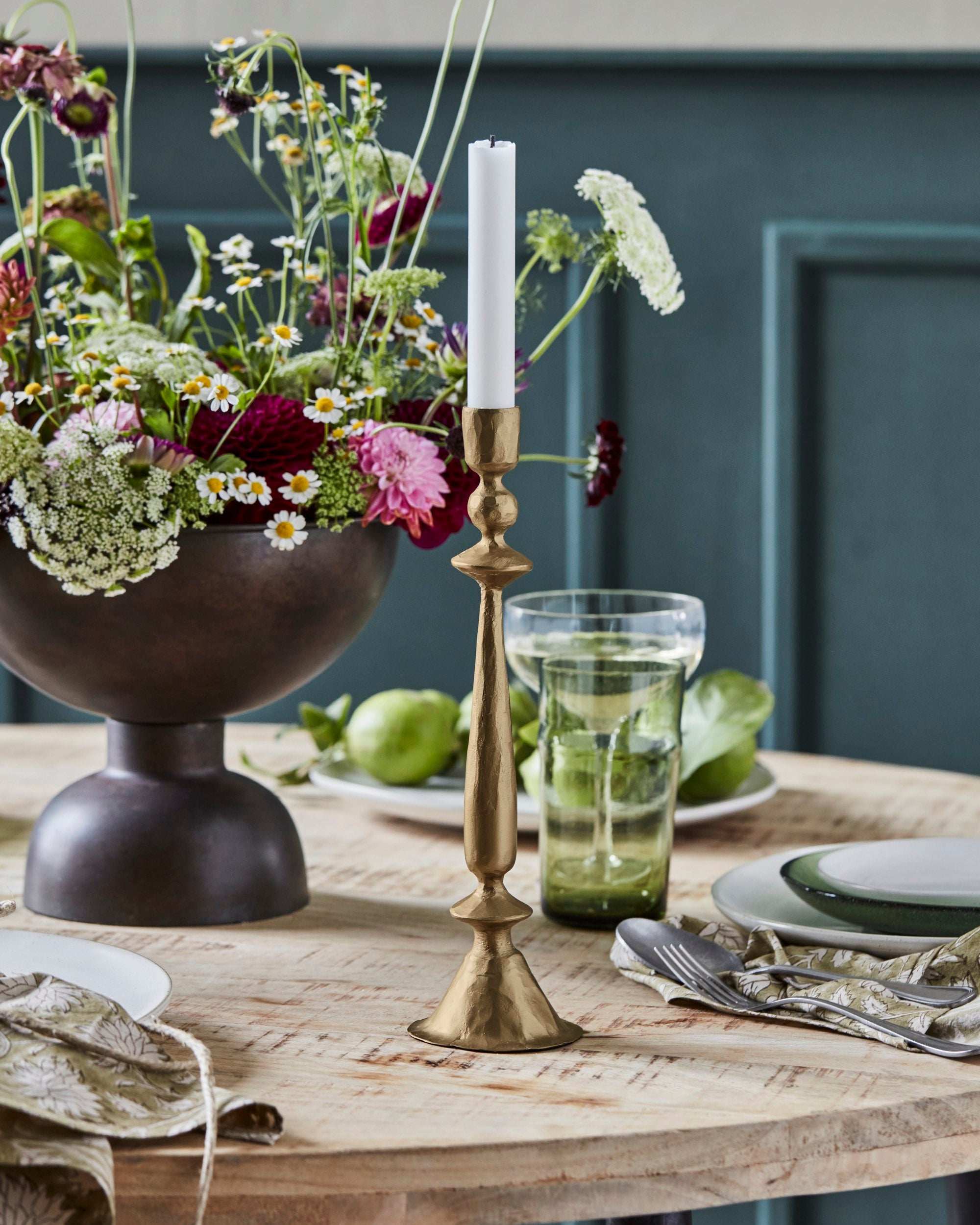 Apporte chaleur, élégance et une touche de charme vintage à ton intérieur avec le bougeoir Lumi de House Doctor. Ce bougeoir raffiné de 30 cm de haut est fabriqué à la main en fer et présente une finition dorée antique riche. Sa structure subtilement martelée rend chaque pièce unique, aucun bougeoir n'est donc exactement identique.