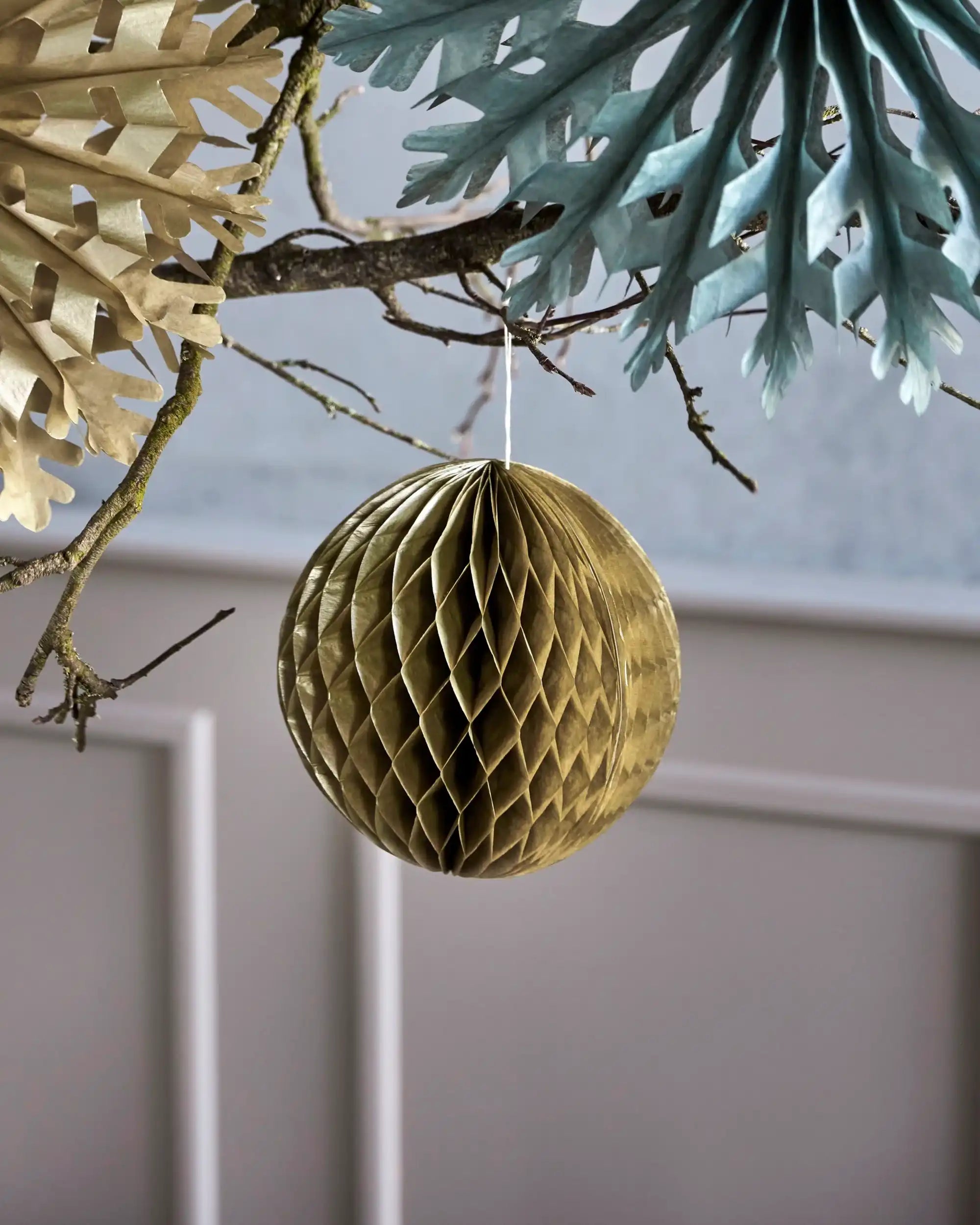Les trois ornements sont fabriqués à la main à partir de papier épais, ce qui leur confère une forme subtilement différente — chaque pièce est unique. Leur teinte dorée chaleureuse s'intègre facilement à tous les styles de Noël, du minimaliste au classique. Chaque ornement a un diamètre de 20 cm, ce qui en fait de véritables accroche-regards dans ton intérieur.