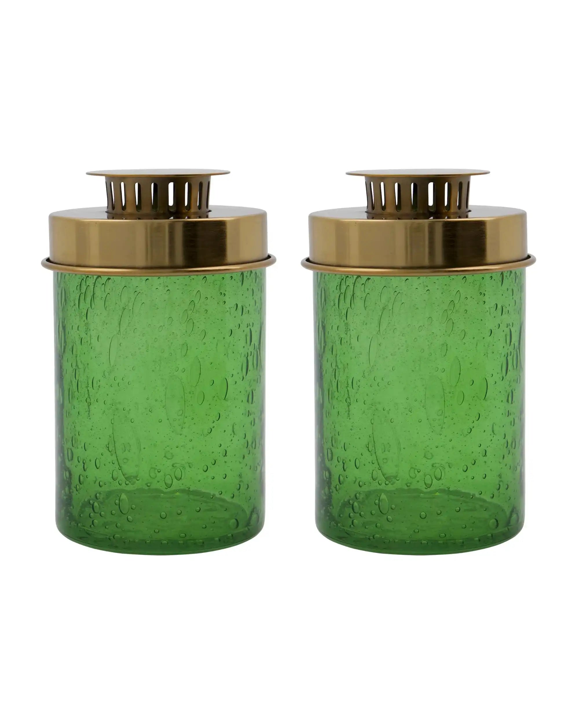 Apporte instantanément chaleur et ambiance à la maison avec la Lanterne Omay de House Doctor. Cet ensemble de deux photophores soufflés à la bouche attire tous les regards grâce au verre à bulles vert et au couvercle en fer couleur laiton subtilement brillant. Grâce au procédé artisanal unique, chaque photophore est légèrement différent, ce qui apporte une touche personnelle et raffinée à ton intérieur.