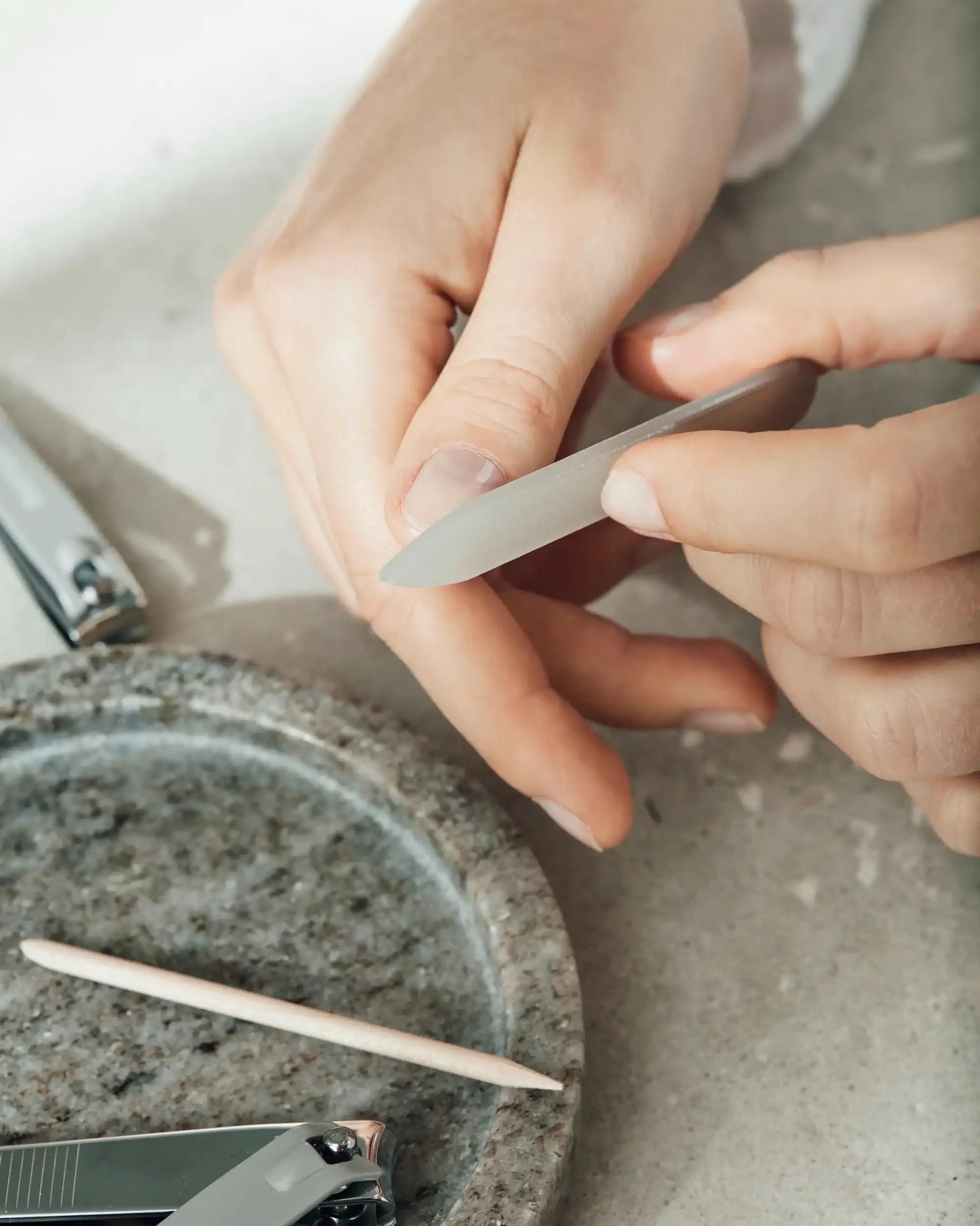 Commence par le repousse-cuticules pour repousser délicatement tes cuticules. Coupe tes ongles à la bonne longueur avec le coupe-ongles adapté, puis lime-les parfaitement avec la lime en verre. Hydrate tes mains après pour un résultat parfaitement soigné.