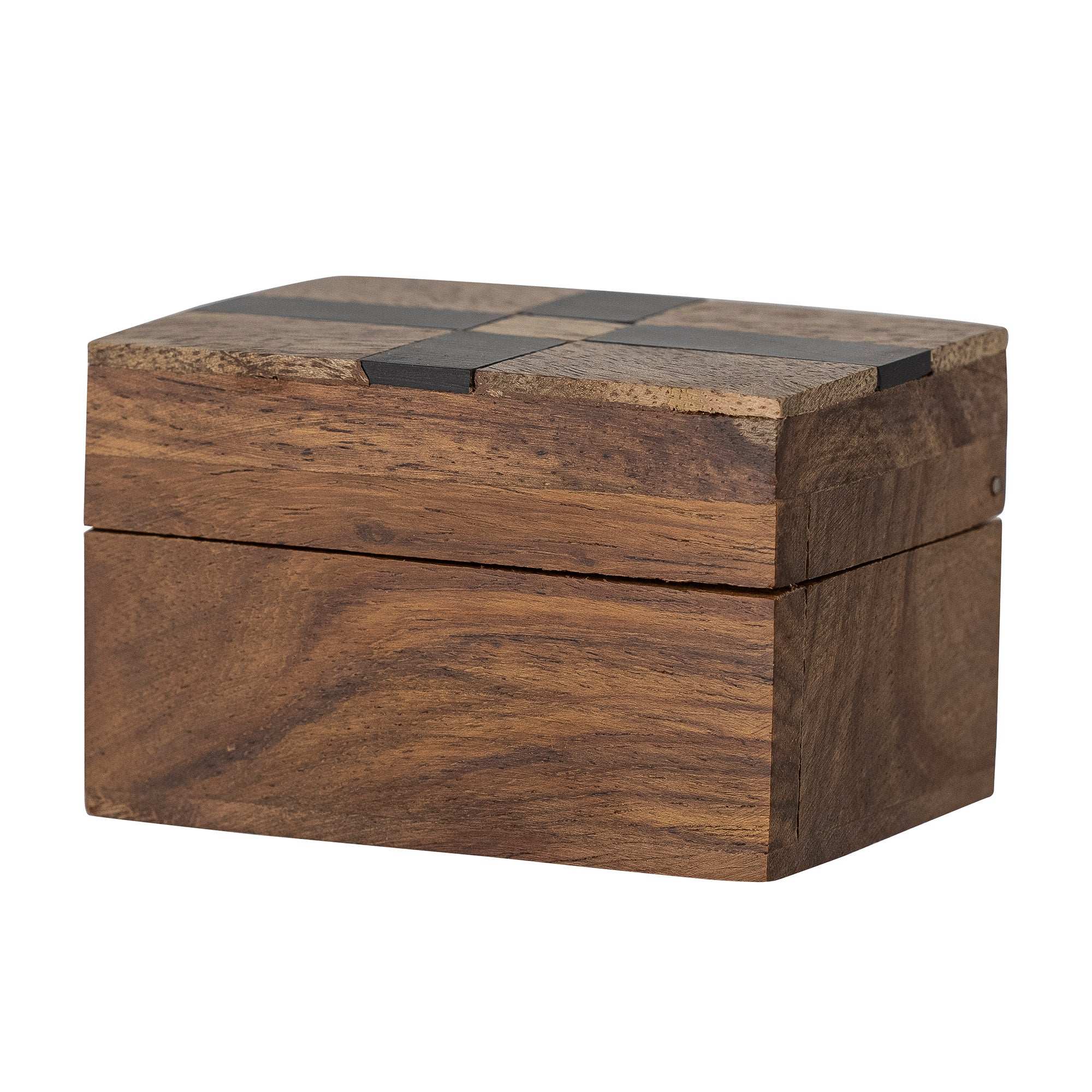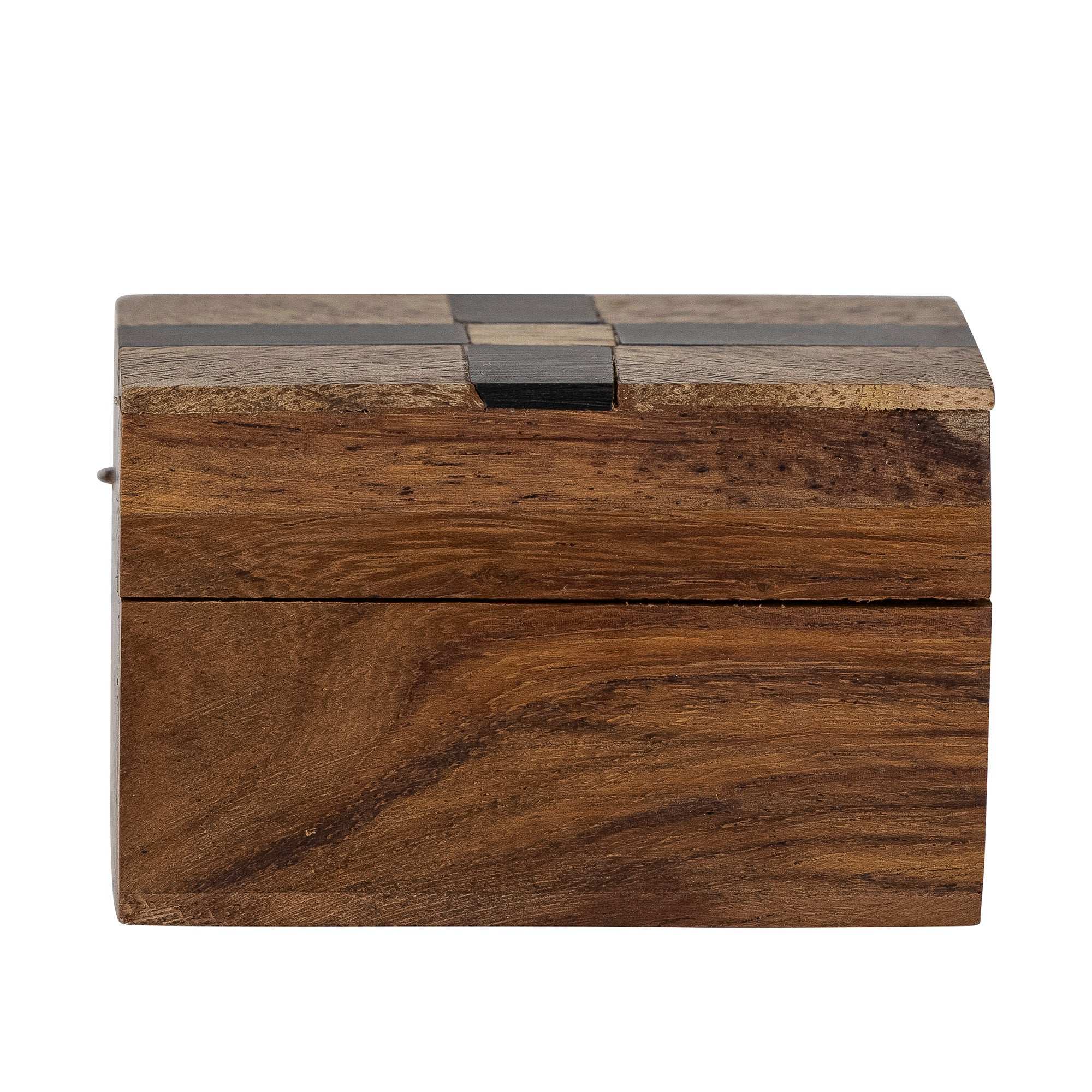 Détails & matériau : La boîte de rangement Cemile est fabriquée en bois de manguier foncé et dotée d’un couvercle sculpté à la main, ce qui rend chaque pièce unique. Grâce à son format compact (4,5 x 4 x 6,5 cm), elle est idéale pour ranger tes bijoux, clés ou autres petits objets avec style.