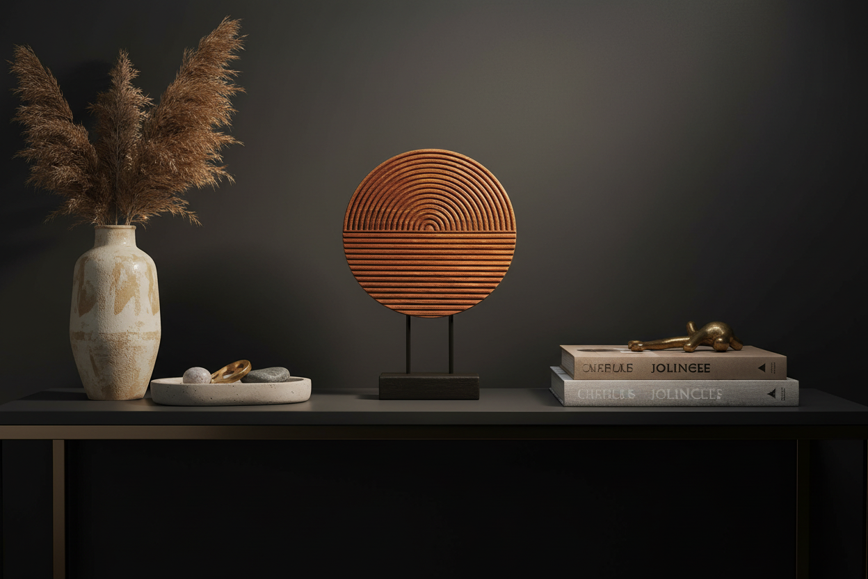 Associe cet ornement à d'autres éléments naturels comme des plantes, des pierres ou des bougies pour une ambiance apaisante. Place-le sur un buffet ou une table d'appoint avec des accessoires neutres pour mettre en valeur la teinte chaude du bois. Pour une présentation élégante dans l'entrée, tu peux combiner l'ornement avec un miroir ou un petit vase. L'ornement trouve aussi parfaitement sa place sur une étagère ou dans une bibliothèque ouverte, où ses détails uniques sont pleinement mis en avant.