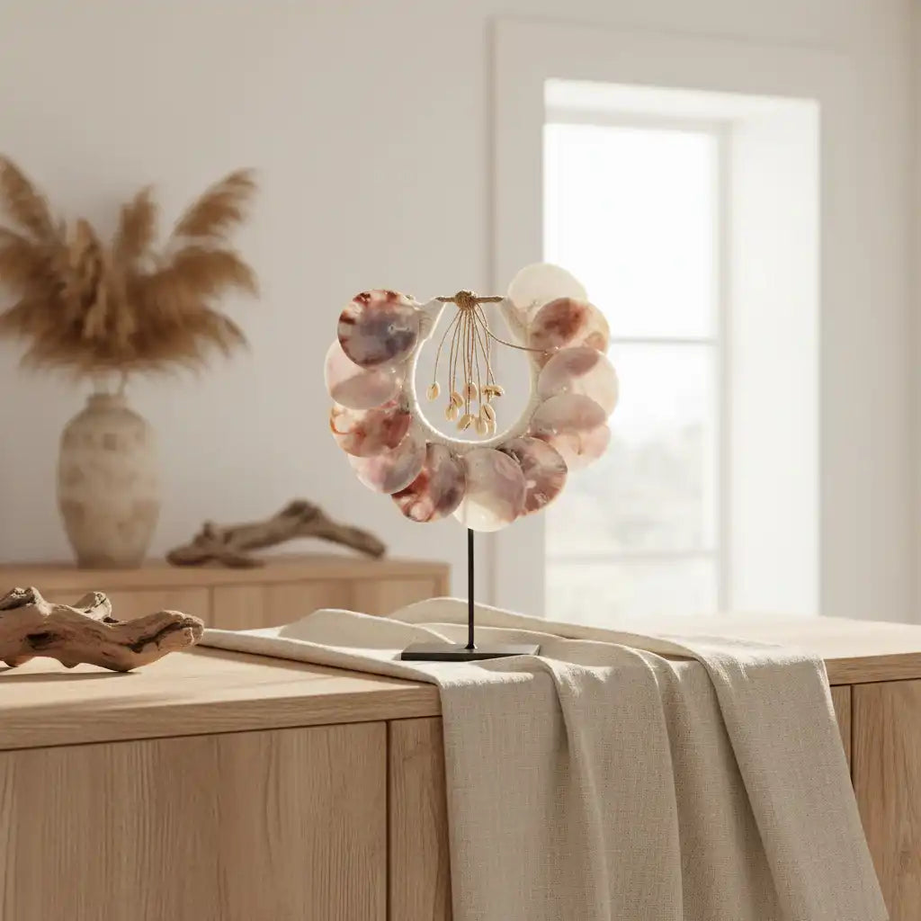 Grâce à son format compact, ce collier de coquillages se marie facilement avec d’autres accessoires pour la maison. Les teintes douces et naturelles apportent une ambiance chaleureuse et s’intègrent parfaitement dans un intérieur bohème, côtier ou scandinave.