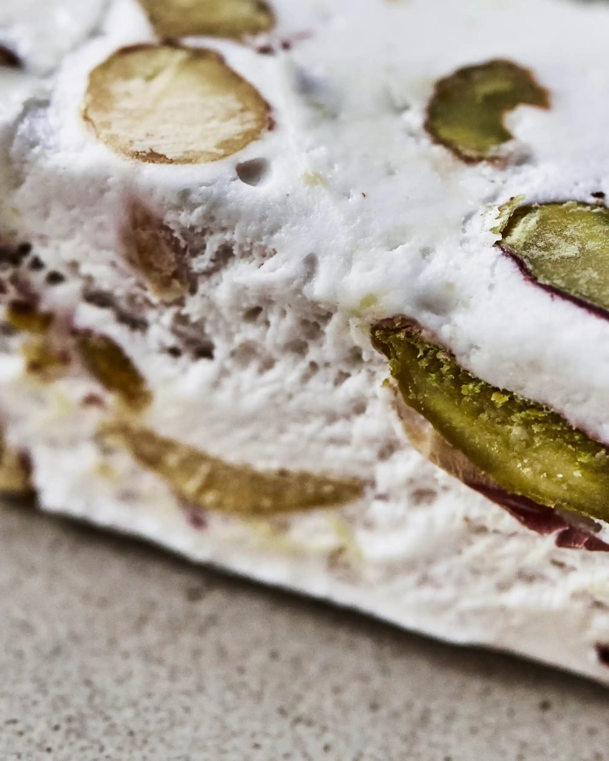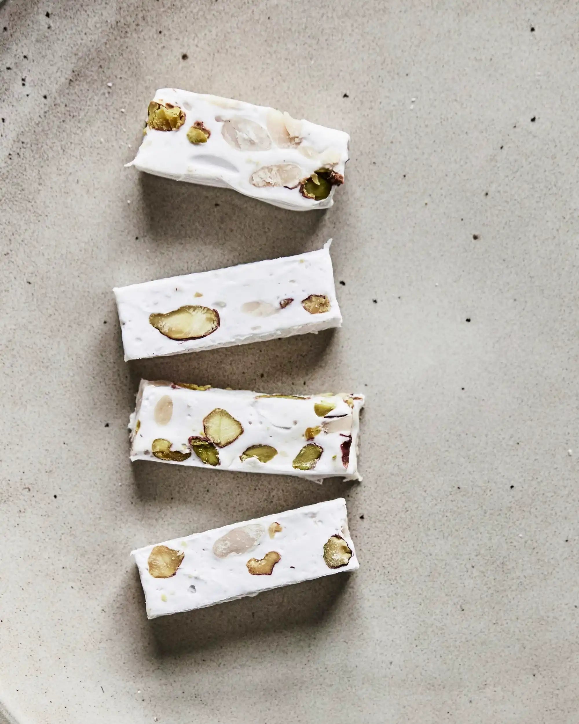 Coupez le nougat en petits cubes et servez-le sur un plateau en marbre, accompagné d’un espresso ou d’un vin doux. Pour une touche supplémentaire, ajoutez quelques pistaches entières pour la couleur et la texture.