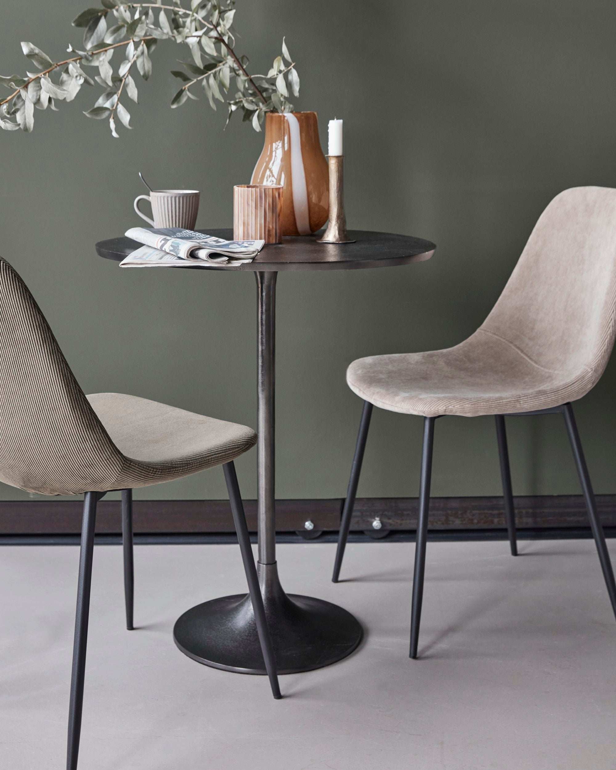 Tu cherches une table compacte avec du caractère ? La table Pan de House Doctor est une élégante table ronde d’un diamètre de 61 cm et d’une hauteur de 75 cm. Cette table est entièrement fabriquée en aluminium noir et présente une surface volontairement marquée de petites imperfections pour un look industriel audacieux et une texture subtile.