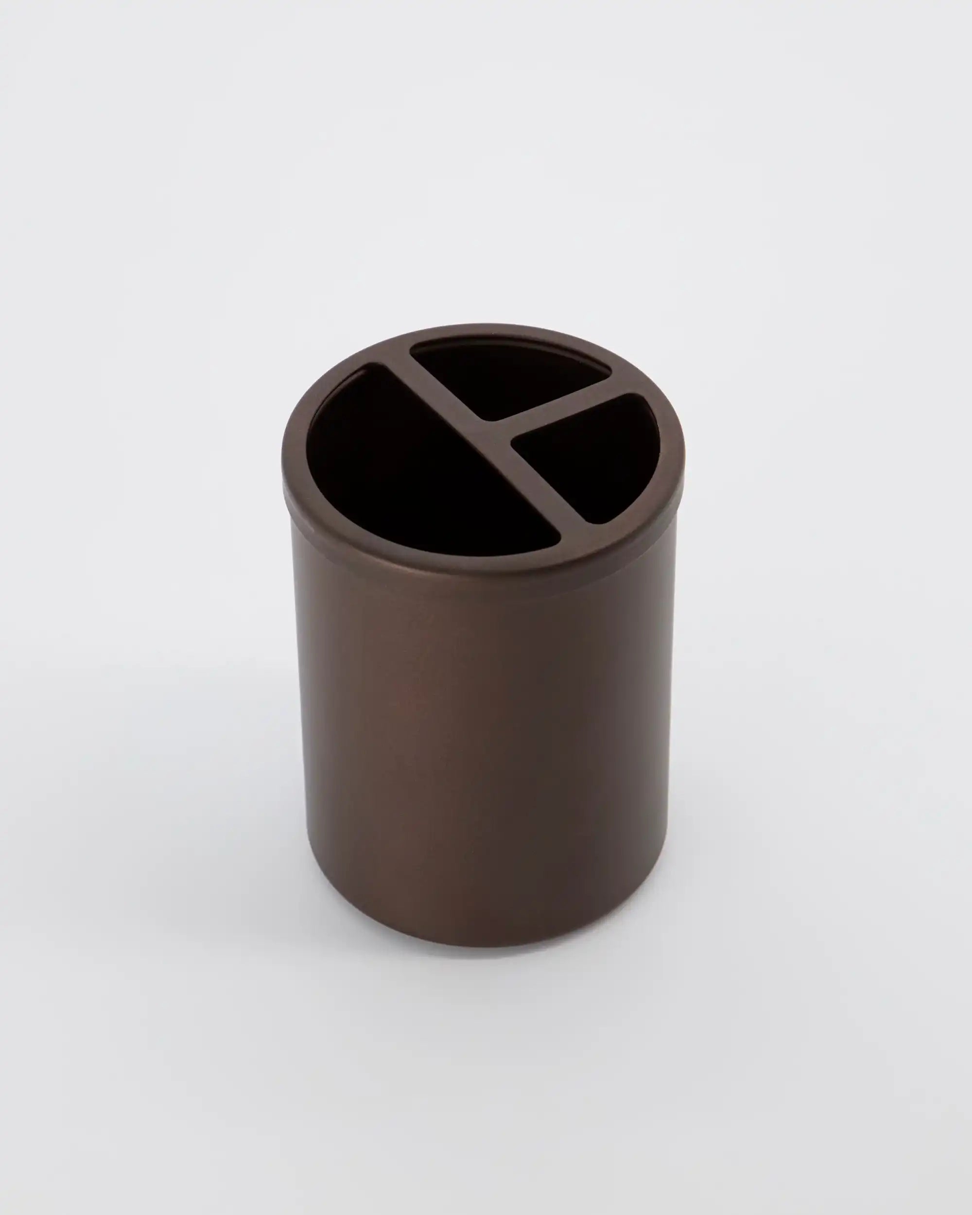 Le gobelet Bush est fabriqué en aluminium durable et présente une finition mate intemporelle dans une teinte brune. Grâce à son design astucieux à trois compartiments, tu gardes brosses à dents et dentifrice bien séparés et organisés. Le gobelet mesure 10,5 cm de haut et 7,9 cm de diamètre. Le couvercle se retire facilement, ce qui te permet de le nettoyer sans effort.