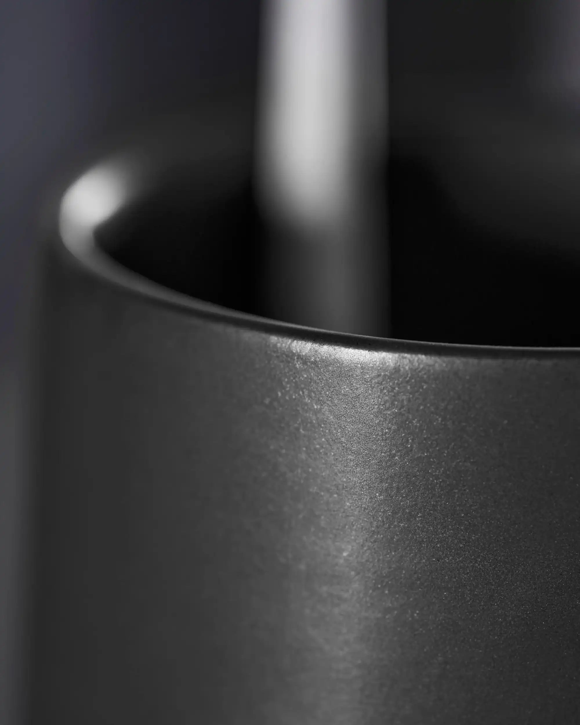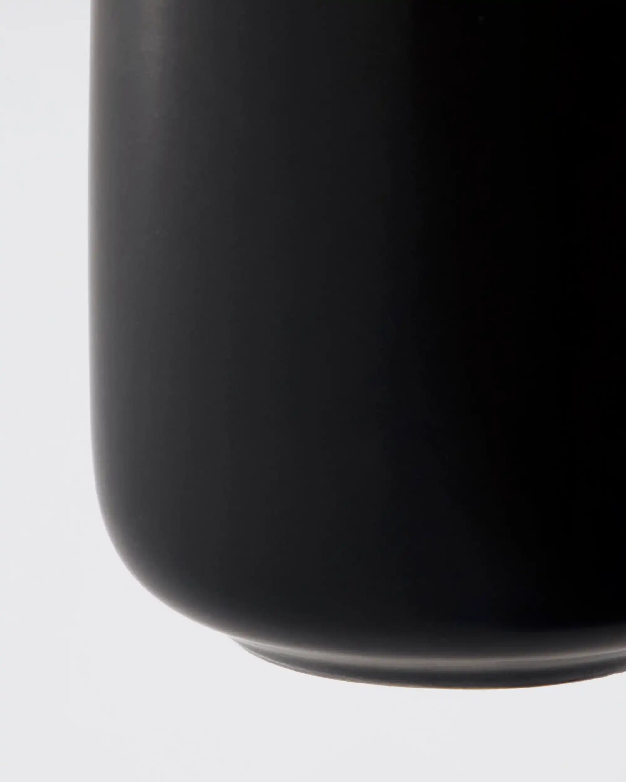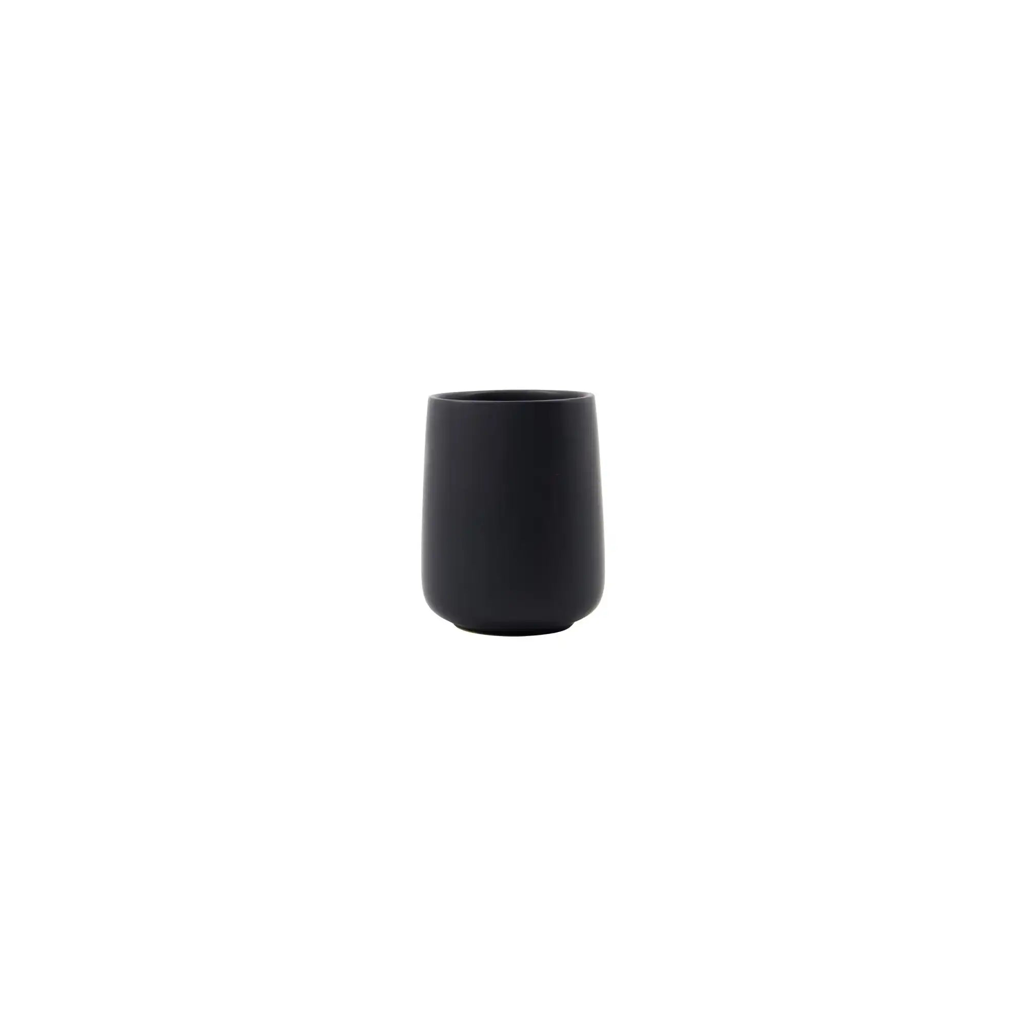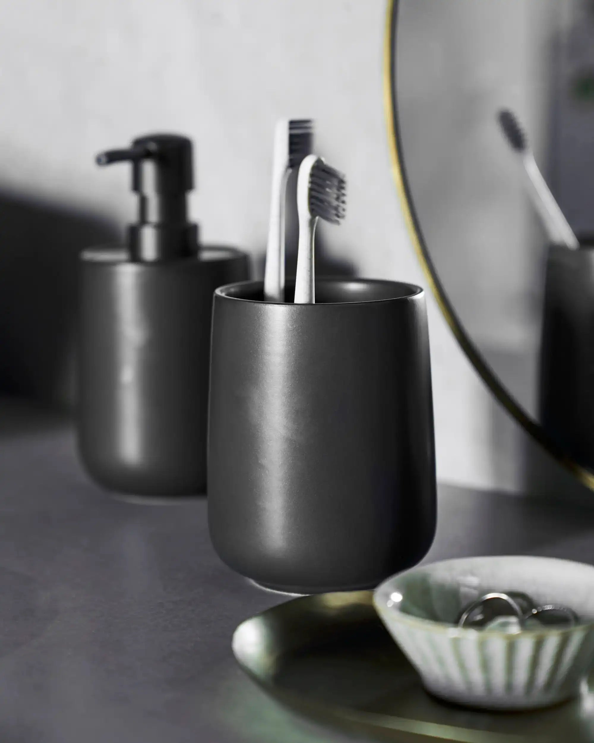 Ce gobelet est fabriqué en grès robuste et présente une finition noire mate qui s’intègre avec élégance dans tous les intérieurs. Avec une hauteur de 11 cm et un diamètre de 8,5 cm, il offre suffisamment d’espace pour, par exemple, votre brosse à dents ou vos pinceaux de maquillage. Fonctionnalité et design se rejoignent ici en toute simplicité.