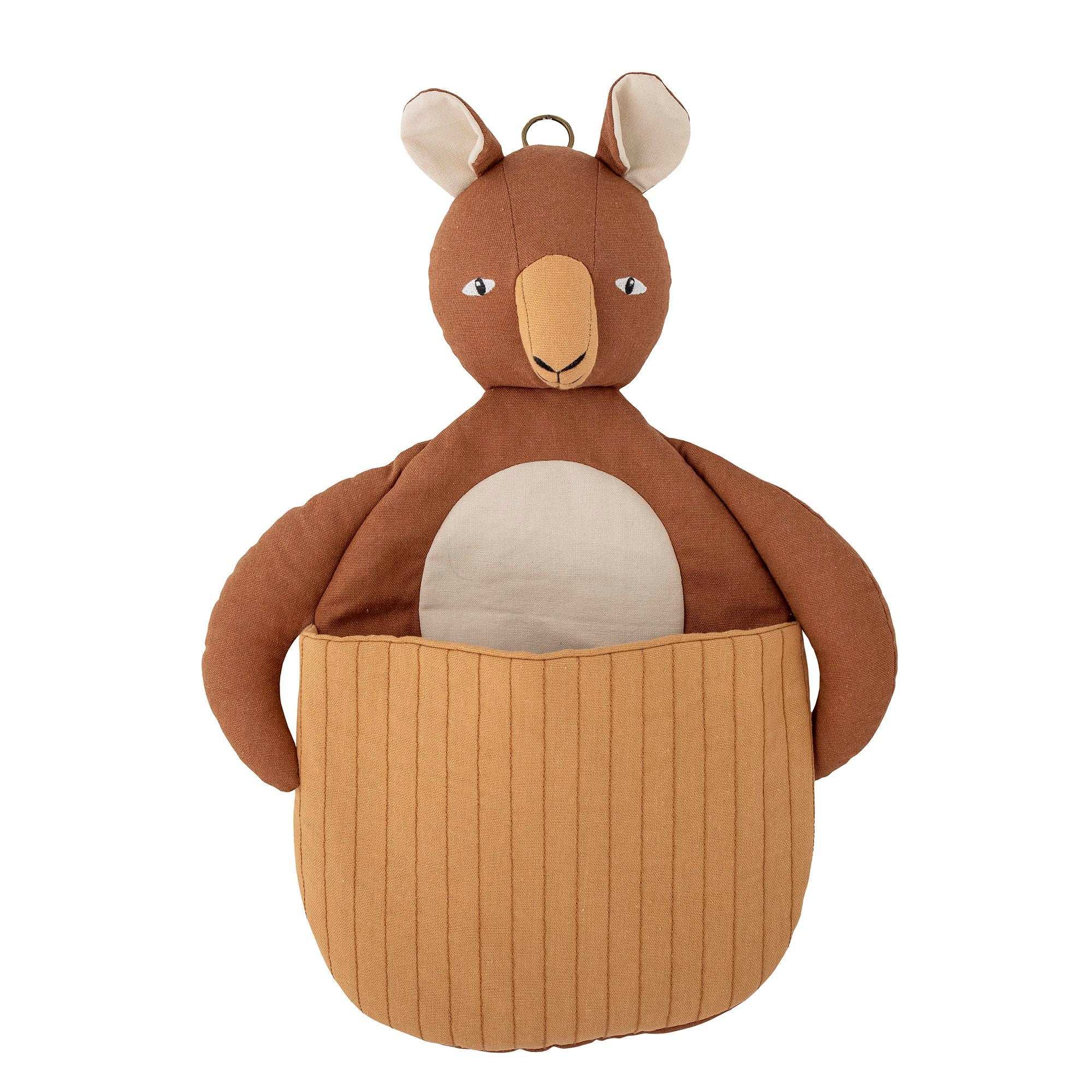 Détails & matériau : Ce panier mural est en lin dans une belle teinte brune. Il est tout doux au toucher et a un bel aspect. Les dimensions sont l × h × p 7,5 × 33 × 46 cm. La poche peut contenir de petites peluches, des petites voitures ou une figurine. La jolie tête de kangourou apporte un sourire sur le mur, et grâce à sa forme étroite, la pièce reste spacieuse et aérée. Un mélange astucieux de praticité et d’imagination.
