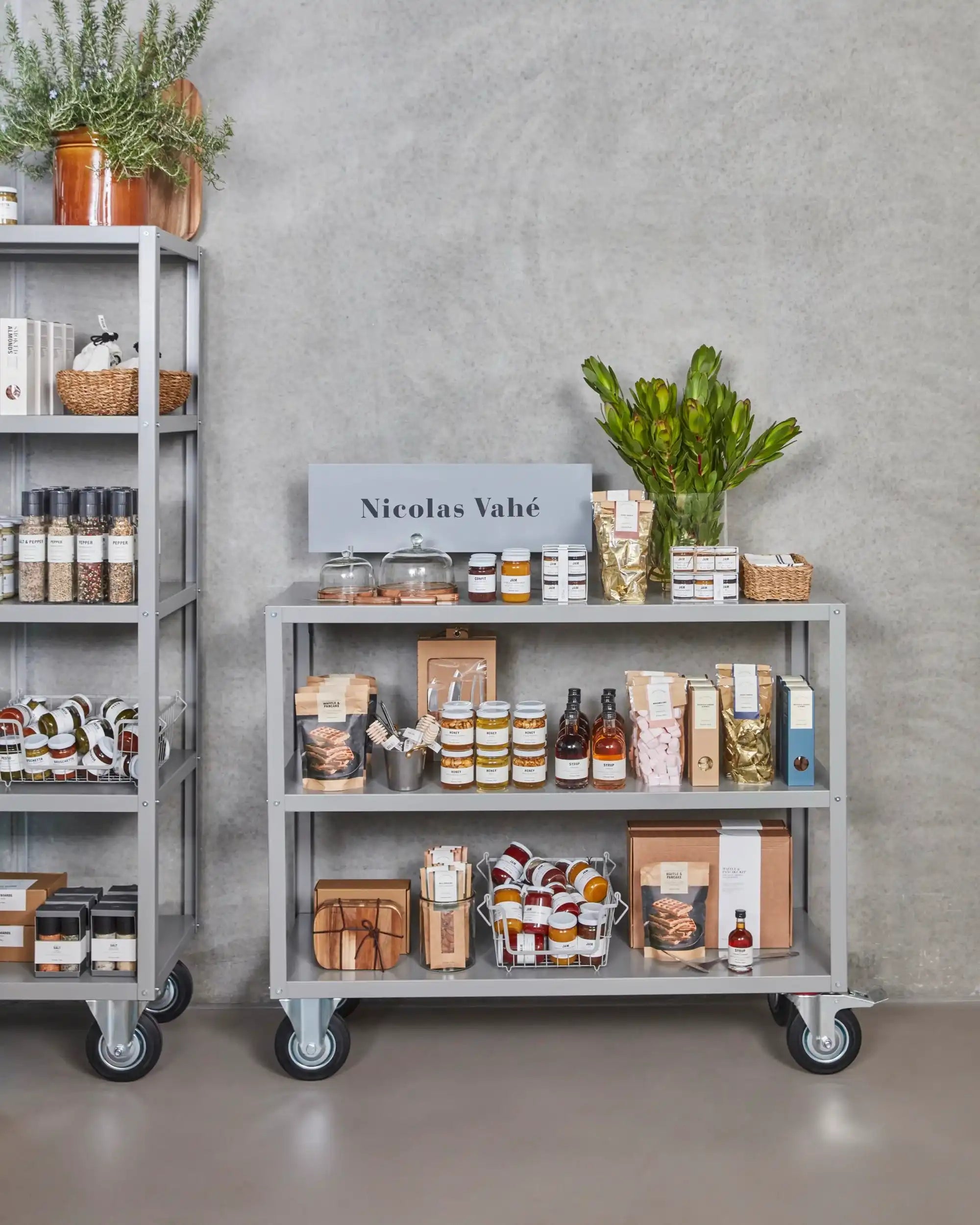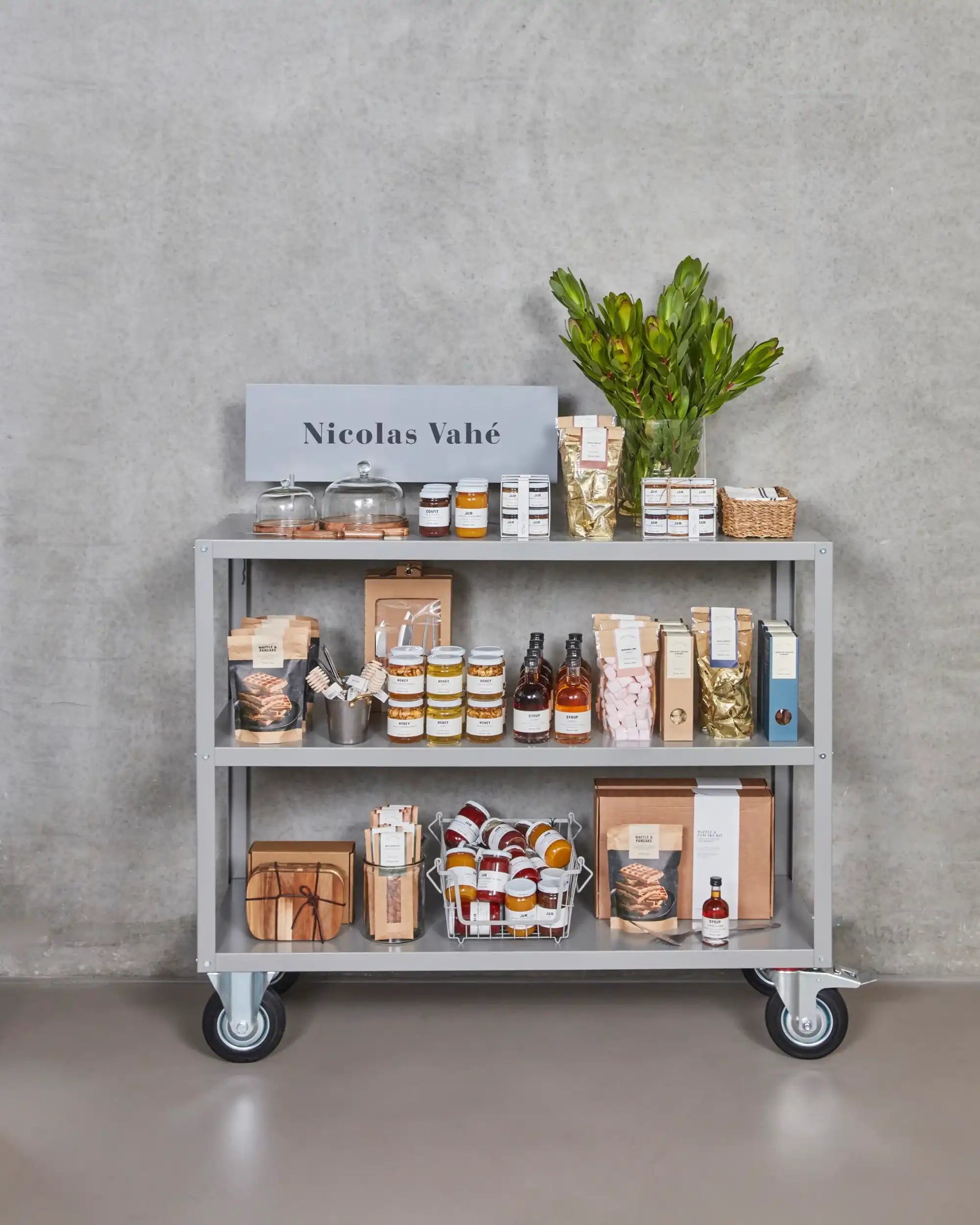 Le chariot est réalisé dans une teinte grise apaisante et équipé de trois étagères robustes. Avec des dimensions de 120 cm de long, 45 cm de large et 101 cm de haut, il offre suffisamment d'espace pour présenter ou ranger tes affaires de façon ordonnée. Les quatre roulettes facilitent le déplacement, pour que tu restes flexible dans ton aménagement. L'utilisation de matériaux industriels s'accorde parfaitement avec le style audacieux et fonctionnel de Nicolas Vahé.