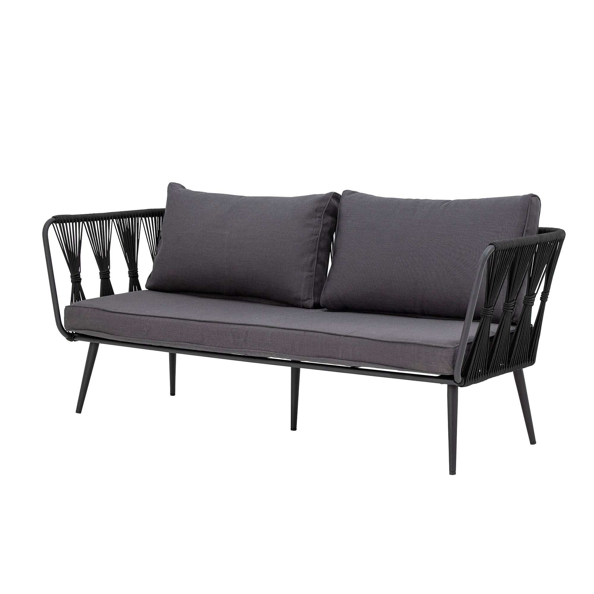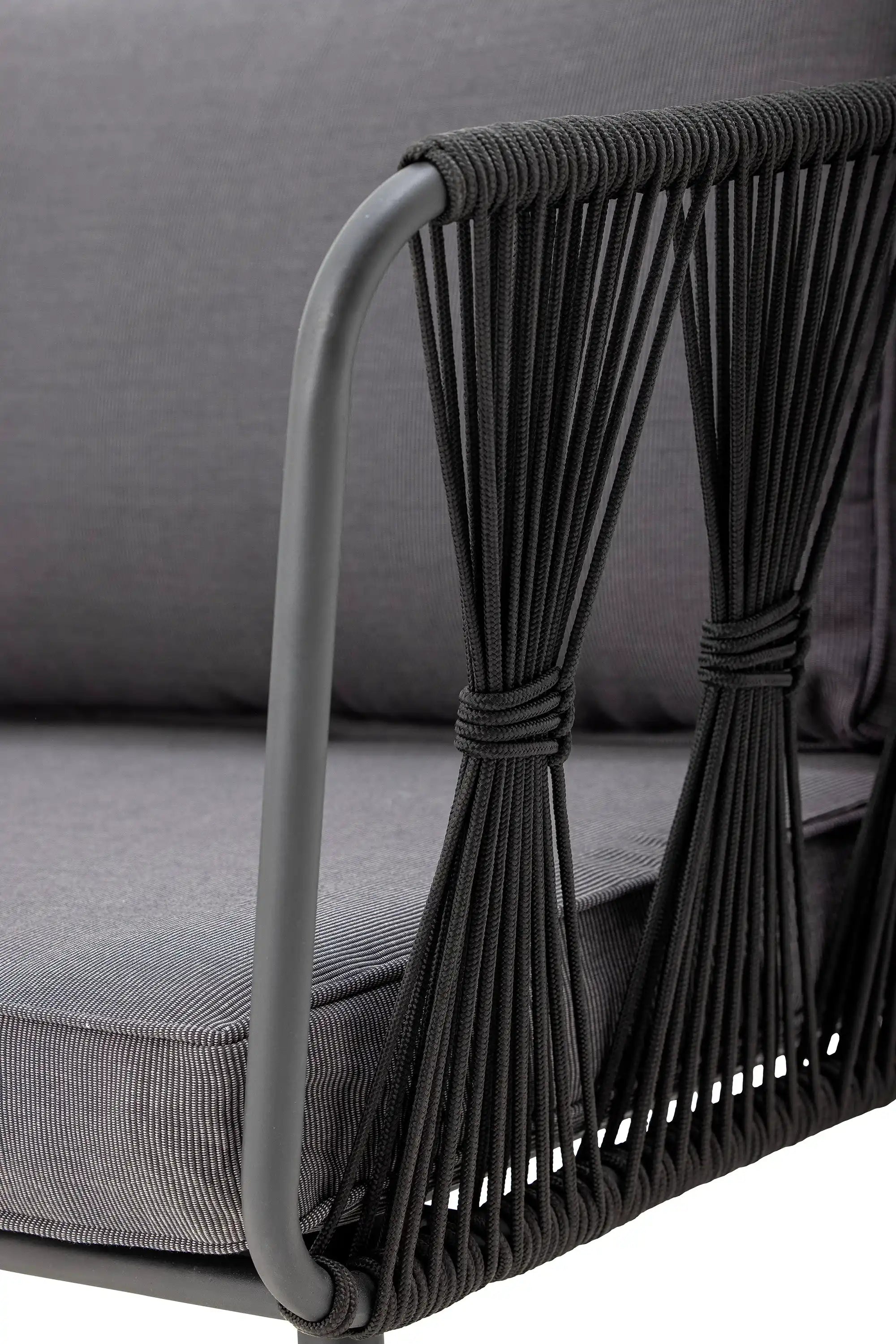 Matériaux & détails soigneusement sélectionnés : Le cadre robuste en métal thermolaqué, associé aux cordes en polyester noir tressées à la main, garantit une construction de haute qualité et résistante aux intempéries. Les coussins profonds gris foncé sont doux, déhoussables et faciles à laver à 30 degrés, pour que tu puisses profiter d’un confort extérieur pendant des années. Grâce à ses dimensions généreuses (174 x 68 x 72 cm), il y a toujours de la place pour se détendre seul ou à plusieurs.