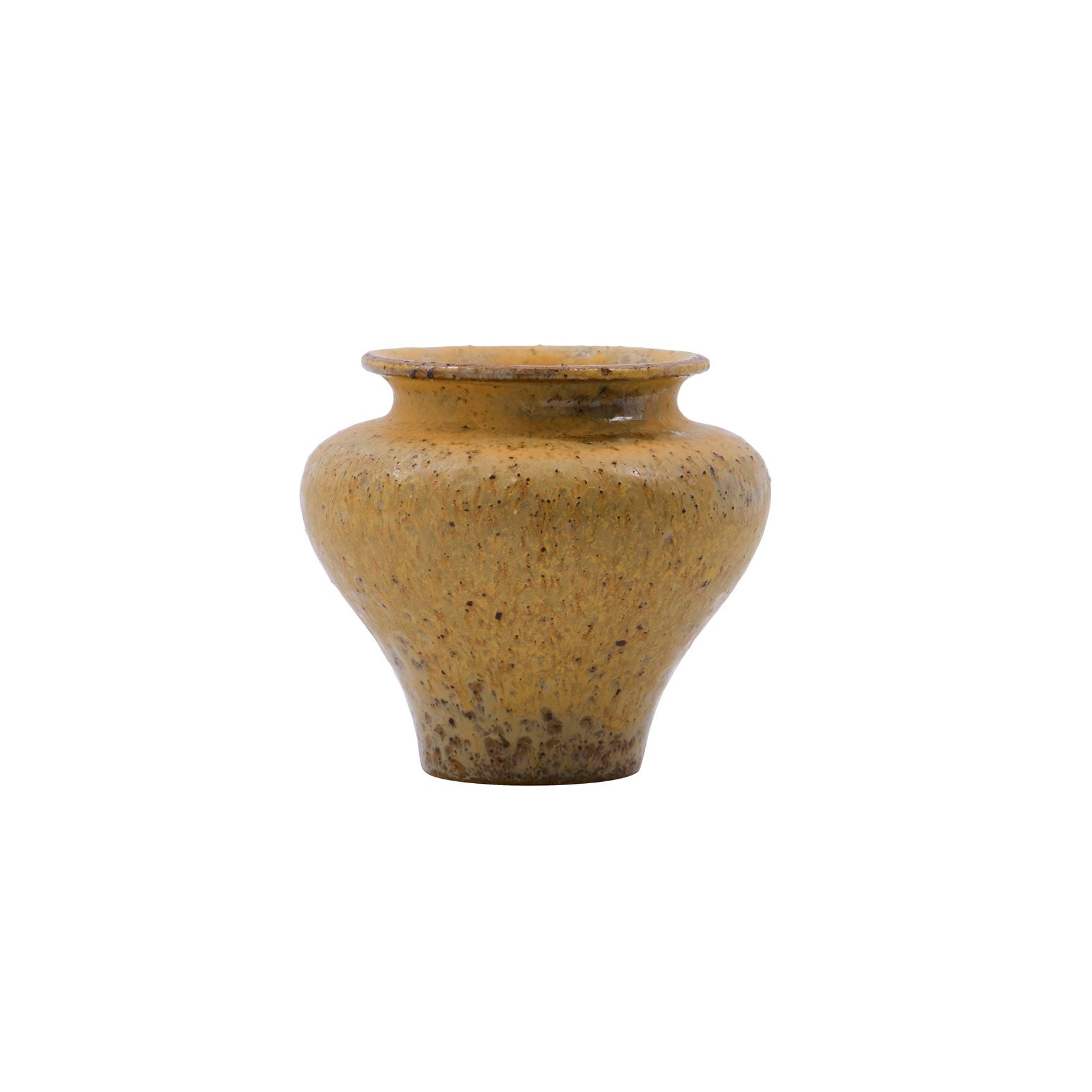 Le vase est fabriqué en grès robuste et recouvert d’un émail jaune moutarde chaleureux, plein de caractère. La brillance mouchetée foncée apporte de la profondeur et rend chaque pièce unique. Avec une hauteur de 8,5 cm et un diamètre de 9,5 cm, il est compact mais se fait remarquer avec style.