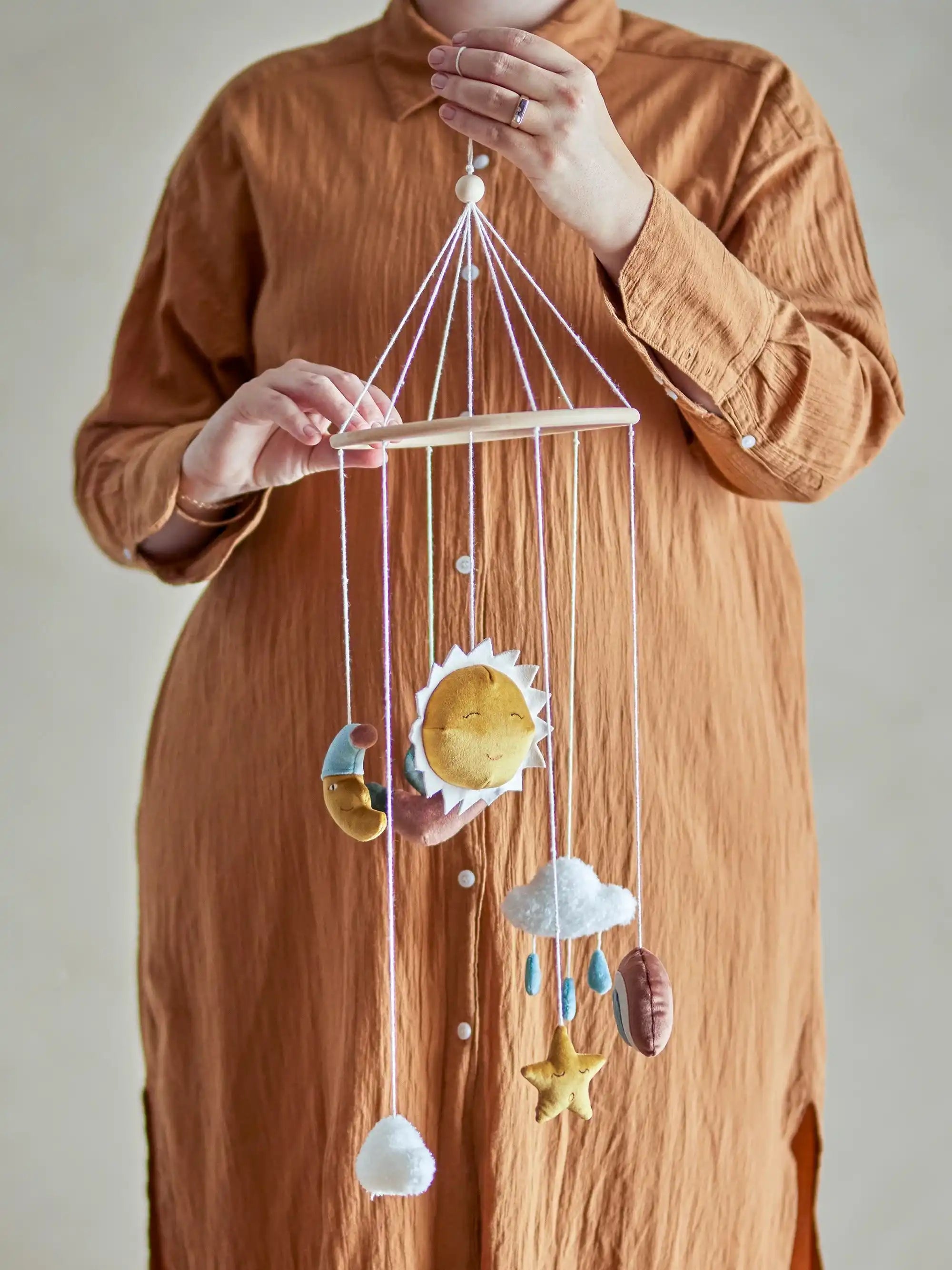 Détails & matériau : Le mobile est fabriqué en polyester. Il est léger et doux au toucher. La couleur brune apporte de la profondeur et s’accorde parfaitement avec des tons apaisants. Avec un diamètre de 20 cm, il est de petite taille, idéal au-dessus de la table à langer ou du lit. Le soleil et la lune apportent à la fois gaieté et sérénité – exactement ce que tu recherches dans une chambre d’enfant scandinave.