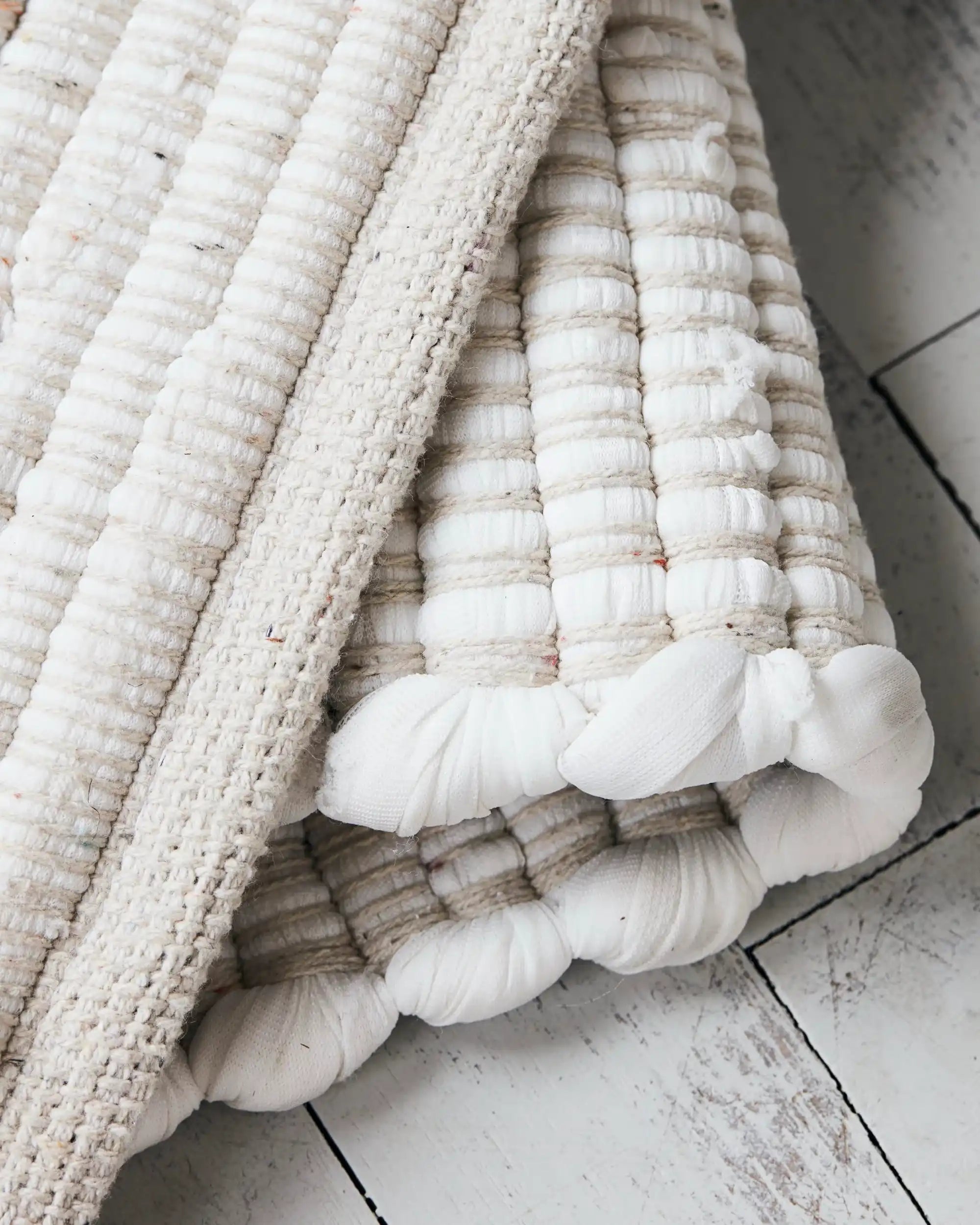 Glisse le tapis Chindi à moitié sous un banc en bois dans l'entrée pour une ambiance fraîche et accueillante. Ajoute quelques coussins en lin ou un panier naturel à côté. Tu renforces ainsi facilement le caractère clair et scandinave.