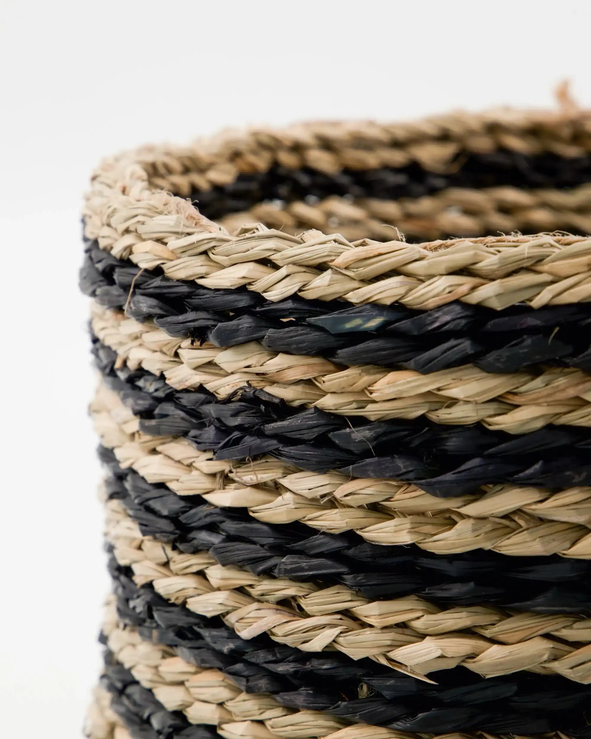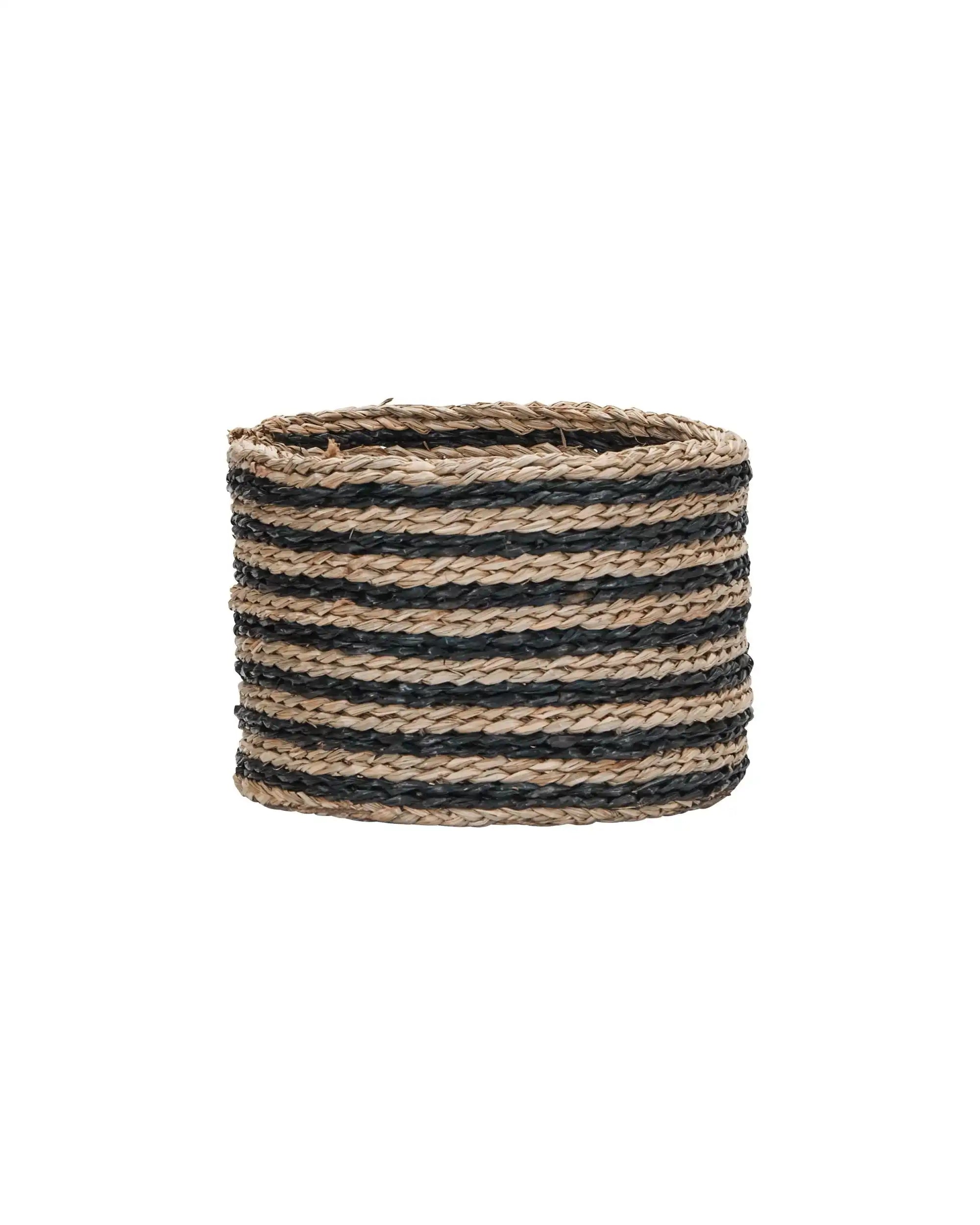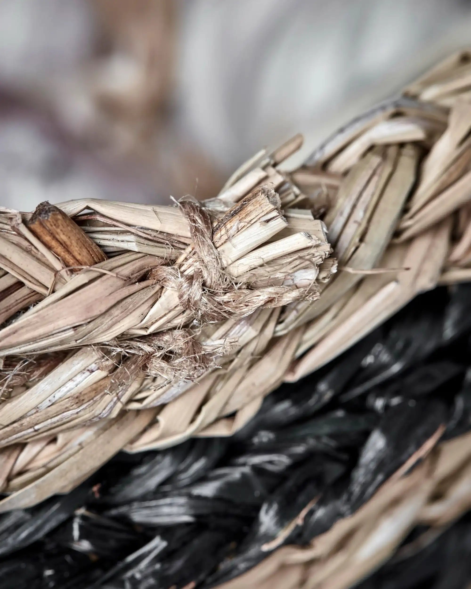 Chaque panier est tressé à la main en jonc de mer robuste et présente une couleur naturelle, rehaussée de discrètes rayures noires. L’ensemble comprend deux tailles : le grand panier mesure 18 cm de haut et 25 cm de diamètre, le petit fait 12 cm de haut et 21 cm de diamètre. Grâce à l’utilisation de fibres naturelles, chaque panier a un aspect unique.