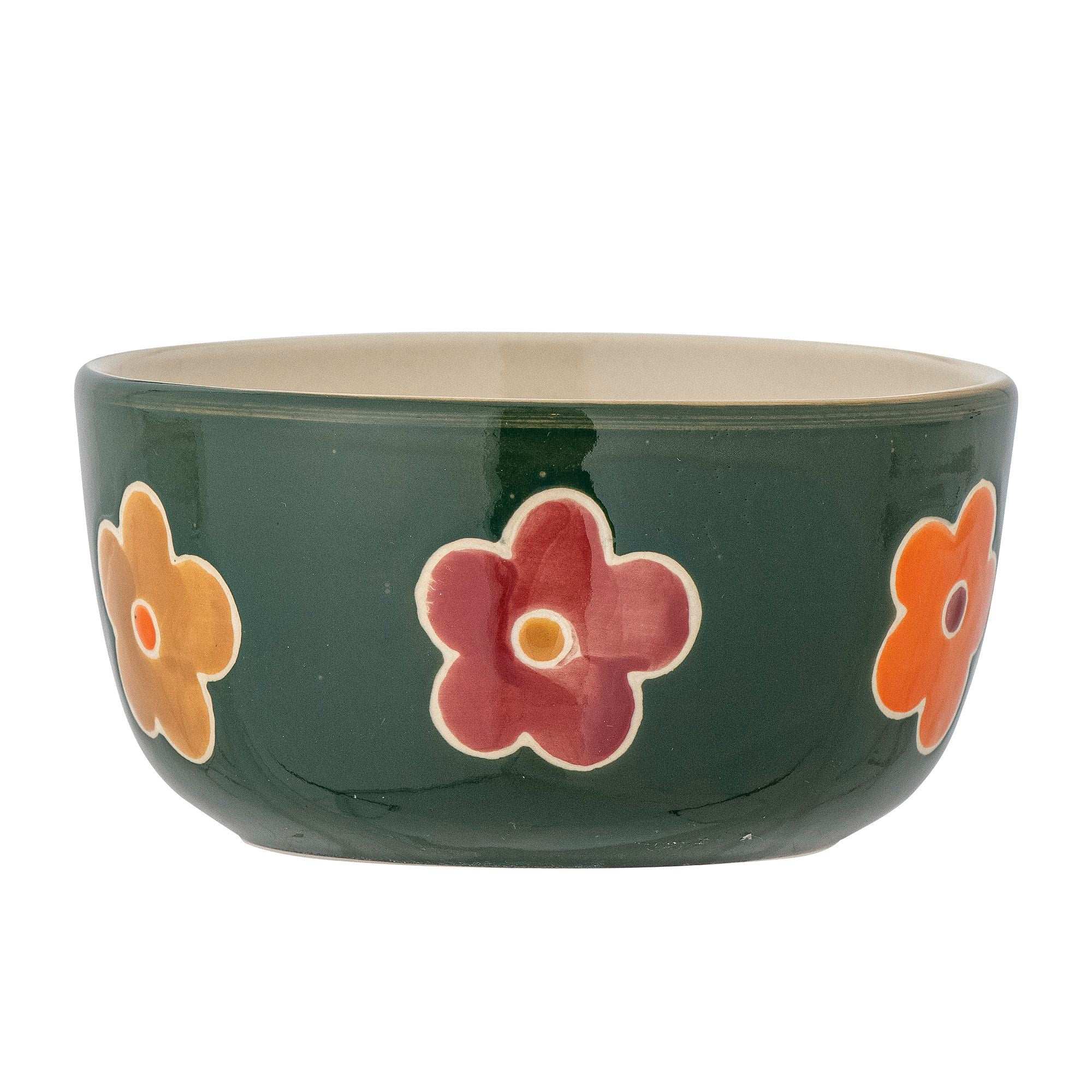 Dettagli & materiale: Realizzata in robusta terracotta in colori vivaci con una profonda lucentezza verde. La ciotola misura ø 12 cm e h 6 cm: facile da tenere per le manine, ma con spazio sufficiente per yogurt, frutta o noci. I fiori sono dipinti a mano con il pennello, quindi nessuna ciotola è identica all’altra. Questo dà un tocco speciale al tuo servizio da tavola.