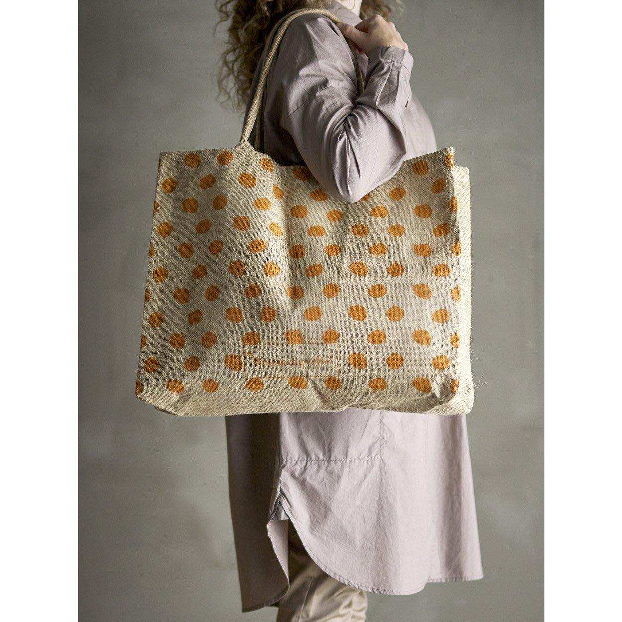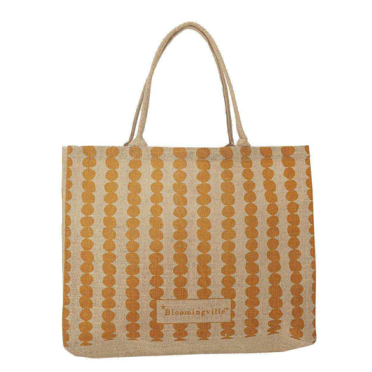 La shopper Bergamo gialla in juta di Bloomingville unisce funzionalità a un tocco giocoso. Questa borsa spaziosa, realizzata in juta durevole, presenta un allegro motivo a pois arancioni da un lato e un elegante motivo a cerchi verticali dall'altro. Con la sua struttura robusta e il design pratico, è perfetta per la spesa quotidiana, una giornata in spiaggia o una visita al mercato.