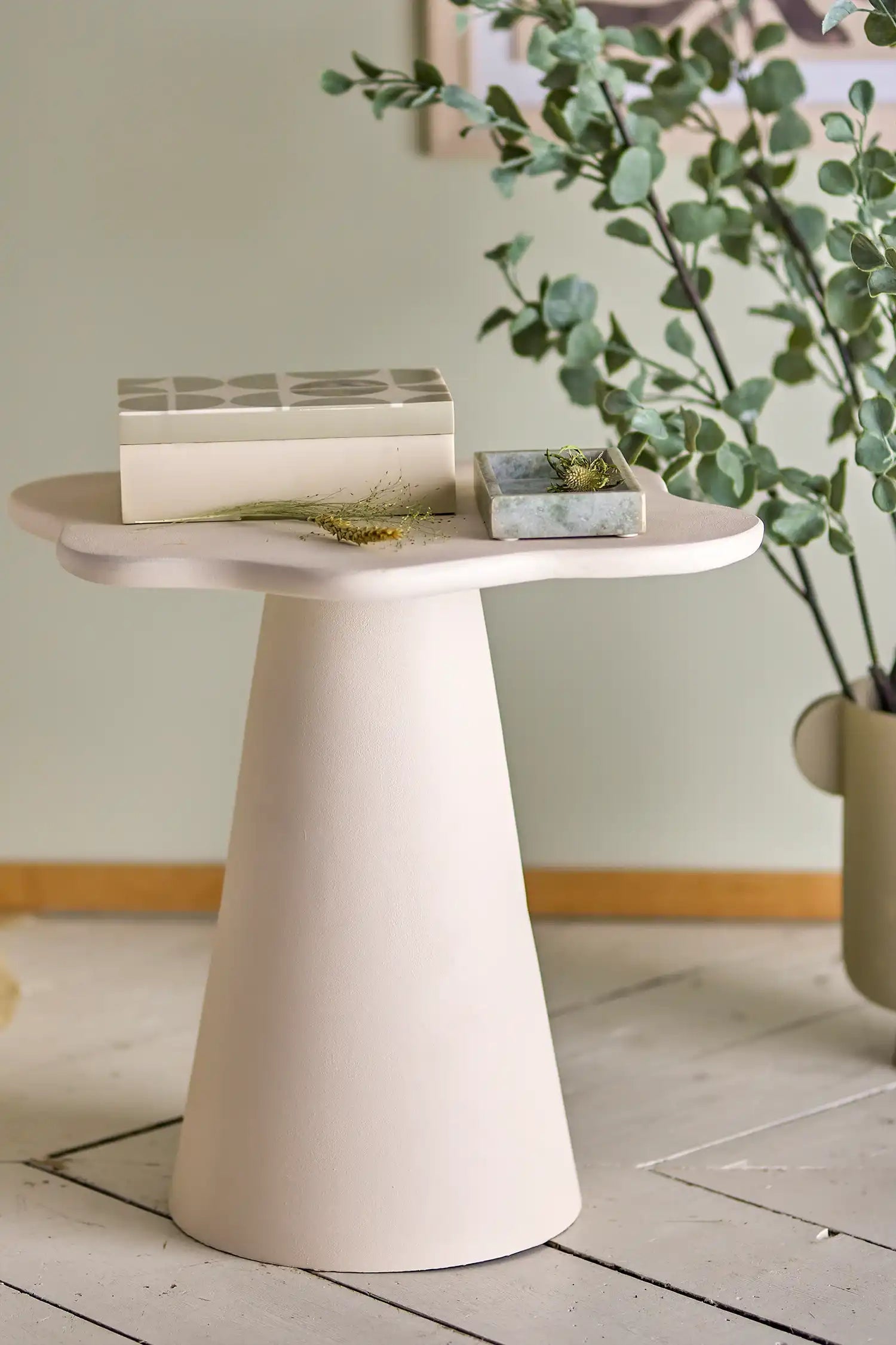 Dettagli & materiale: Il tavolino Soller è realizzato in solido alluminio e rifinito con una delicata vernice beige. Grazie al bel gioco di linee e alla qualità robusta, questo tavolino unisce facilmente un look deciso a un’eleganza naturale. Le dimensioni (43 x 48,5 x 56 cm) lo rendono particolarmente versatile, senza mai dominare lo spazio.