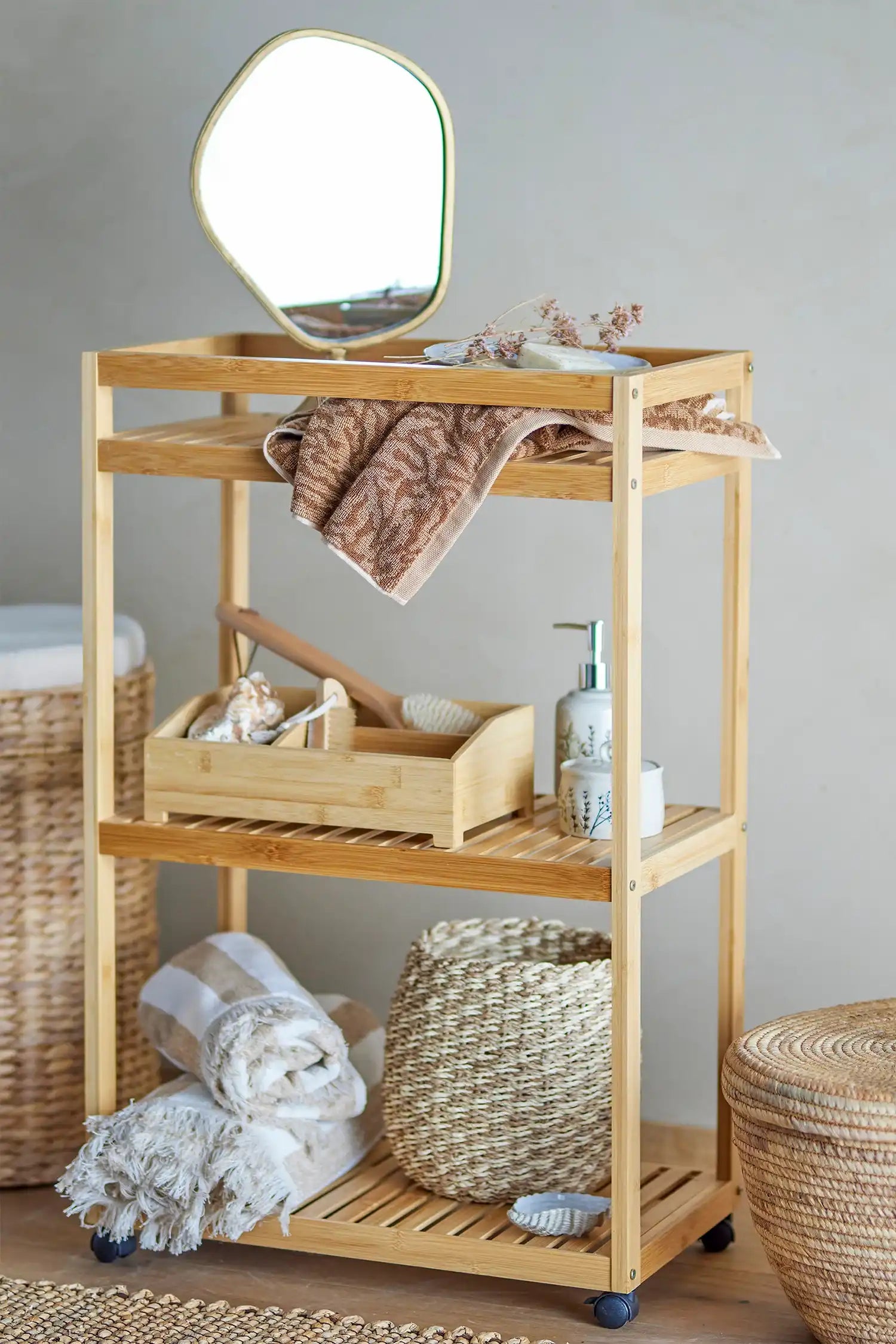 Perché vuoi avere questo tavolino di Bloomingville: Il tavolino in bambù naturale Aden porta tranquillità ed eleganza naturale nel tuo interno. Il bambù leggero crea subito un’atmosfera serena e trasforma ogni ambiente in un’oasi di stile, sia che tu cerchi spazio extra in bagno o un bel tavolino in camera da letto.