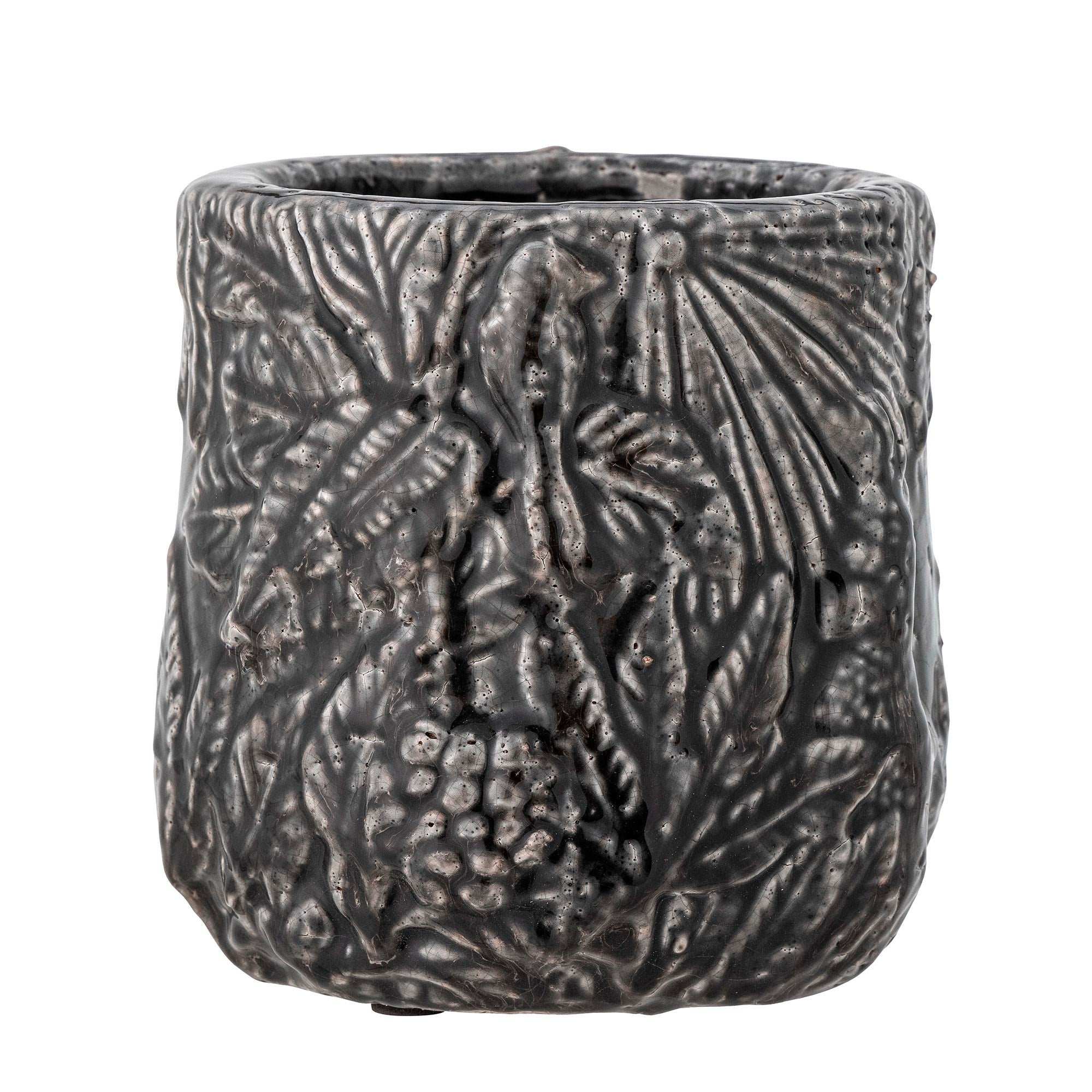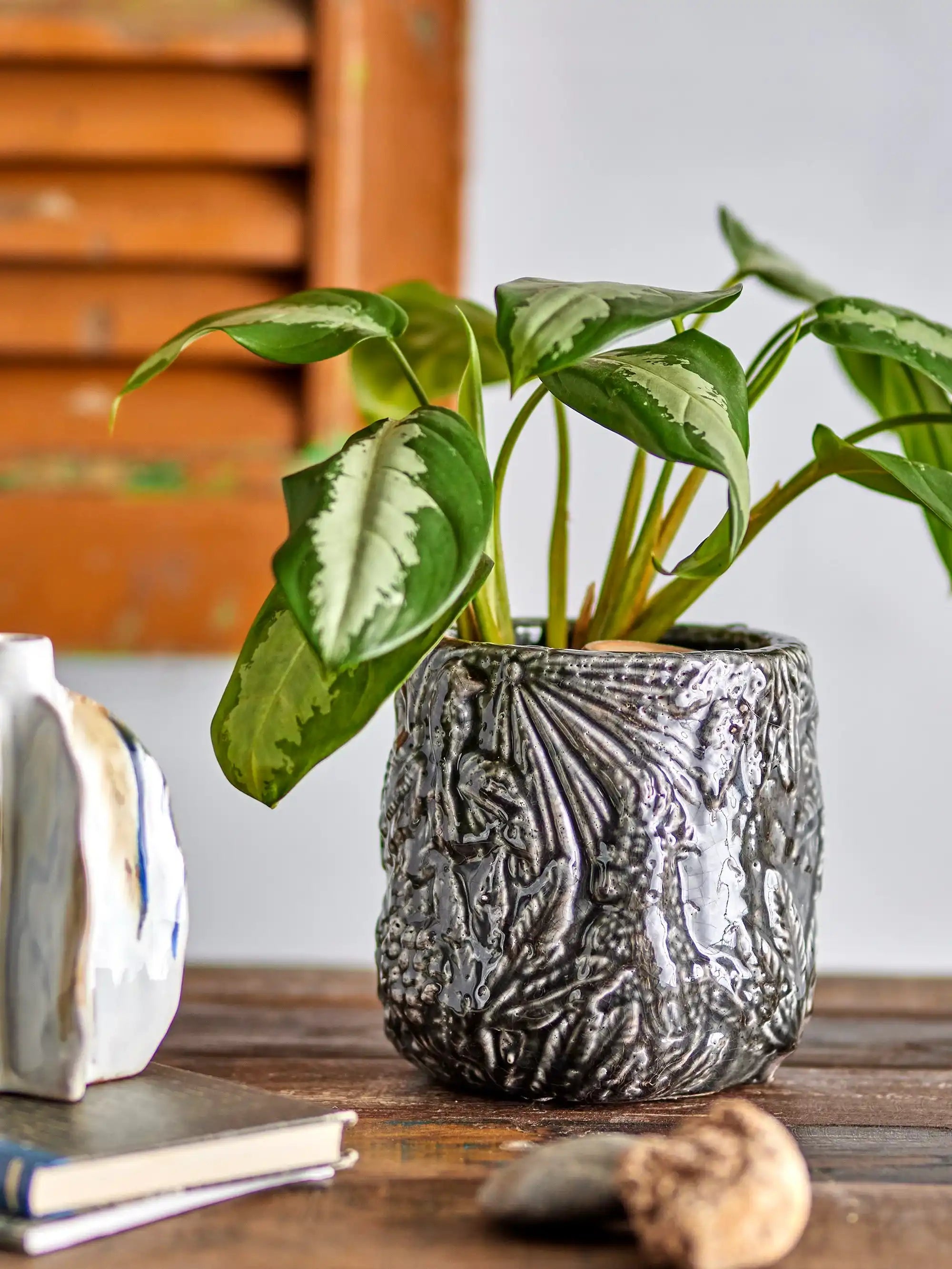 Dettagli & materiale: Realizzato in terracotta in una profonda tonalità nera, con un elegante motivo botanico sulla superficie. Con ø 18 cm è della misura ideale per piante di medie dimensioni e composizioni compatte su davanzali o tavolini. L’aspetto caratteristico della terracotta offre una base naturale, mentre il rilievo decorativo cattura splendidamente la luce. Ogni pezzo può variare leggermente; così avrai sempre un vaso unico che rende personale il tuo stile.