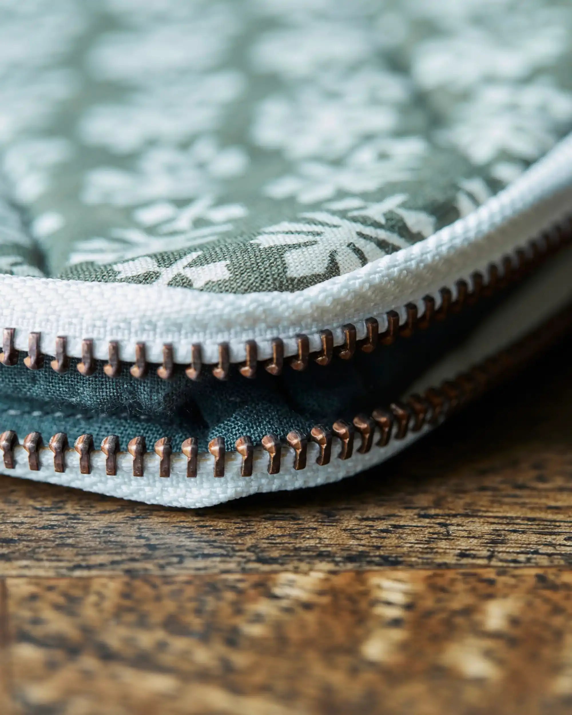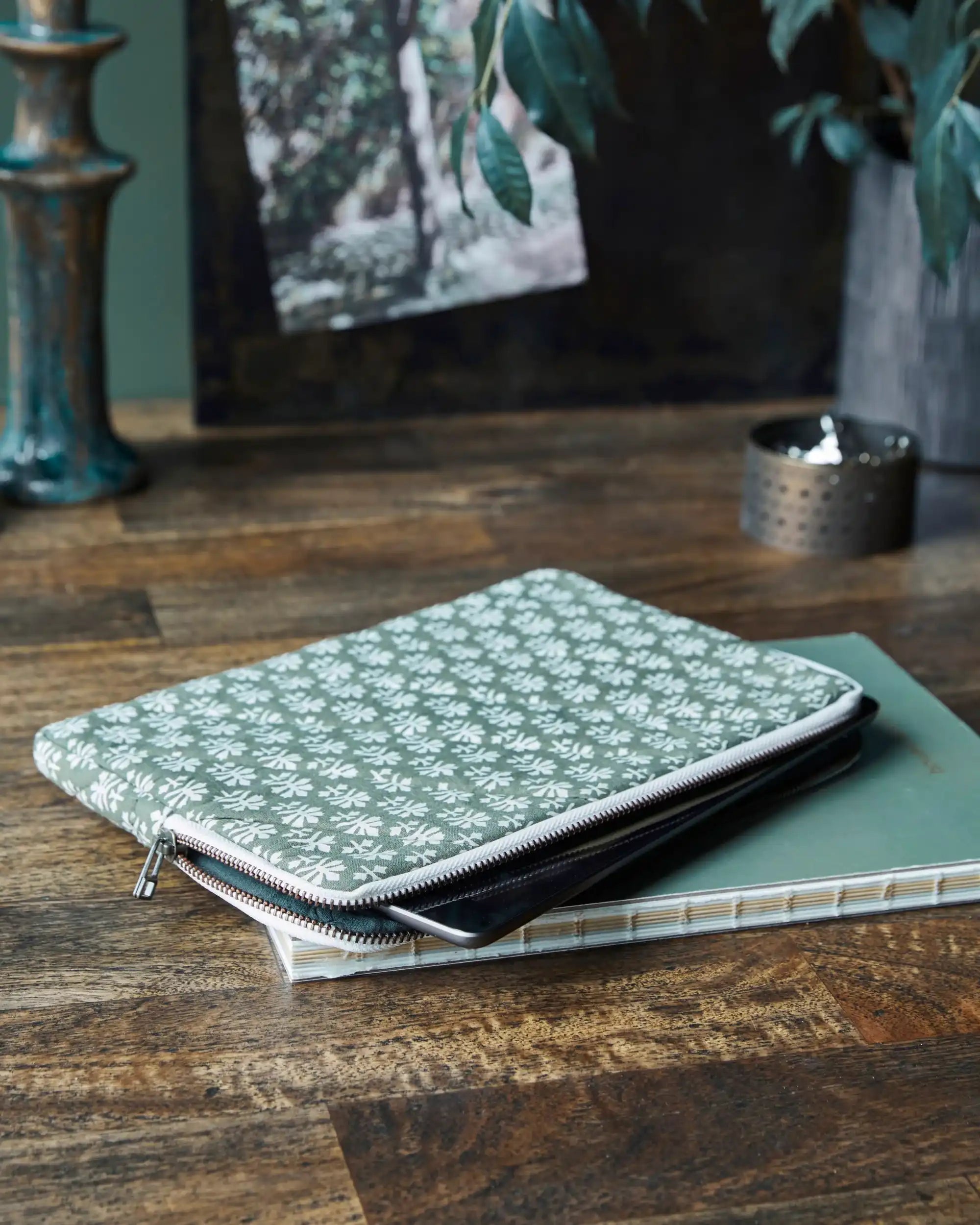 La custodia è realizzata in robusto cotone e presenta una delicata tonalità di verde con un motivo senza tempo. Grazie alle dimensioni compatte di 26 cm di lunghezza, 18 cm di larghezza e 2 cm di altezza, si adatta perfettamente a un tablet da 11 pollici. Il design imbottito tiene lontani polvere e graffi, mentre lo stile si abbina facilmente a diverse occasioni e look.