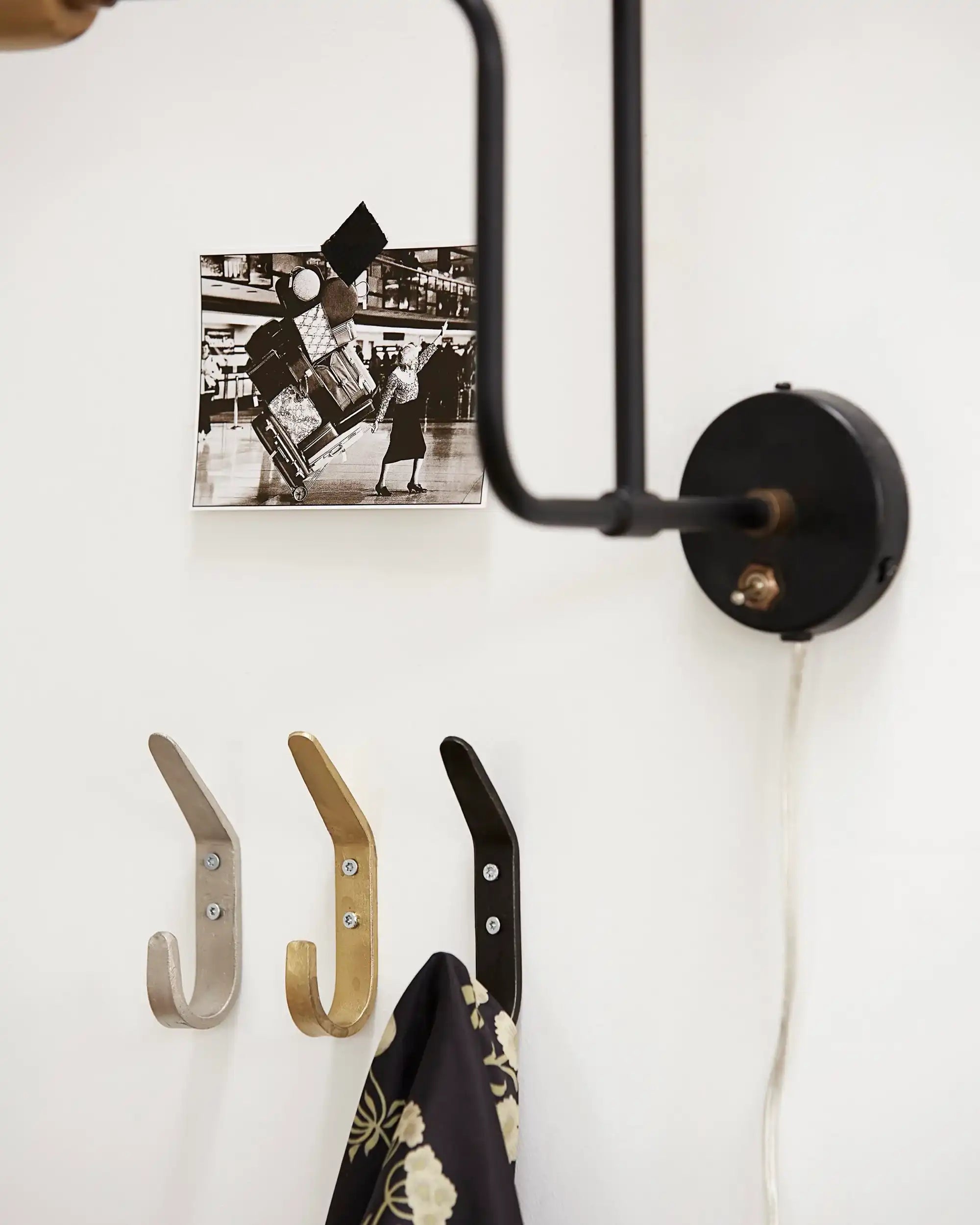 Il gancio è realizzato in metallo nero e ha una sensazione robusta, senza risultare grezzo. Ha una profondità di 12 cm e si distingue per la sua forma slanciata ed equilibrata. Una soluzione pratica per appendere giacche, gioielli o accessori nell'ingresso o in camera da letto.