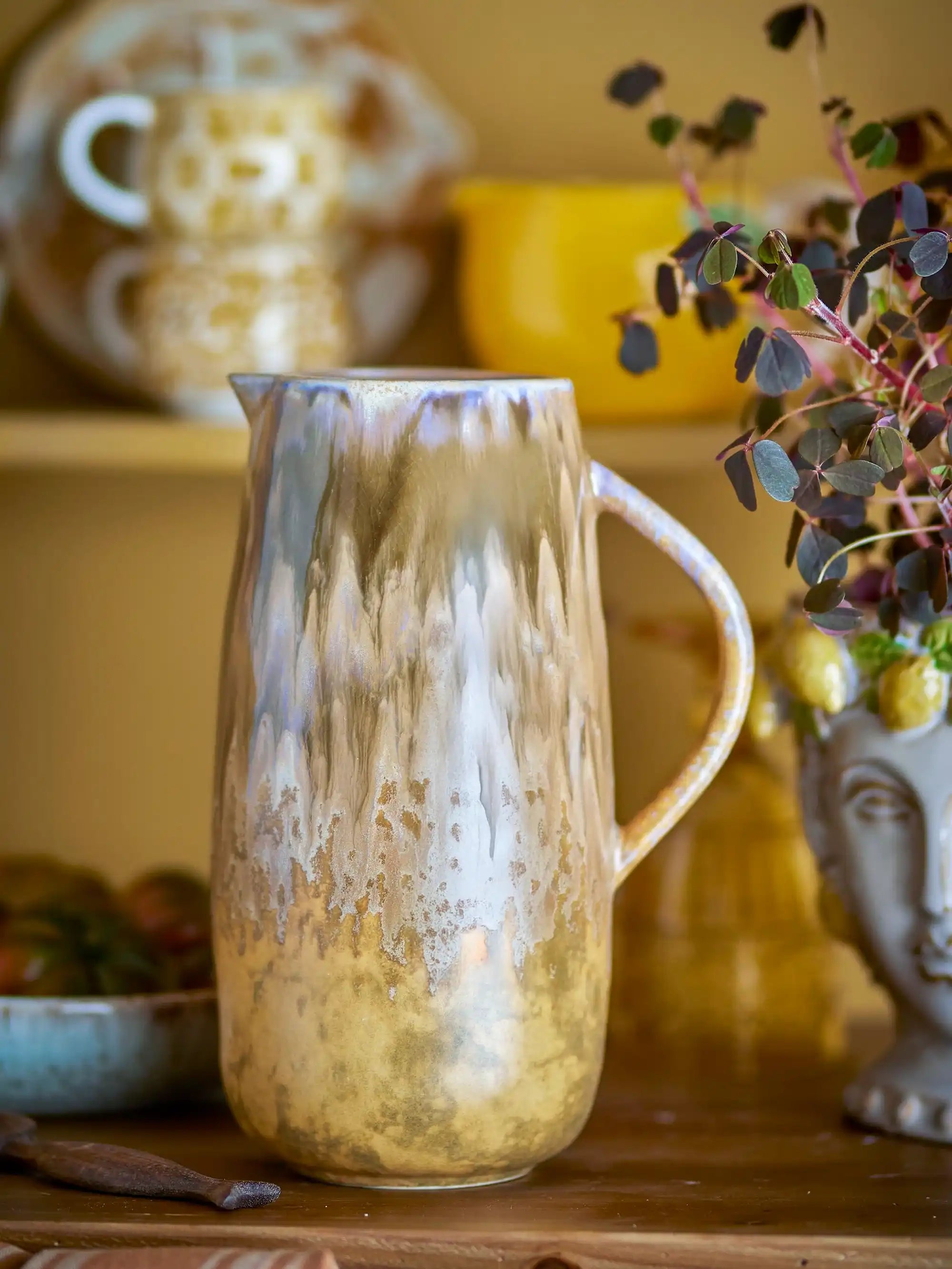 Perché vorrai avere Bloomingville: Lacey sorprende con un ricco gioco di marrone e giallo dorato. La smaltatura reattiva crea transizioni morbide, rendendo ogni brocca unica nel suo carattere. La forma alta e slanciata con manico arrotondato appare raffinata e si tiene comodamente in mano. Usala a tavola per acqua o limonata, oppure dona un tocco di stile al tuo scaffale in cucina – questa brocca si adatta sempre perfettamente.