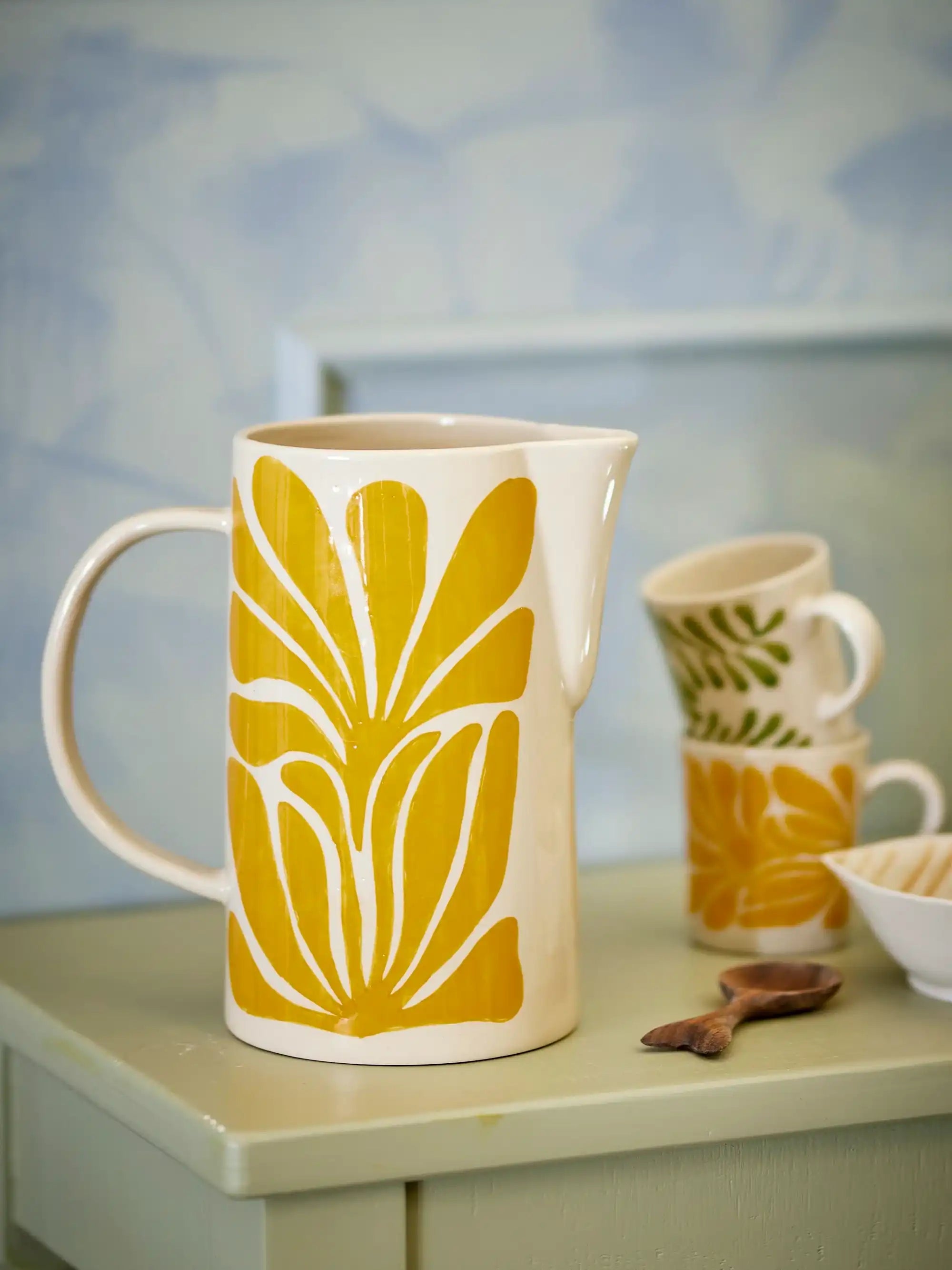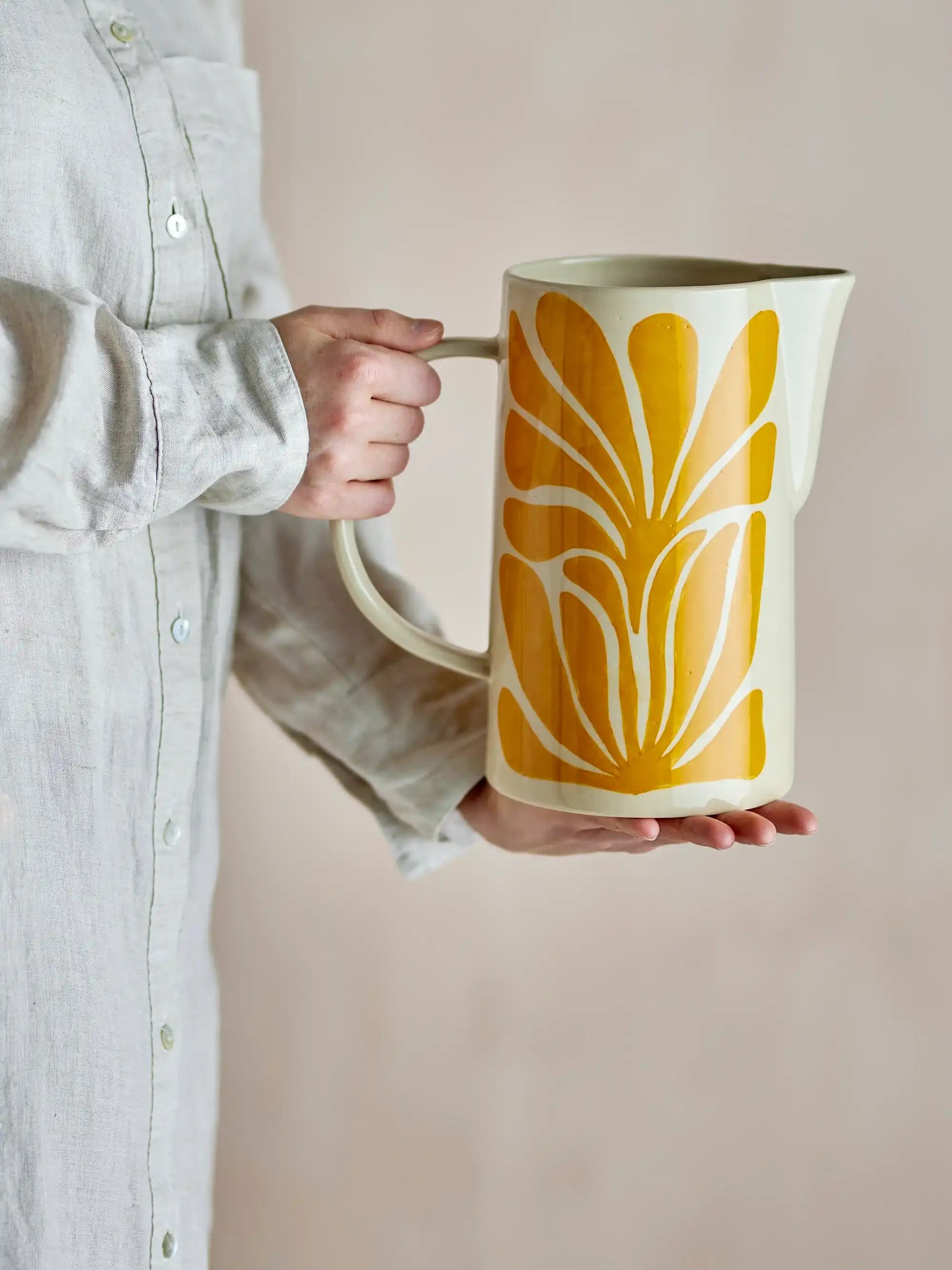 Dettagli & materiale: Realizzata in resistente terracotta in un giallo solare, con un motivo a foglie applicato a mano che segue elegantemente la forma. Con ø 12,5 cm, la brocca ha una dimensione piacevole ed equilibrata che sta benissimo sia sulla tavola che sullo scaffale. Le pennellate marcate donano profondità e sfumature alla superficie. Poiché la decorazione è applicata a mano, possono esserci leggere variazioni nel motivo e nel colore—così possiedi una brocca davvero unica.