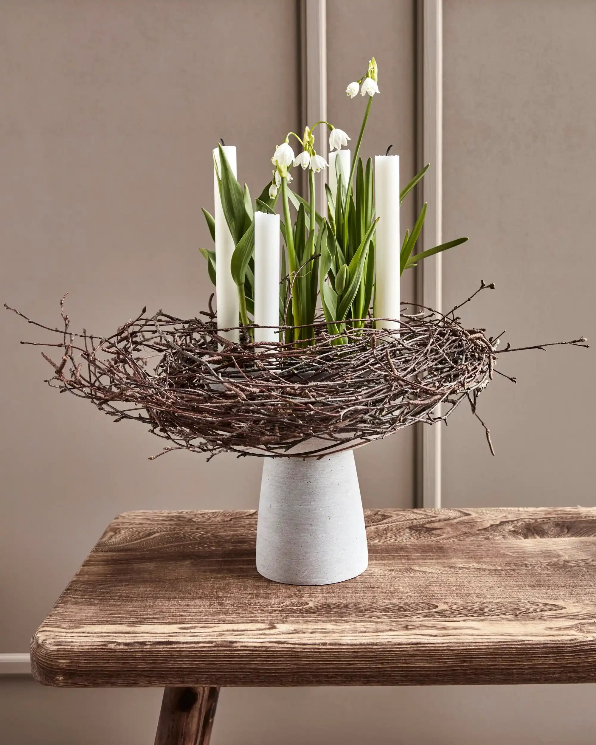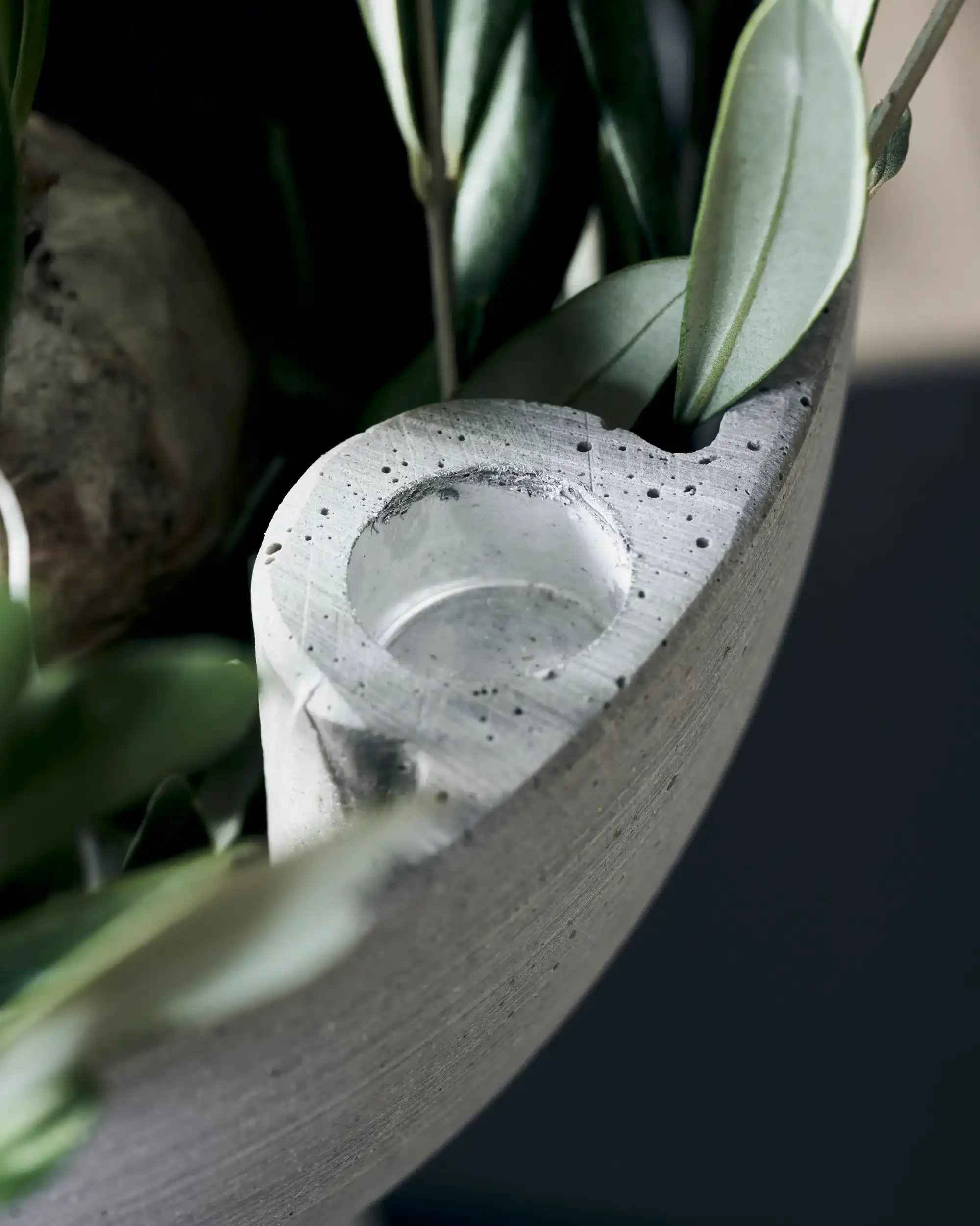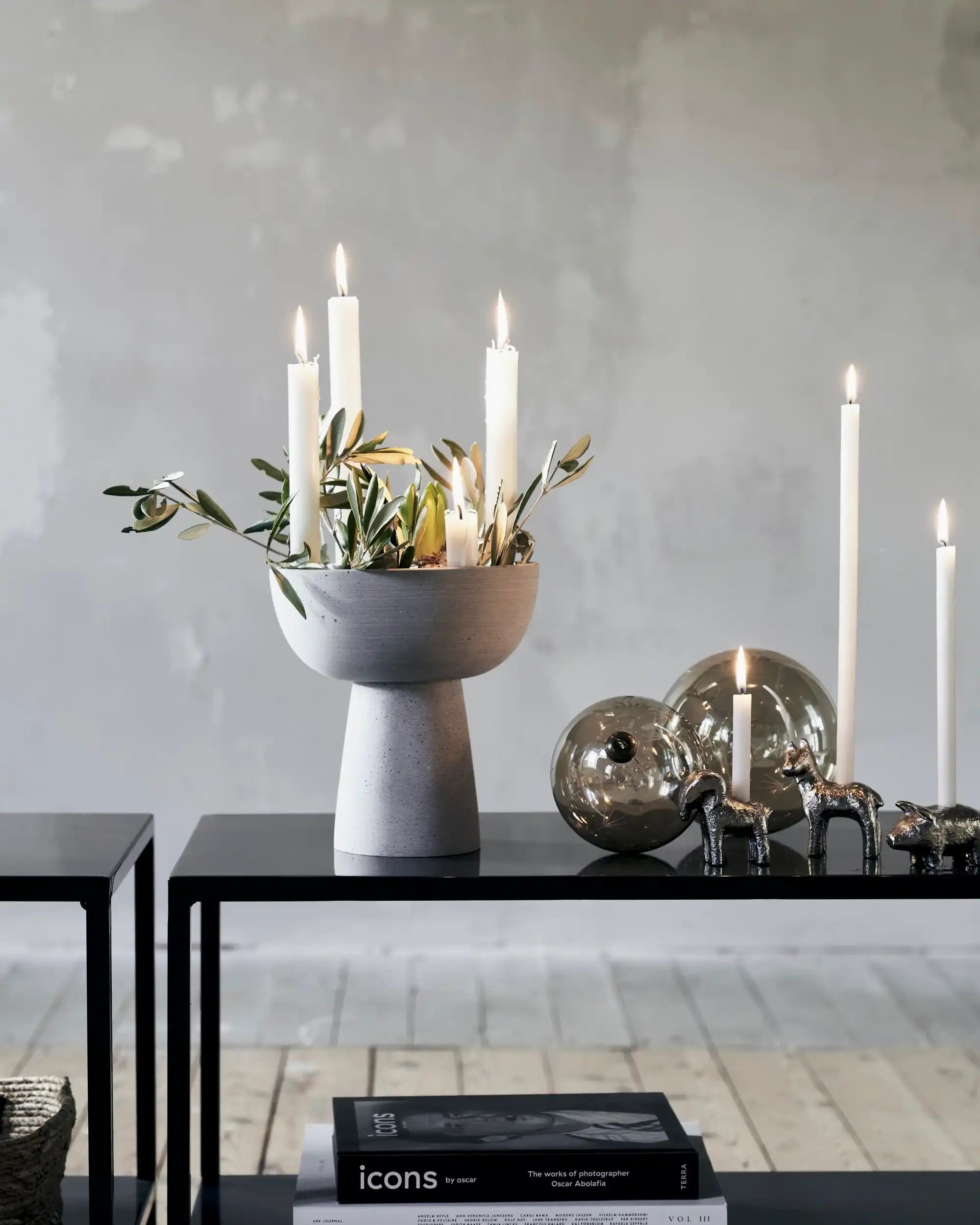 Abbina Marb a portacandele in altri materiali come legno o ceramica per un effetto stratificato nel tuo styling. Una candela in una tonalità calda — pensa al terracotta o al rosa antico — accentua il contrasto con il grigio freddo e rende l'insieme giocoso e accogliente.