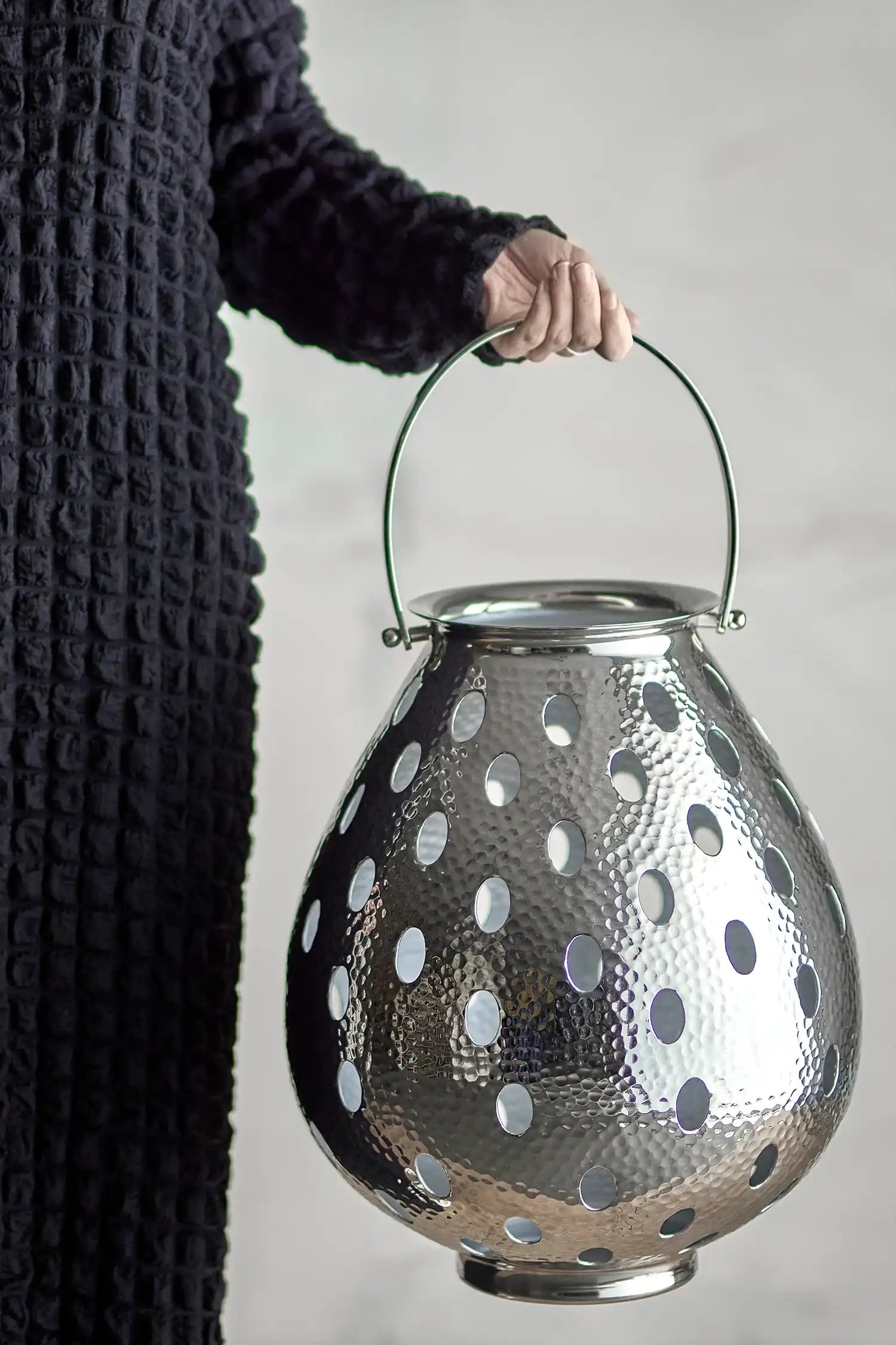 Dettagli & materiale: Questa lanterna generosa è realizzata in alluminio leggermente martellato e ha un’altezza di 40 cm con un diametro di 33 cm. Il materiale di alta qualità non è solo robusto e facile da mantenere, ma dona a Maika una lucentezza lussuosa. I dettagli applicati a mano creano un gioco di ombre speciale quando accendi una candela al suo interno.