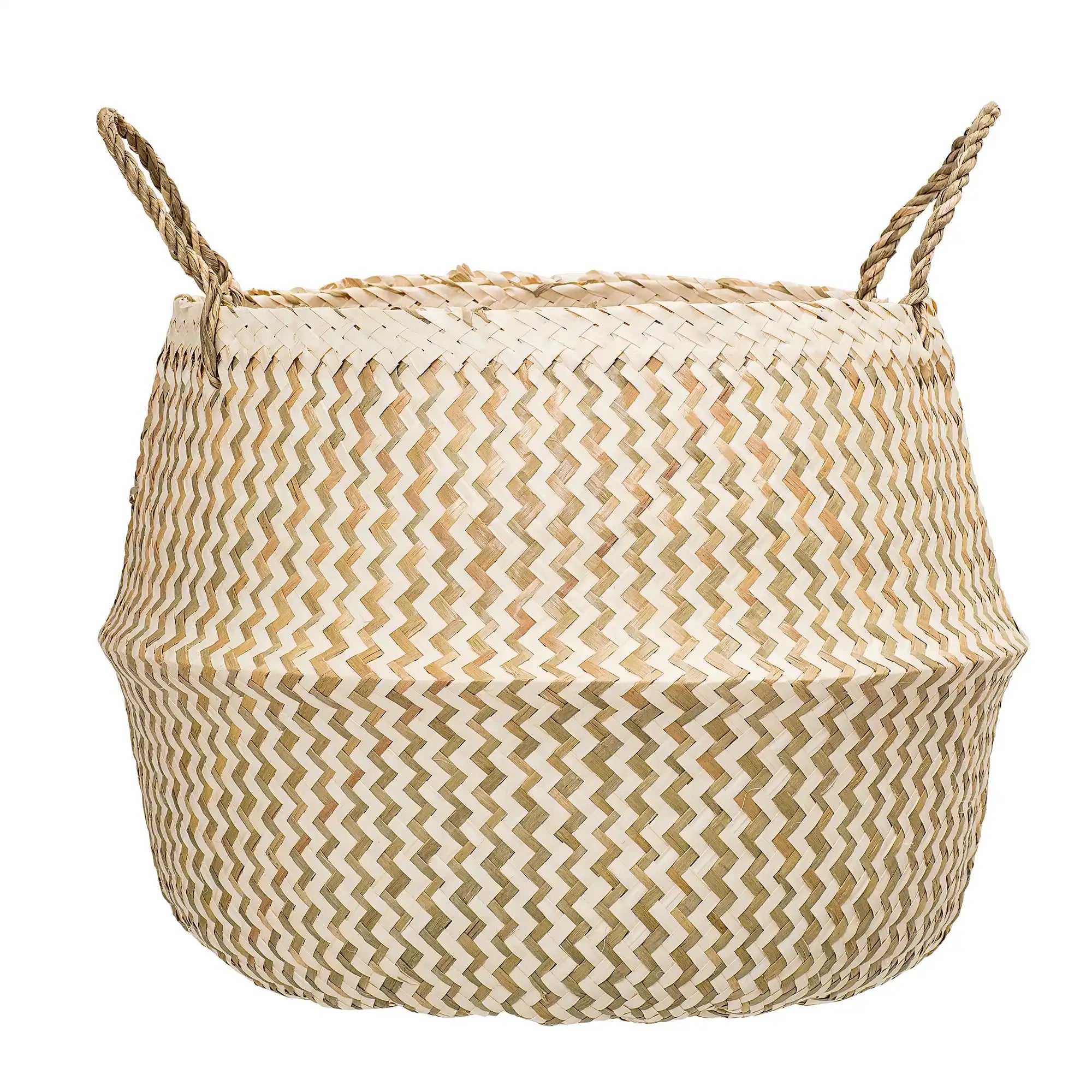 Dettagli & materiale: Il cestino è intrecciato a mano con erba marina ecologica, che gli conferisce un aspetto vivace e artigianale. Con il suo generoso diametro di 42 cm e un’altezza di 34 cm, offre ampio spazio ed è facile da spostare grazie alle robuste maniglie.