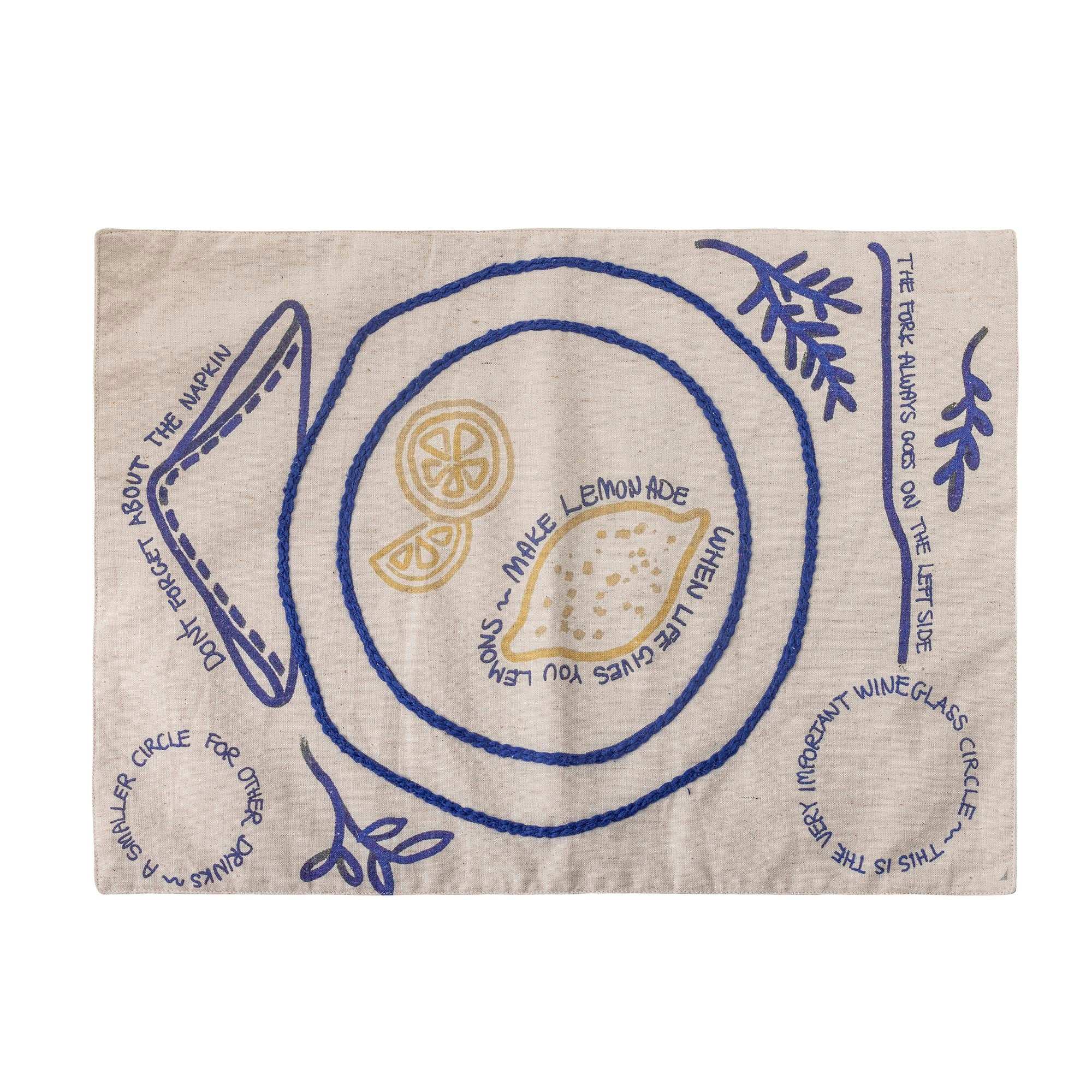 Dettagli & materiale: Realizzata in un mix di cotone e lino, la tovaglietta Limone ha una texture morbida e leggermente strutturata che risulta piacevole al tatto e dall’aspetto ricco. La base blu fa risaltare splendidamente i limoni gialli, mentre i dettagli ricamati donano al disegno un tocco artigianale. Il tessuto è abbastanza resistente per l’uso quotidiano, ma mantiene un look raffinato, perfetto per una tavola apparecchiata con stile. Grazie al design studiato, la tovaglietta guida lo sguardo intorno alla tavola e crea una base tranquilla per piatti e posate.