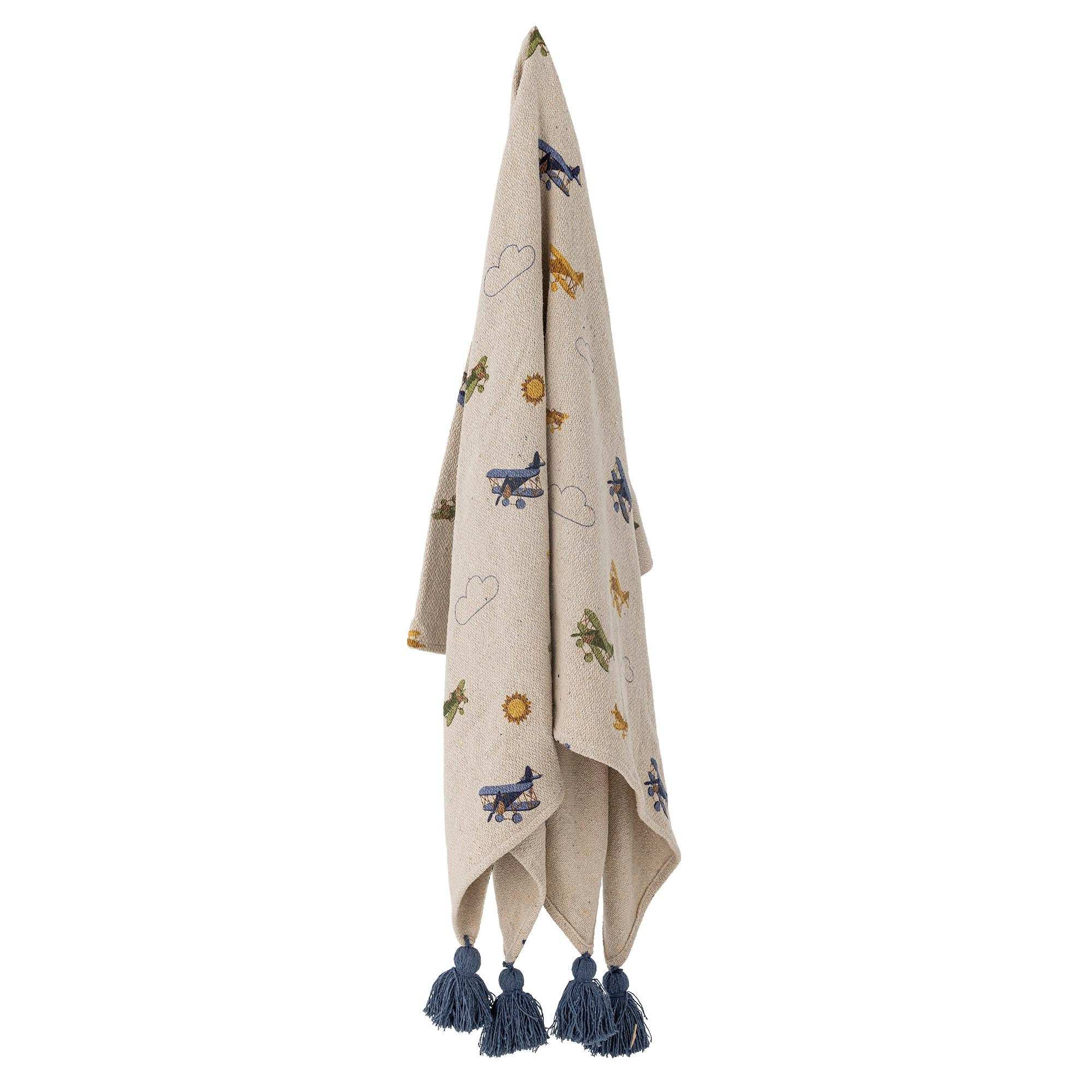 Dettagli & materiale: Il plaid è realizzato in cotone riciclato. È piacevolmente morbido e fa bene al pianeta. Il colore è beige con motivi delicati di nuvole e aerei. In ogni angolo c’è un pon pon blu per un dettaglio giocoso. Il tessuto è leggero e arioso, così puoi usarlo in ogni stagione. In inverno è perfetto come strato extra, mentre in estate è traspirante e fresco.