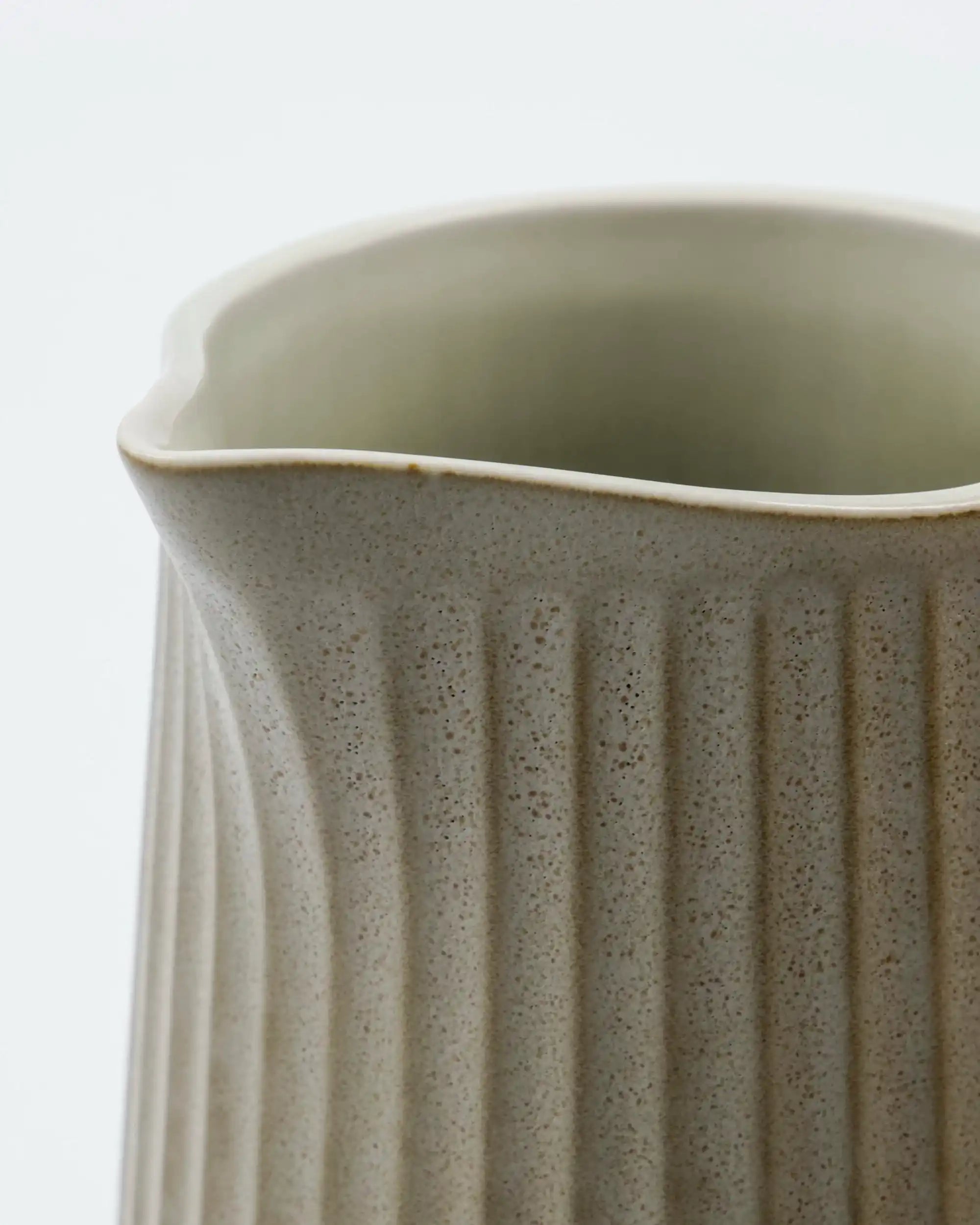 Questa ampia caraffa è realizzata in robusta terracotta e presenta un esterno opaco con interno lucido. La delicata combinazione di grigio e marrone la rende senza tempo e versatile. Con un'altezza di 21 cm, una larghezza di 12 cm e una lunghezza di 17 cm, è perfetta sia per l'uso quotidiano che come elemento decorativo.