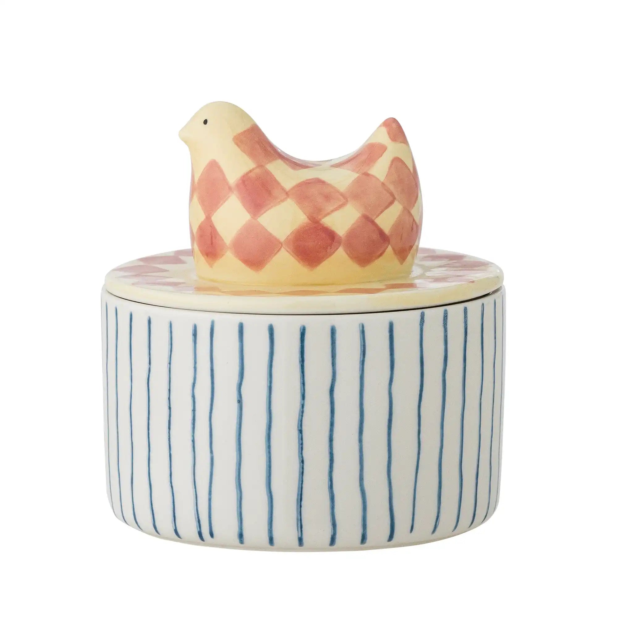 Dettagli speciali e materiali: Realizzato in robusta ceramica e rifinito in delicate tonalità pastello, ogni vaso è unico grazie alla pittura artigianale. Con un’altezza di 12 cm e un diametro di 11 cm, offre spazio sufficiente per biscotti, gioielli o piccoli tesori. Il coperchio si chiude saldamente e il grazioso uccellino rosa e giallo aggiunge un tocco scandinavo discreto.