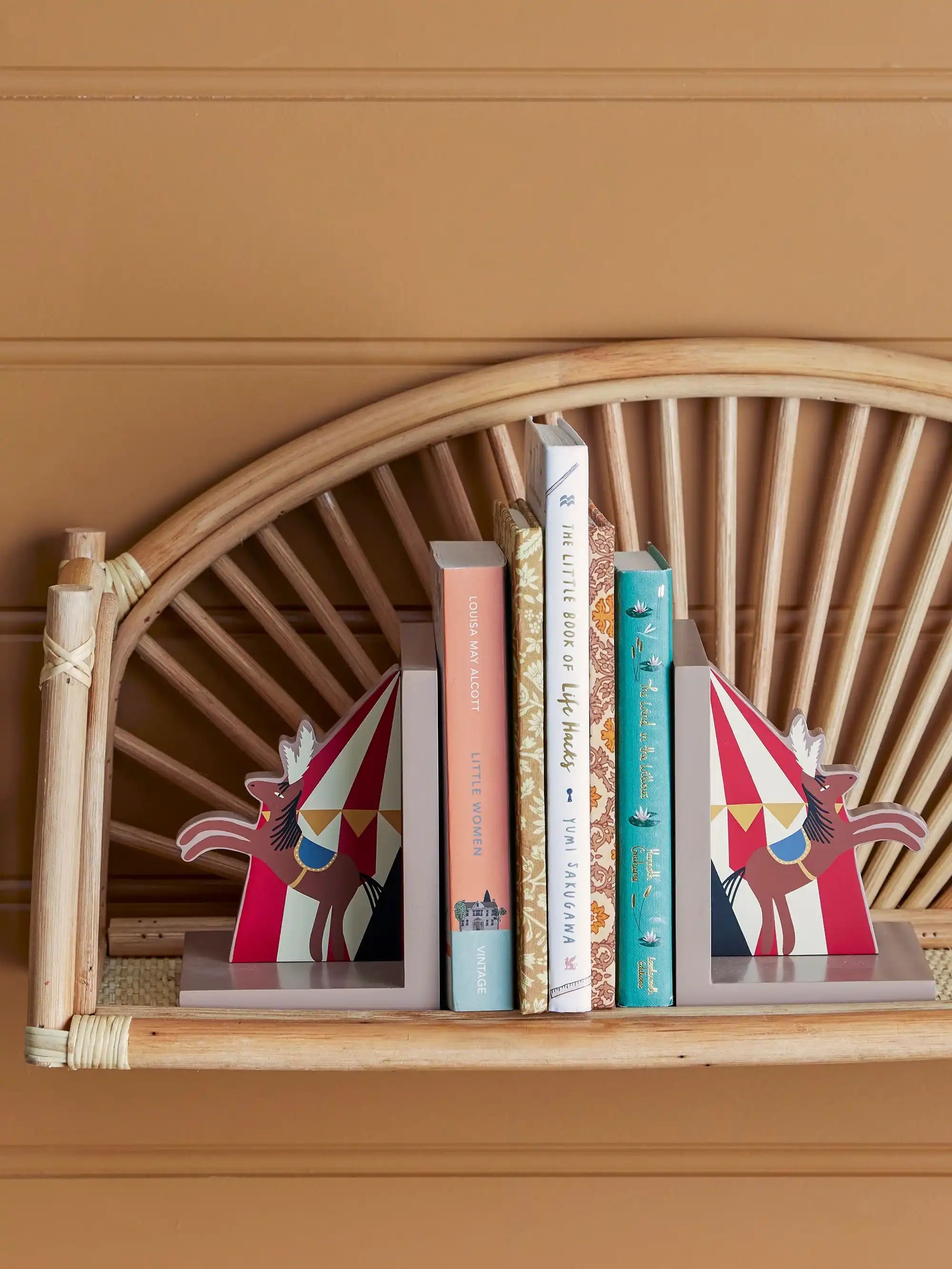 Consiglio d’uso: Metti i cavallini a sinistra e a destra dei tuoi libri oppure posizionane uno tra la fila per un effetto più giocoso. Abbinali a oggetti in legno o colori tenui, così il rosso risalterà ancora di più. Cambia spesso i libri, così leggere rimane divertente e la stanza ordinata.