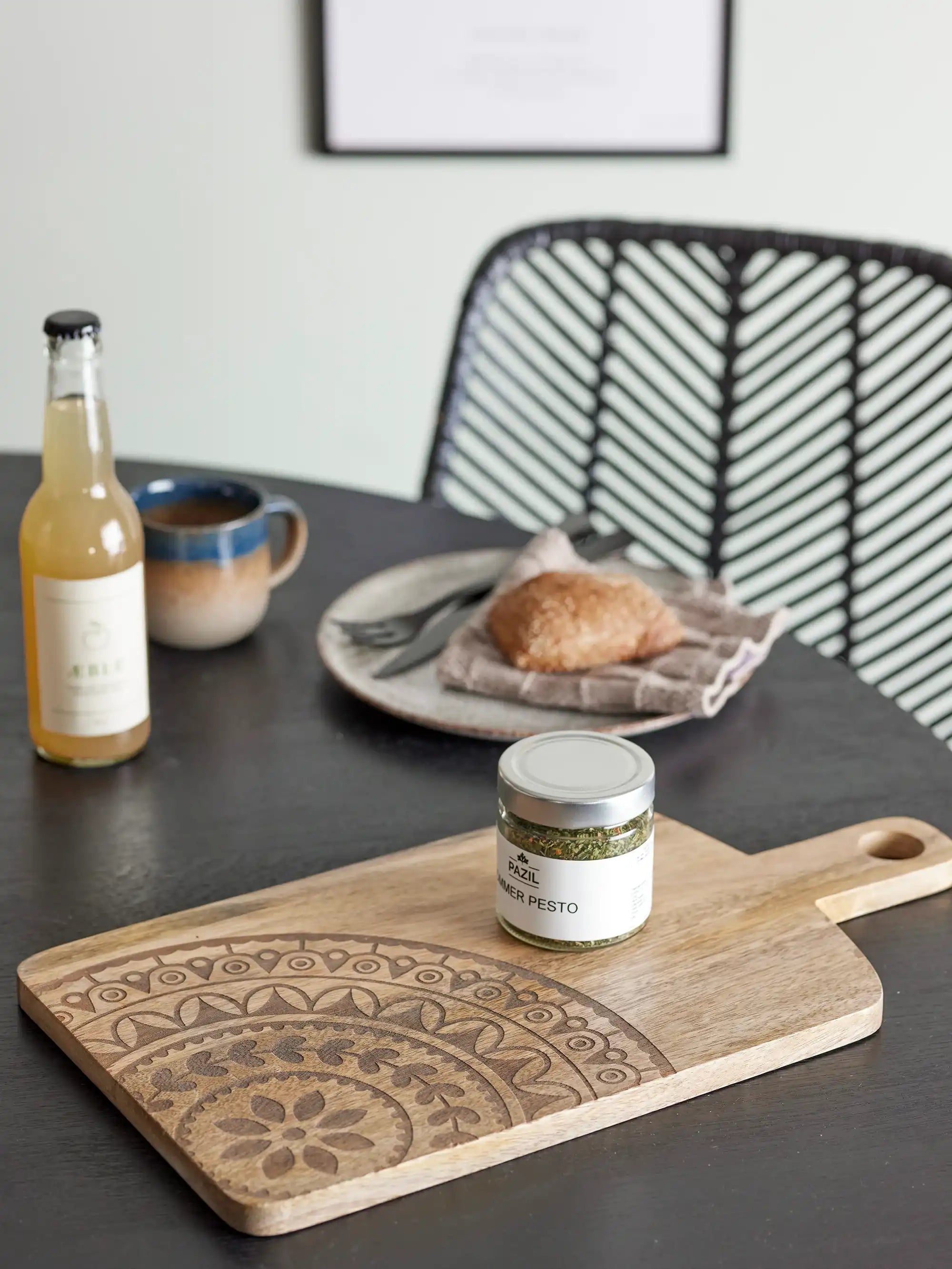 Consiglio d’uso: Usa il vassoio come punto focale durante una serata tapas o aggiungi un tocco elegante alla colazione servendo panini freschi. Un sottile strato d’olio mantiene il legno di mango bello e ti permette di goderti questo accessorio di stile per molti anni.