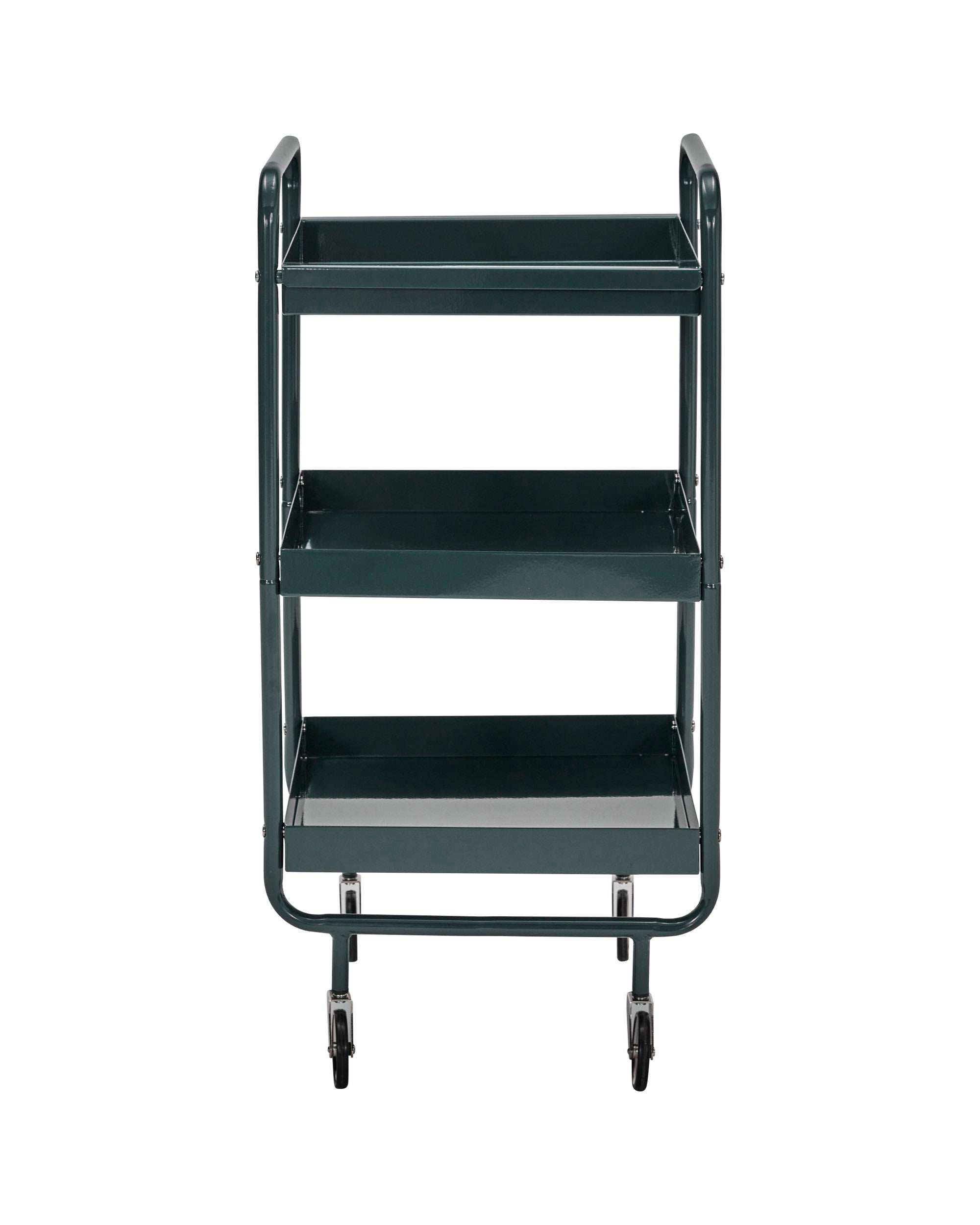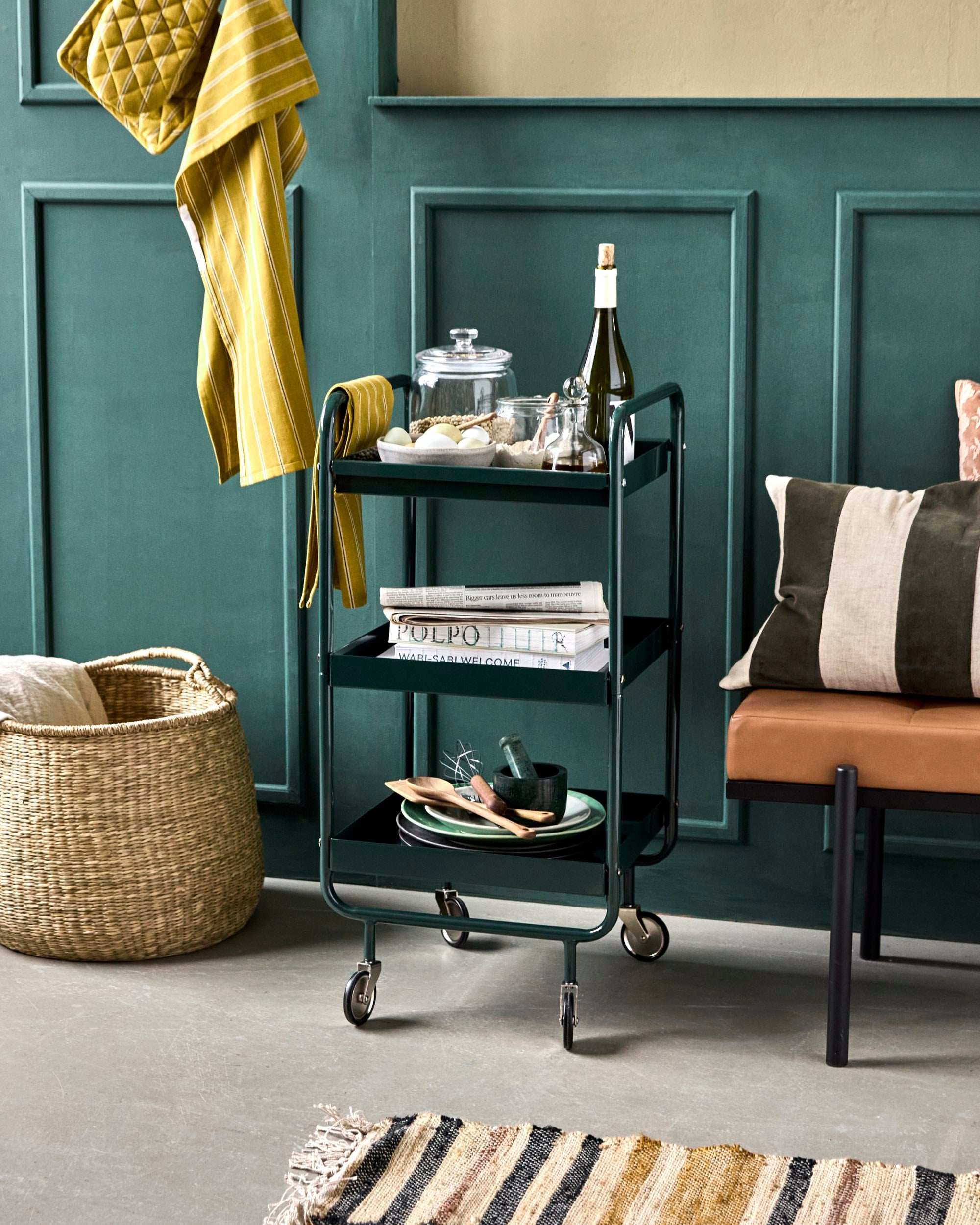 Con il Roll trolley in verde scuro di House Doctor aggiungi funzionalità e stile al tuo arredamento in un solo gesto. Questo carrello in metallo ha tre ripiani robusti, linee sottili e un colore profondo ed elegante che si adatta facilmente sia agli ambienti moderni che classici. Che tu lo usi come bar, porta piante o aiutante in cucina: il Roll è sempre pronto all'uso.