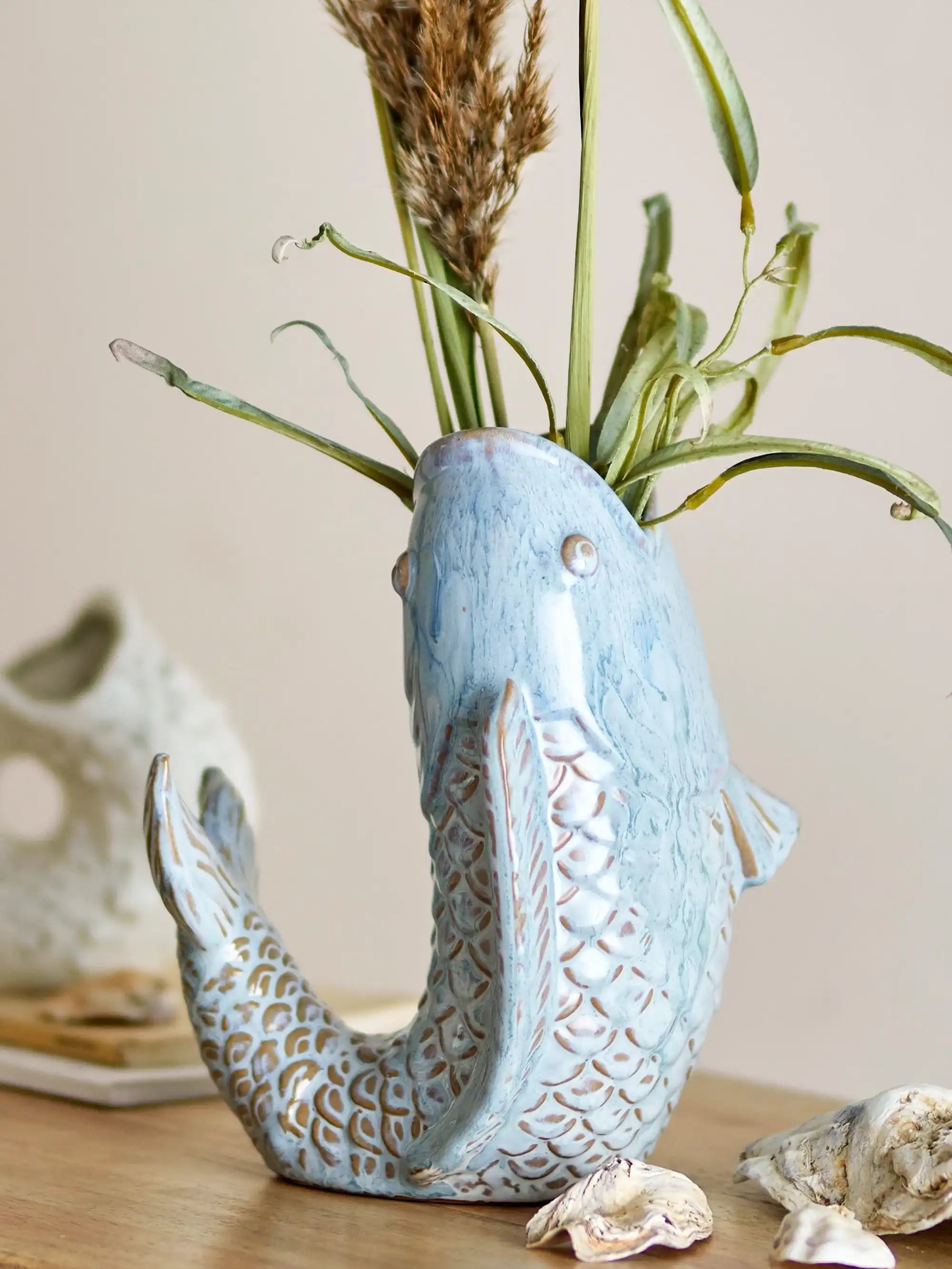 Perché vuoi avere questo vaso di Bloomingville: Questo vaso Hiro della Creative Collection è tutto tranne che ordinario. La ceramica è modellata come un elegante pesce, con delicate scaglie e una linea fluida che dona subito movimento al tuo styling. La smaltatura azzurro chiaro con sfumature morbide regala un aspetto fresco e sereno, mettendo in risalto i fiori in modo splendido. Mettilo con steli sul tavolo o lascialo parlare da solo su una mensola; in entrambi i casi aggiunge una nota artistica al tuo interno.
