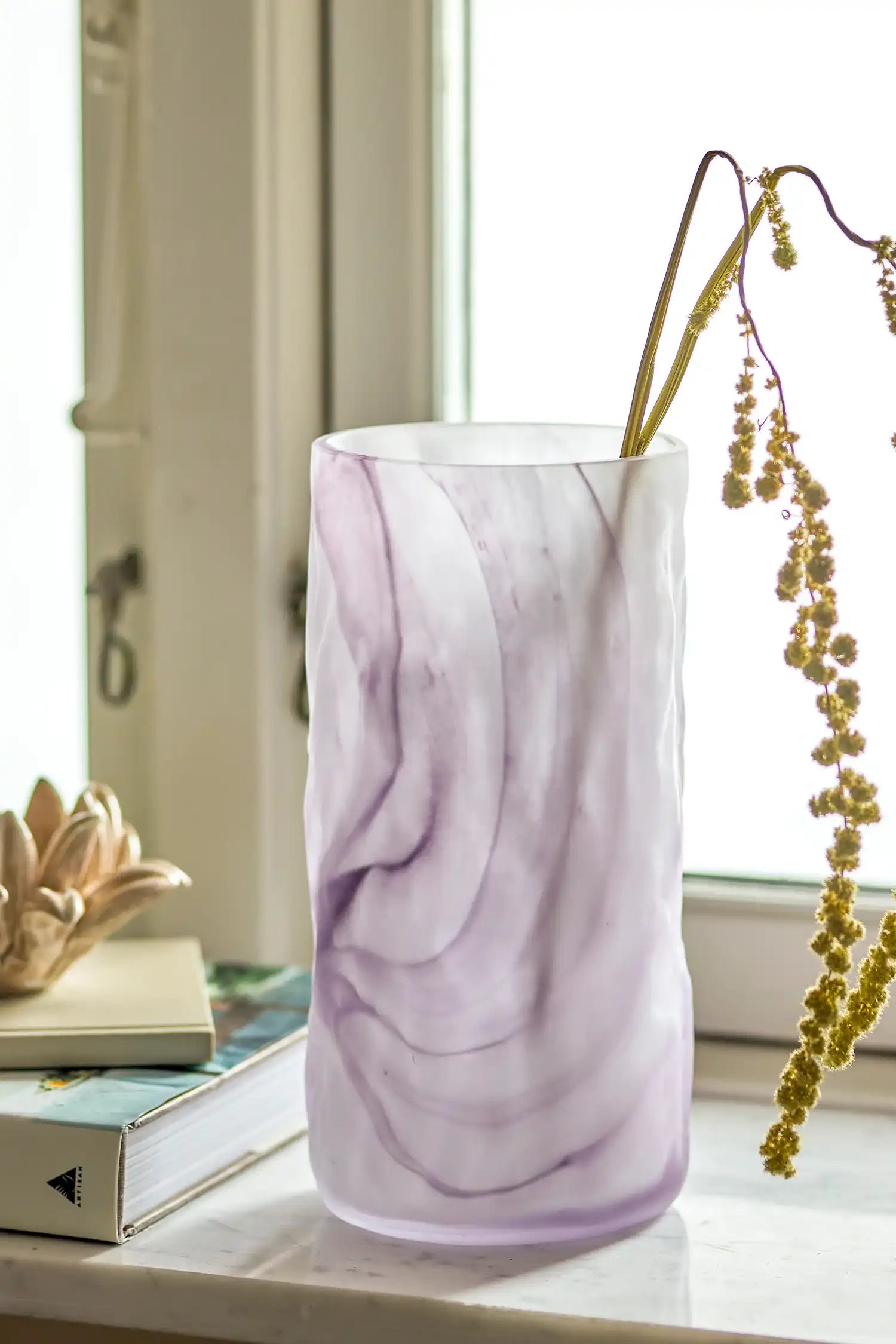Dettagli & materiale: Ogni pezzo è soffiato a bocca in vetro robusto, rendendolo unico per forma e colore. Il vaso è alto 24,5 cm e ha un diametro di 12 cm, perfetto sia su una credenza che al centro del tavolo da pranzo. L’effetto marmo nel vetro dona un tocco giocoso ma elegante e uno stile scandinavo al tuo arredamento.