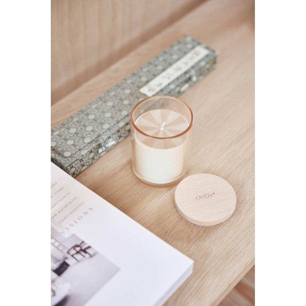 Het deksel van de kaars is gemaakt van beukenhout, wat een mooie natuurlijke uitstraling toevoegt aan het geheel. De samenstelling van de kaars bestaat voor 95% uit was en voor 5% uit parfum, waardoor de geur zich gelijkmatig verspreidt en langdurig aanwezig blijft.