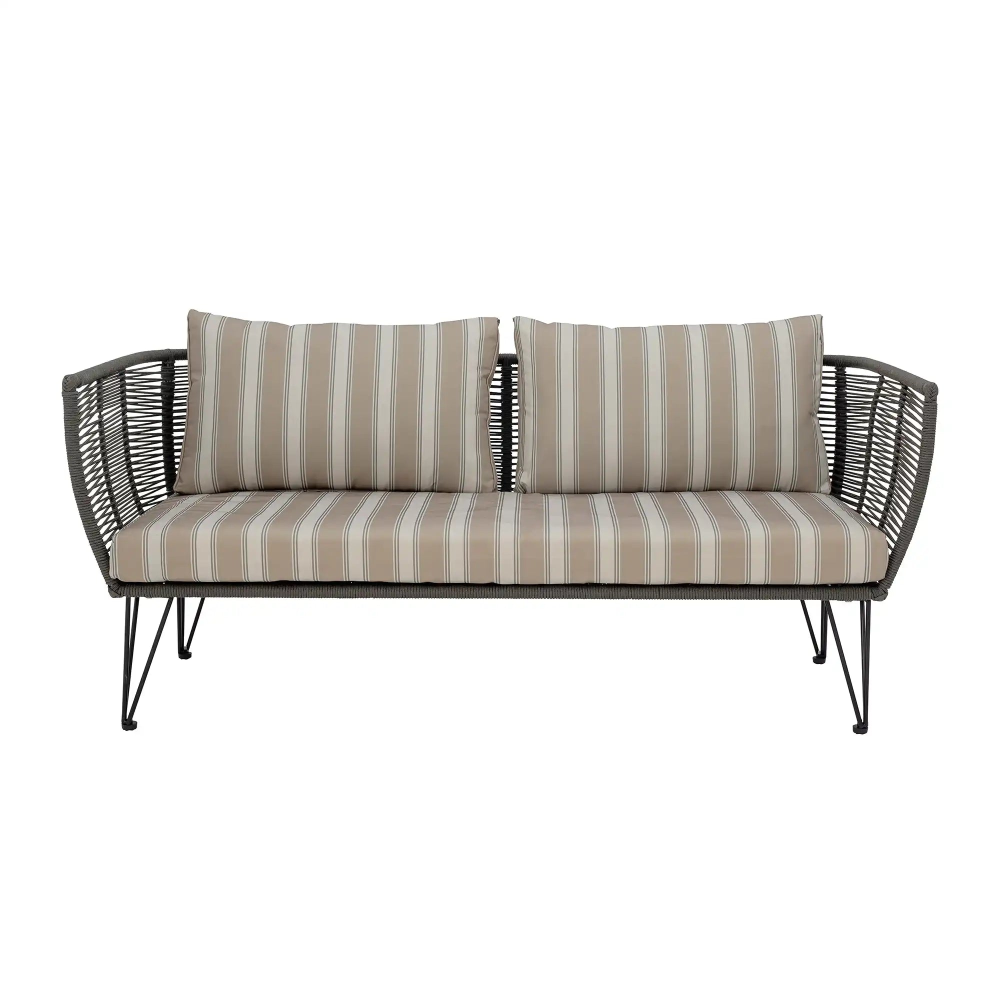 Hoogwaardig materiaal en stijlvol ontwerp: Deze buitenbank is vervaardigd uit stevig, zwart gepoedercoat metaal met met de hand gevlochten donkergroene polyester touwen. De bijpassende kussenslopen zijn voorzien van speelse strepen, eenvoudig te reinigen op 30 graden en voelen heerlijk zacht aan. Met royale afmetingen (74 cm breed, 72 cm hoog en 175 cm diep) biedt de bank volop zitruimte en een uitnodigend comfort.