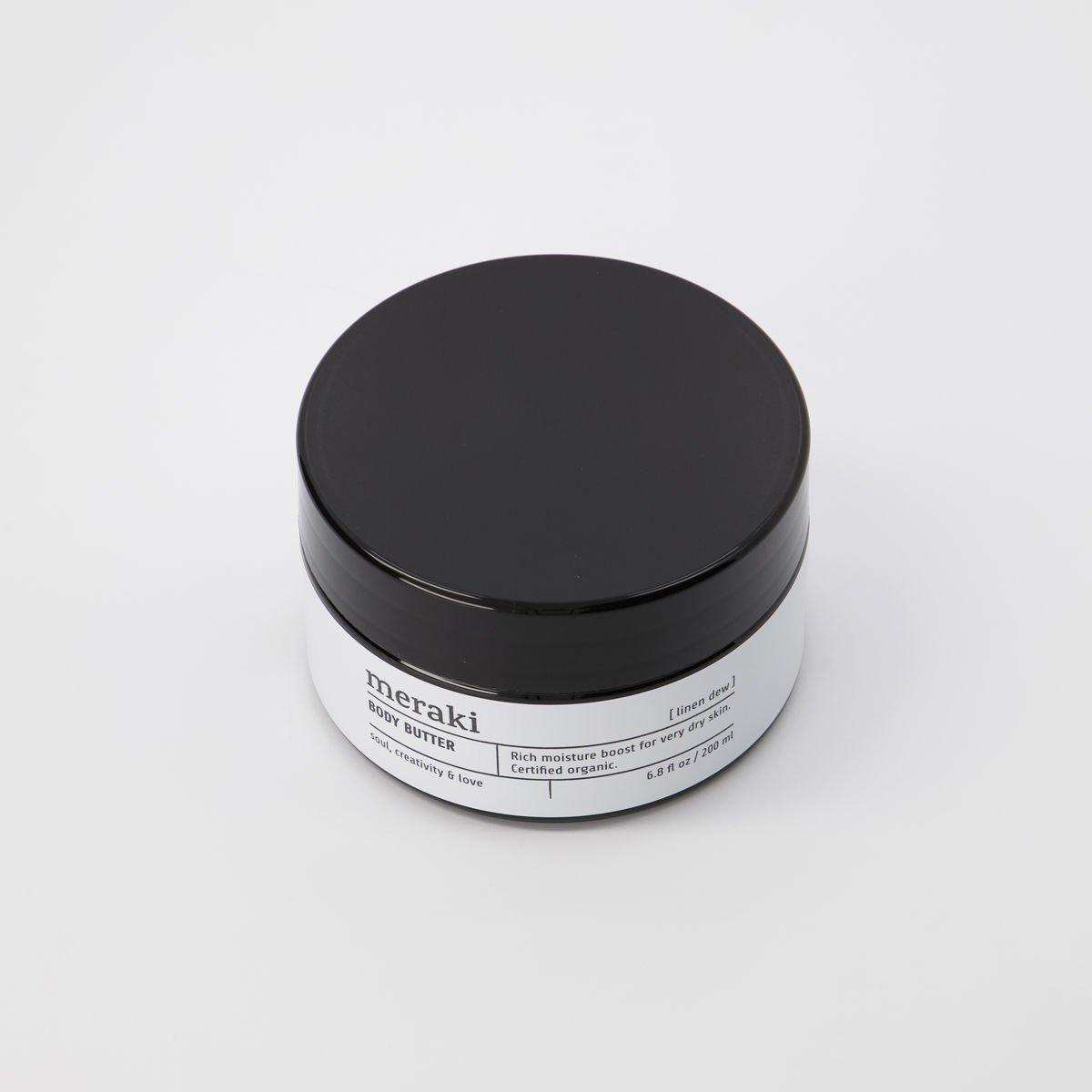 Verwen je huid met de luxe en voedende gecertificeerde biologische body butter van Meraki! Onze body butter is verrijkt met biologische aloë vera, sheabutter en een mix van voedende oliën van olijf, zonnebloem en amandel om de droge huid te verlichten en veel vocht toe te voegen zonder een vettig gevoel achter te laten. De body butter heeft de verfrissende geur van Linen Dew met tonen van pepermunt en patchoeli.