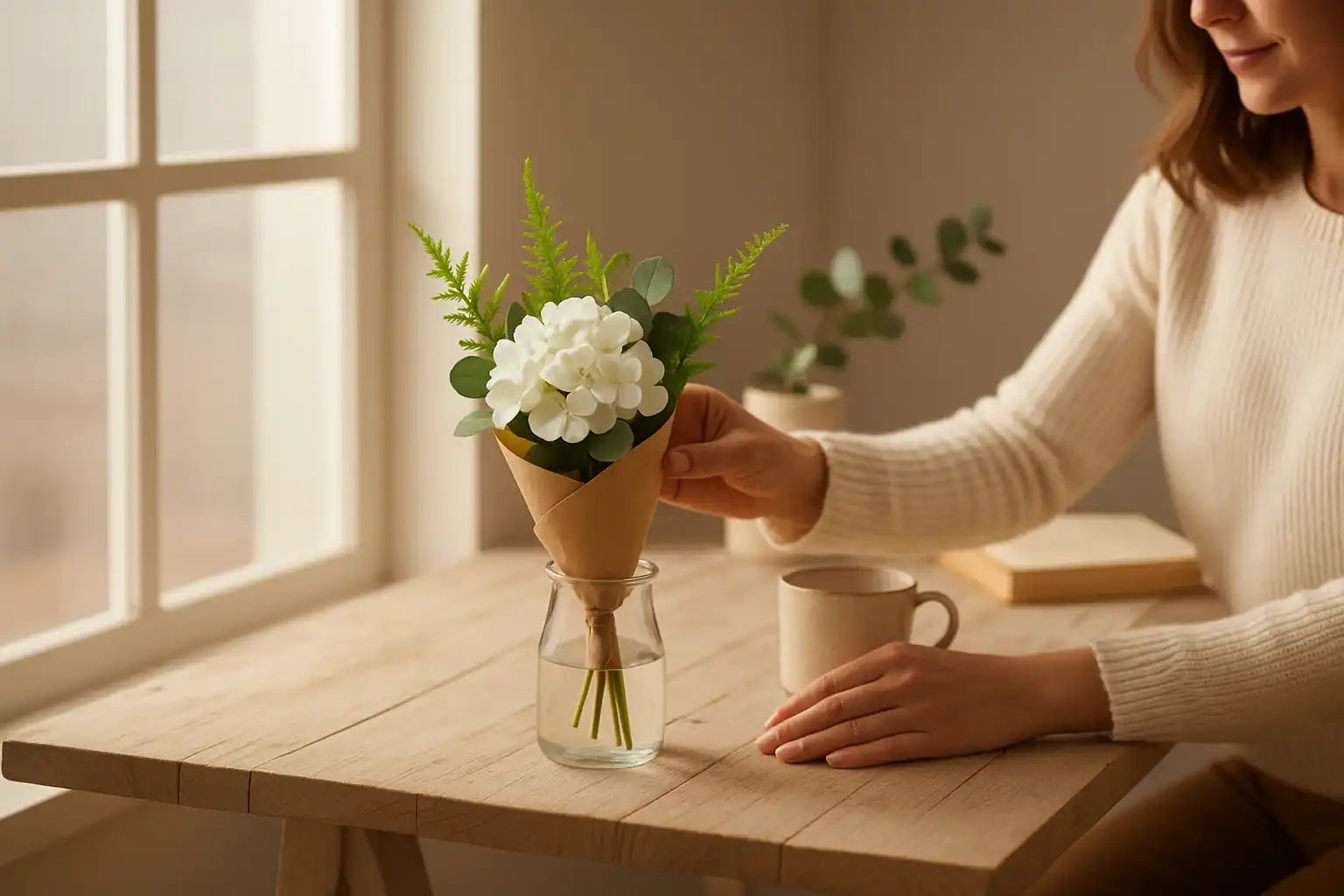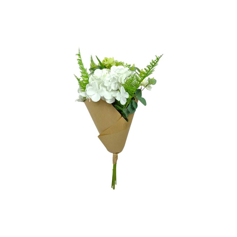 Fris, rustgevend en tijdloos – Boeket ‘Pure Serenity’ is een kunstboeket dat kalmte uitstraalt. De combinatie van witte bloemen, frisgroene varens en eucalyptusblad zorgt voor een natuurlijke en serene uitstraling. Verpakt in stijlvol kraftpapier is dit boeket een prachtig decoratief accent voor elk interieur.