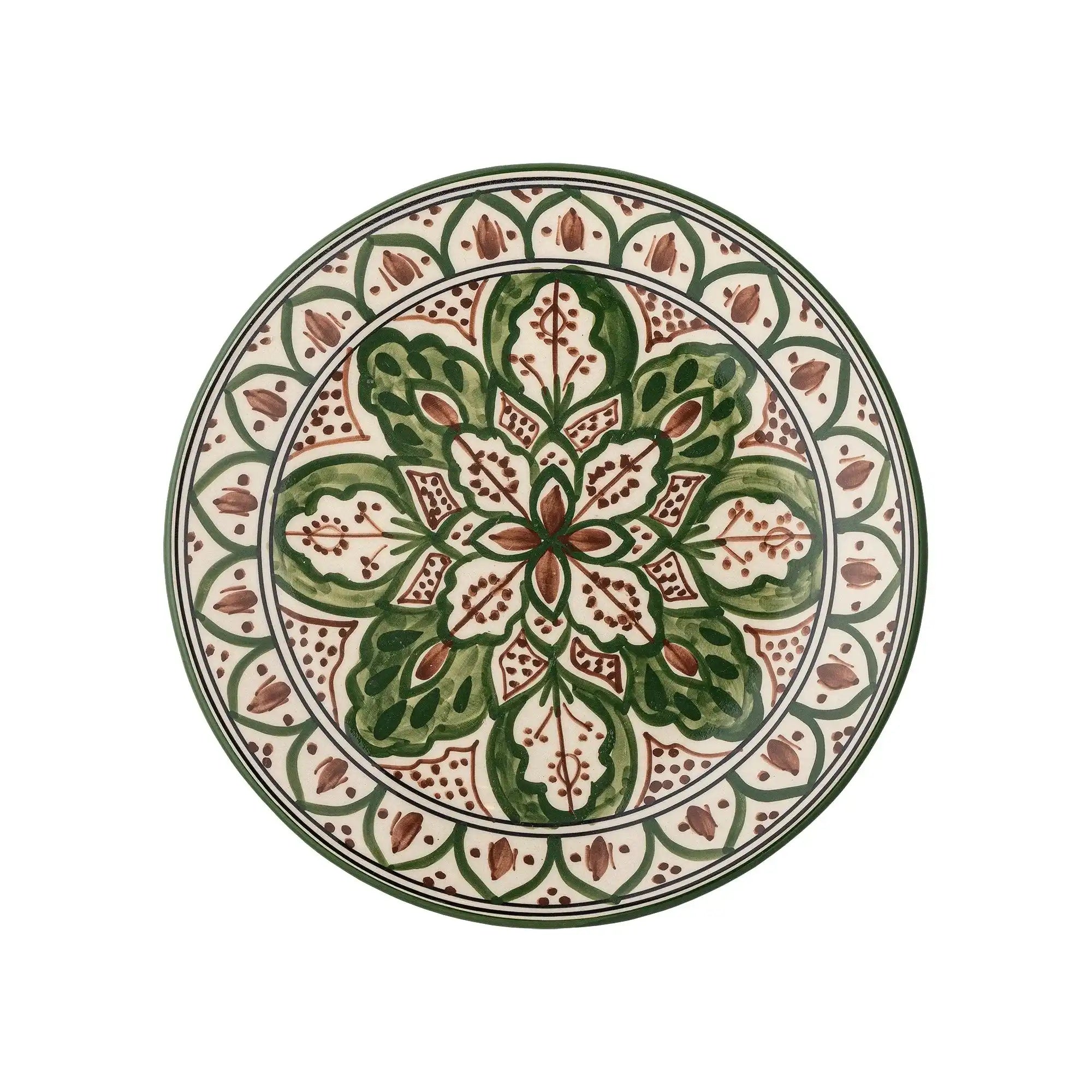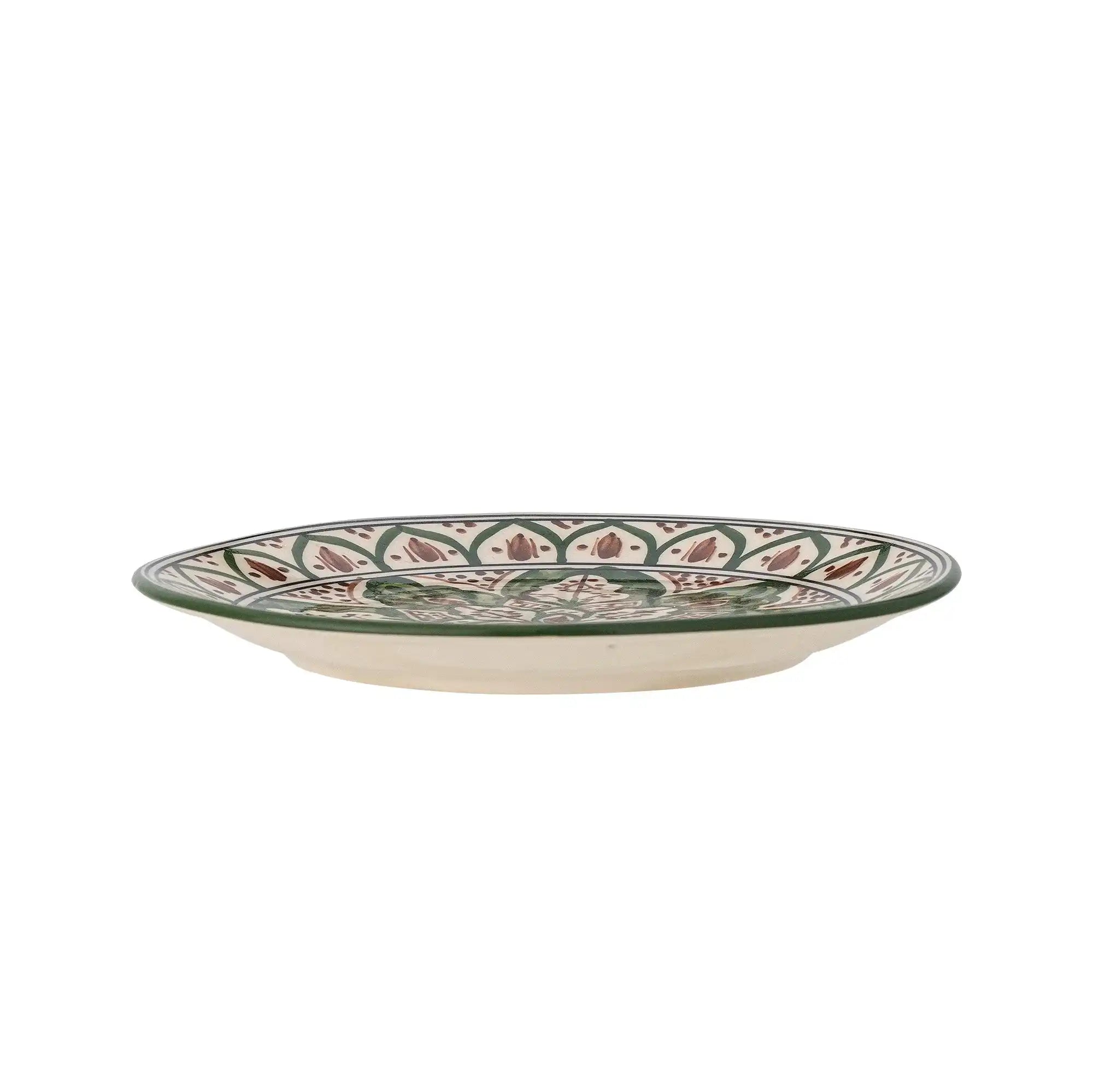 Details & materiaal: Gemaakt van aardewerk en uitgevoerd in een rijke groentint met natuurlijke bruintonen, heeft dit decoratieve lunchbord een handig formaat van ø 19 cm. Het glazuur is met de hand aangebracht, waardoor subtiele variaties in kleur en patroon ontstaan – precies dat detail dat het bord uniek maakt. De zachte overgangen in het glazuur versterken de diepte van het ontwerp en vormen een eerbetoon aan traditionele keramiek, terwijl de maat ideaal is voor sandwiches, salades of een punt taart.