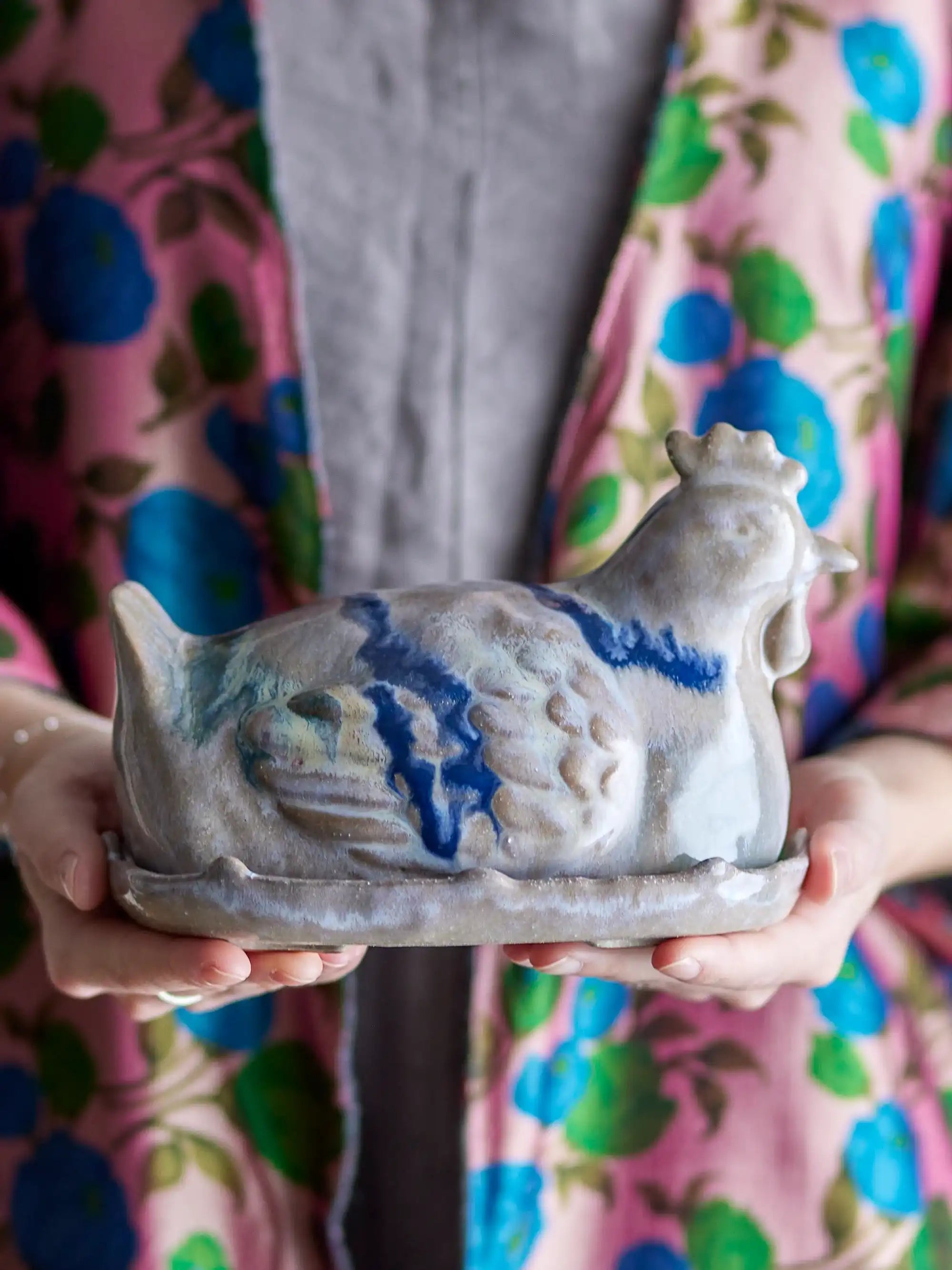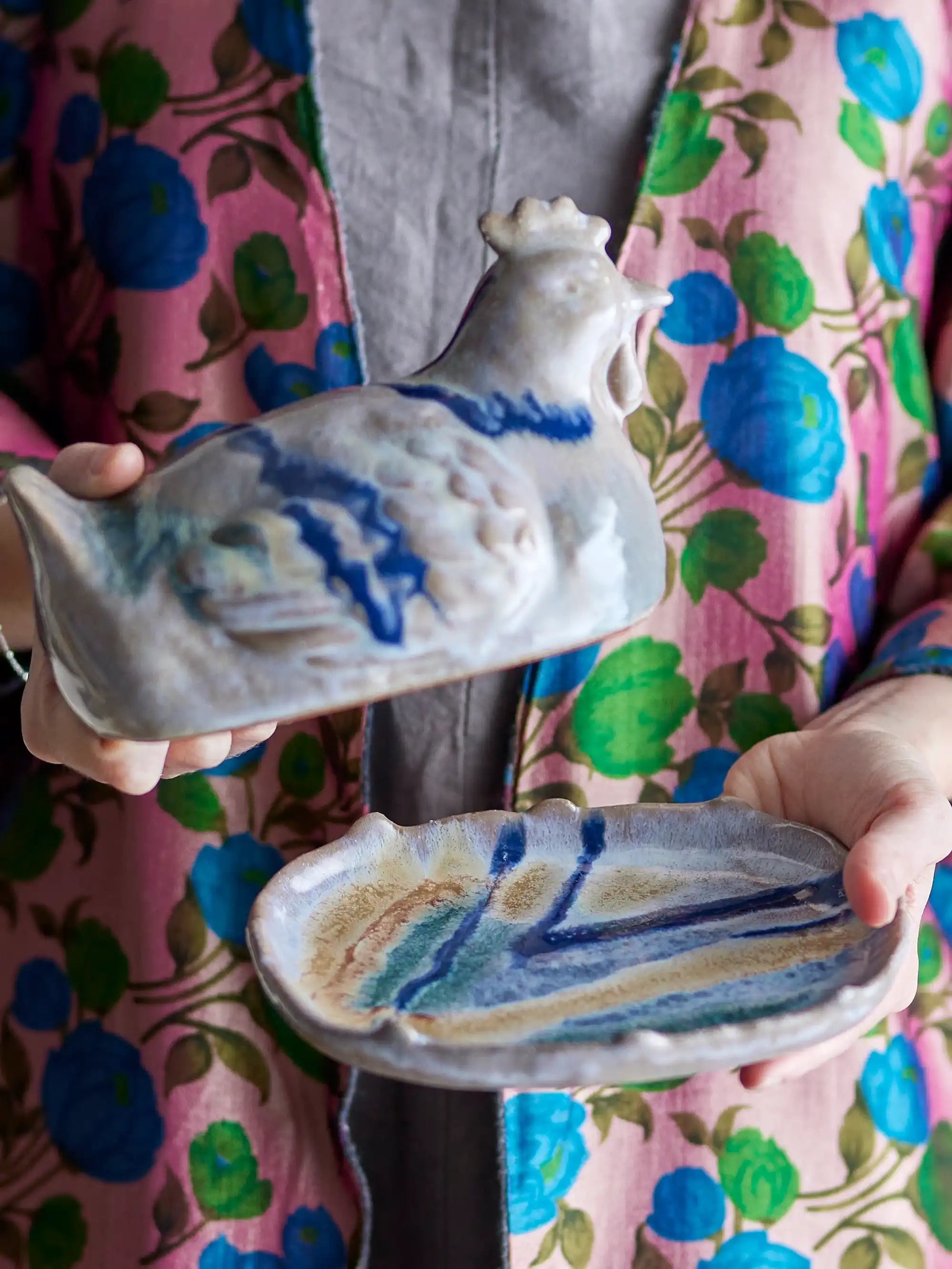 Waarom je de boterdoos van Bloomingville wilt hebben: De Heni boterdoos is een charmante combinatie van functie en karakter. Gemaakt van aardewerk en gevormd als een kip, tovert ze meteen een glimlach op je ontbijttafel. Je bewaart er boter of eitjes in en zet haar zo op tafel; de reactieve glazuur zorgt voor een levendig spel van aardse tinten met subtiele nuances van blauw, roze en groen. Elk exemplaar is uniek, waardoor je een persoonlijk accent toevoegt aan je serviescollectie.