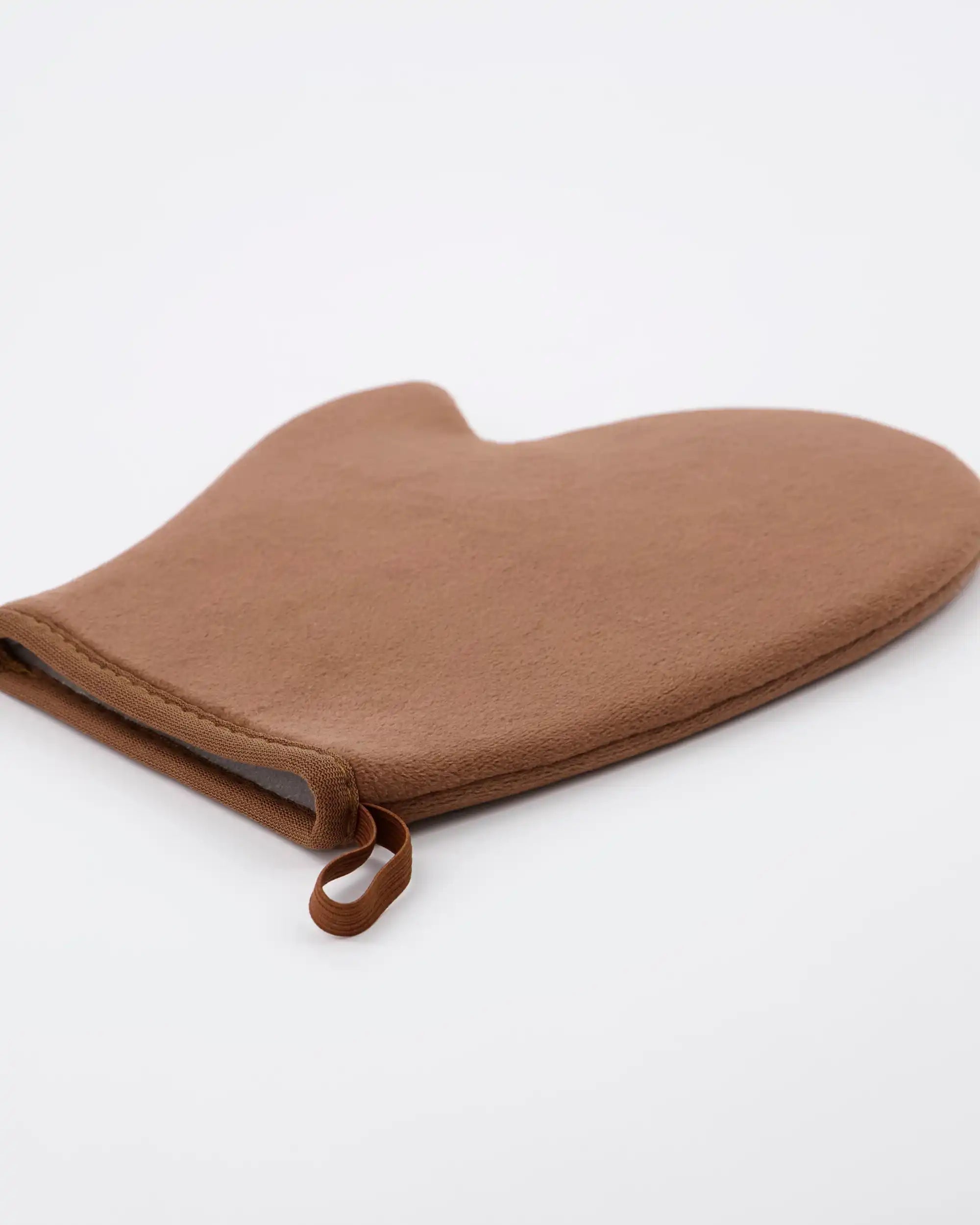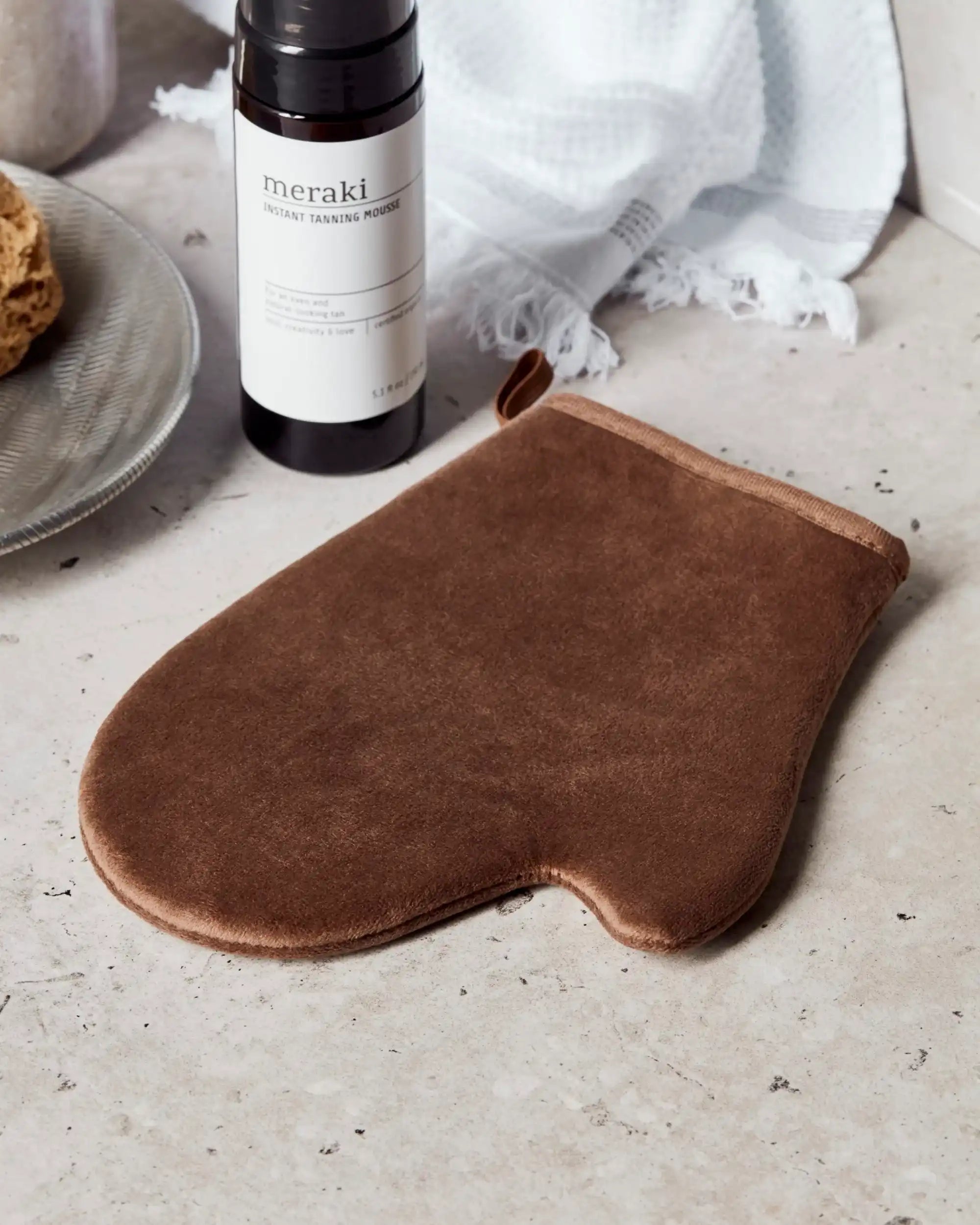 Deze handschoen is uitgevoerd in warmbruin polyester met een fluweelzachte finish. Dankzij het royale formaat van 21 cm lang en 16,5 cm breed past hij comfortabel over de hand en biedt hij voldoende grip tijdens het aanbrengen. Vervaardigd voor gebruik met de Meraki instant bruiningsmousse, maar ook geschikt voor andere producten op moussebasis.