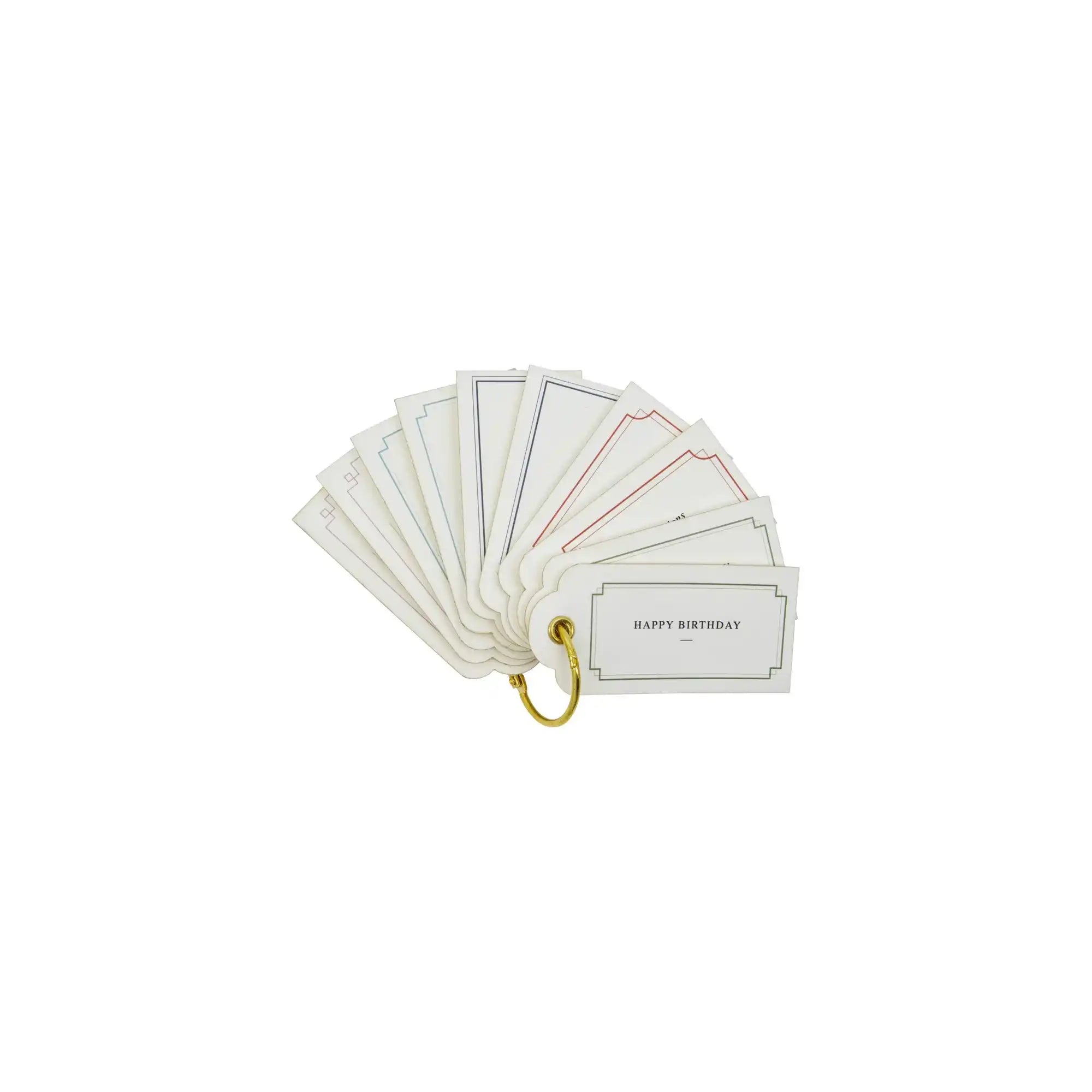 De set bevat 10 labels, zorgvuldig samengesteld in vijf verschillende kleuren: blauw, rood, mosterdgeel, groen en donkerblauw. Ze zijn gemaakt van stevig papier en hebben het ideale formaat van 9 cm lang en 4 cm breed. Dankzij de meegeleverde ijzeren ring blijven ze overzichtelijk bij elkaar, klaar voor gebruik.